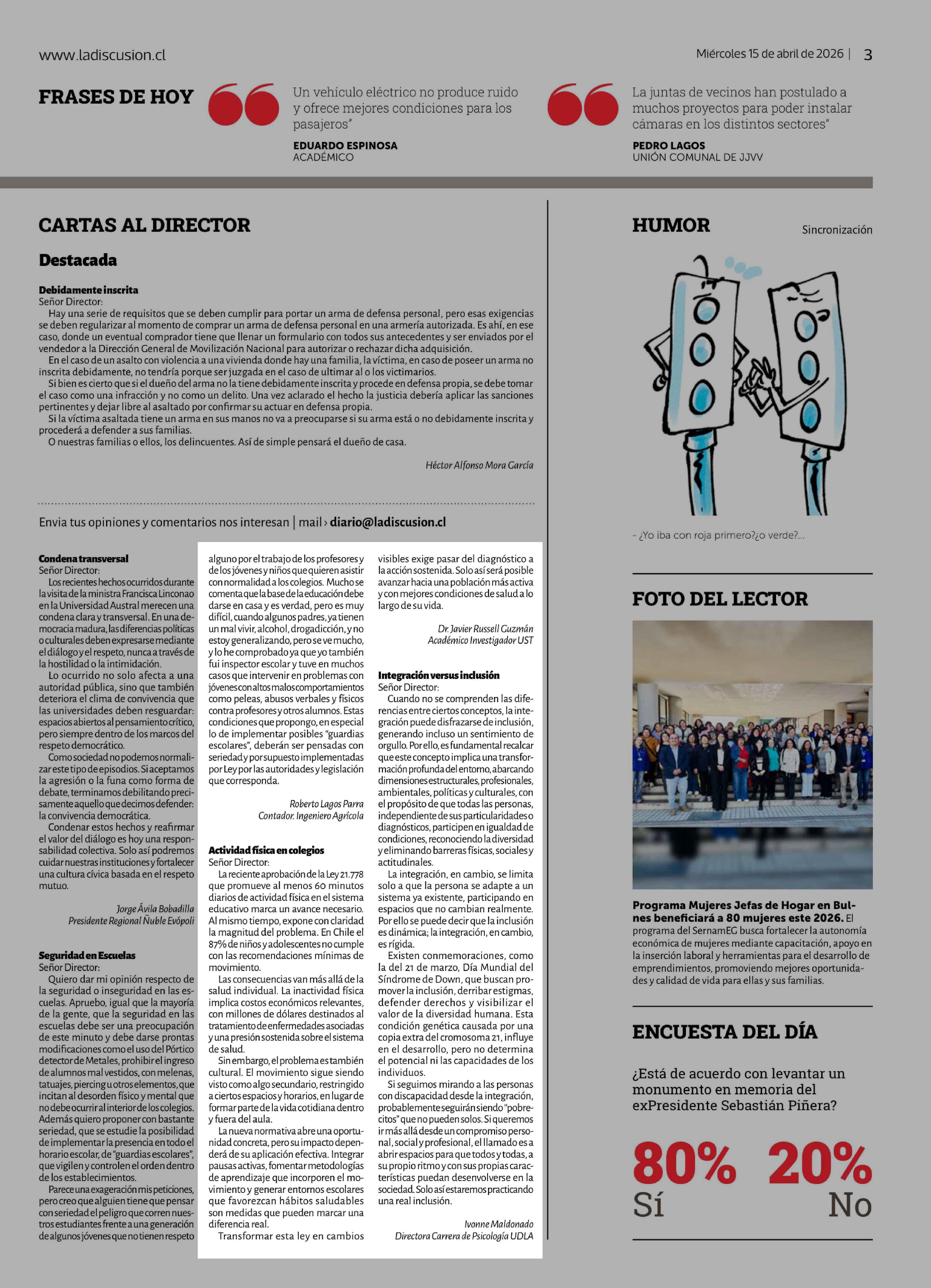 CARTAS: Actividad física en colegios 15-04-2026 La Discusión |