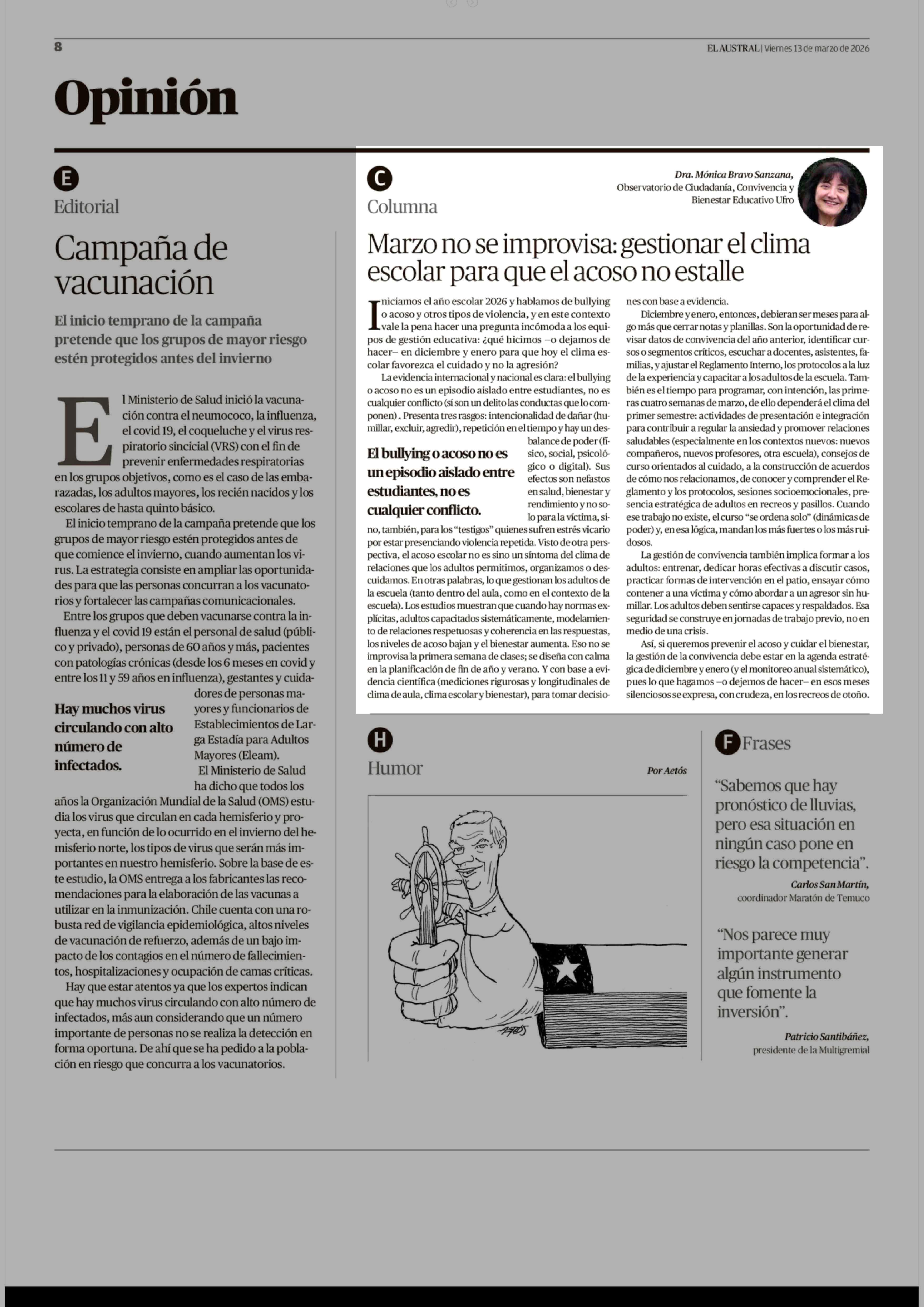 Columnas de Opinión: Marzo no se improvisa: gestionar el clima escolar para que el acoso no estalle 13-03-2026 El Austral de la Araucanía |