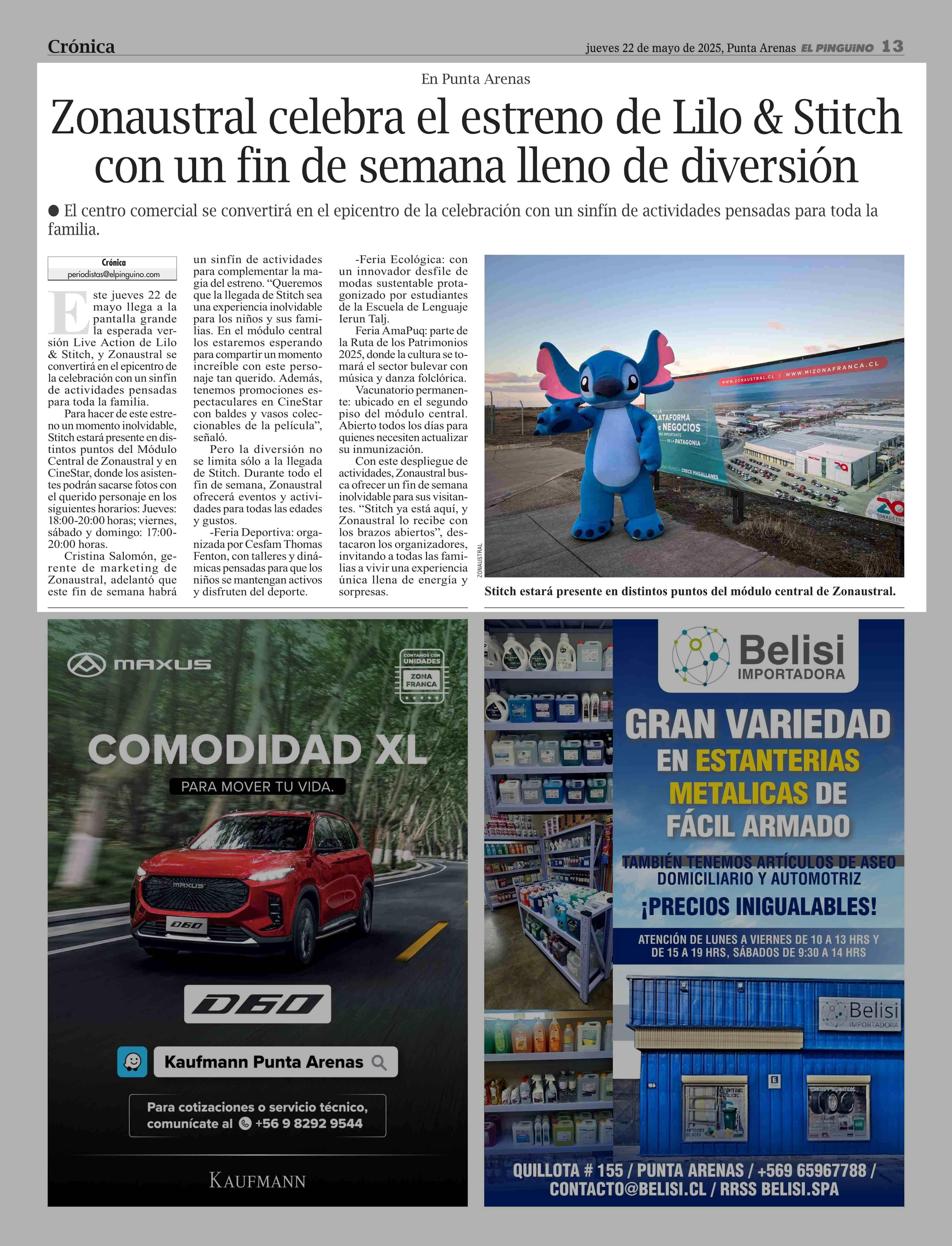 Zonaustral celebra el estreno de Lilo & Stitch con un fin de semana lleno de diversión 22-05-2025 El Pingüino |