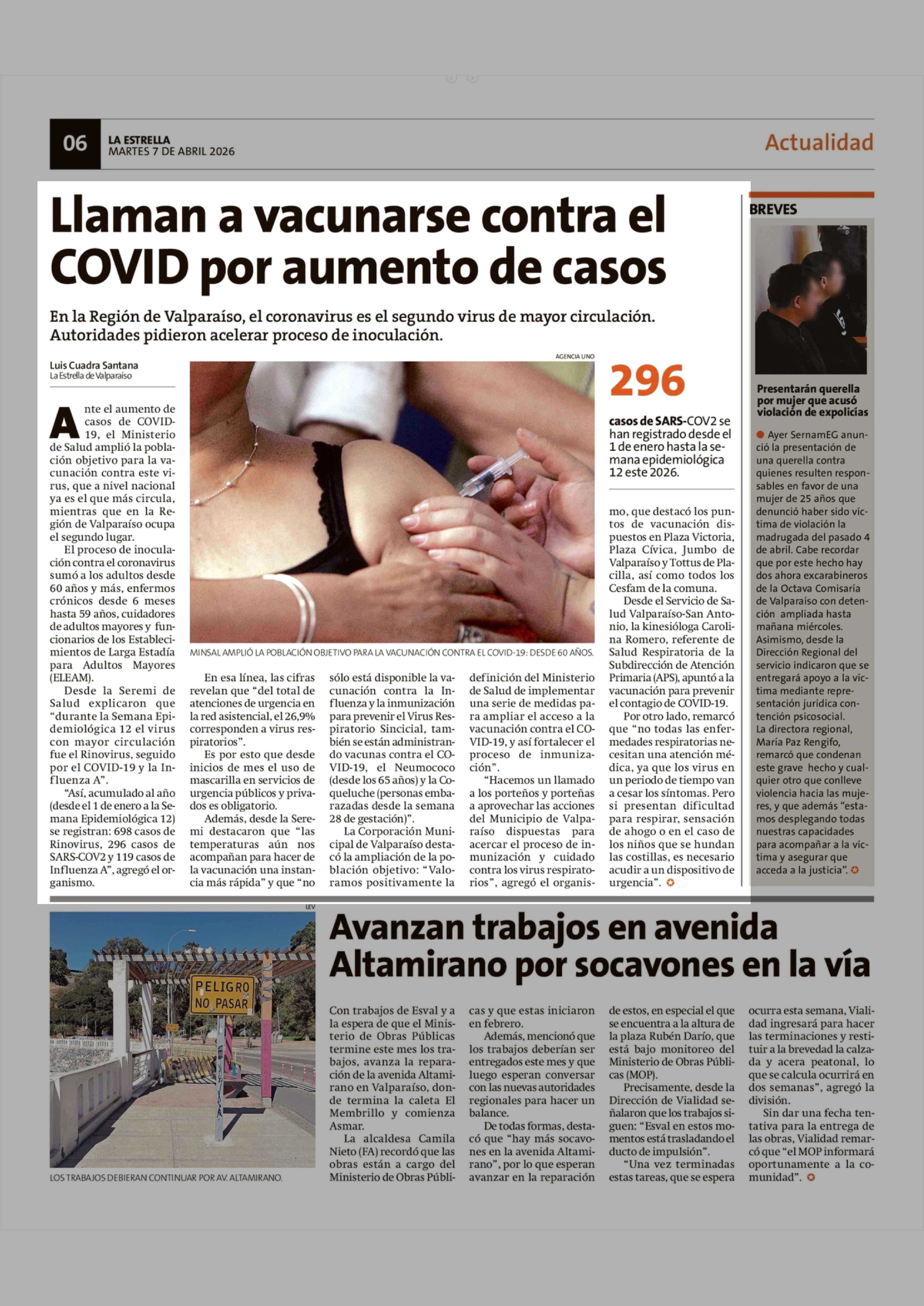 Llaman a vacunarse contra el COVID por aumento de casos 07-04-2026 La Estrella de Valparaíso |