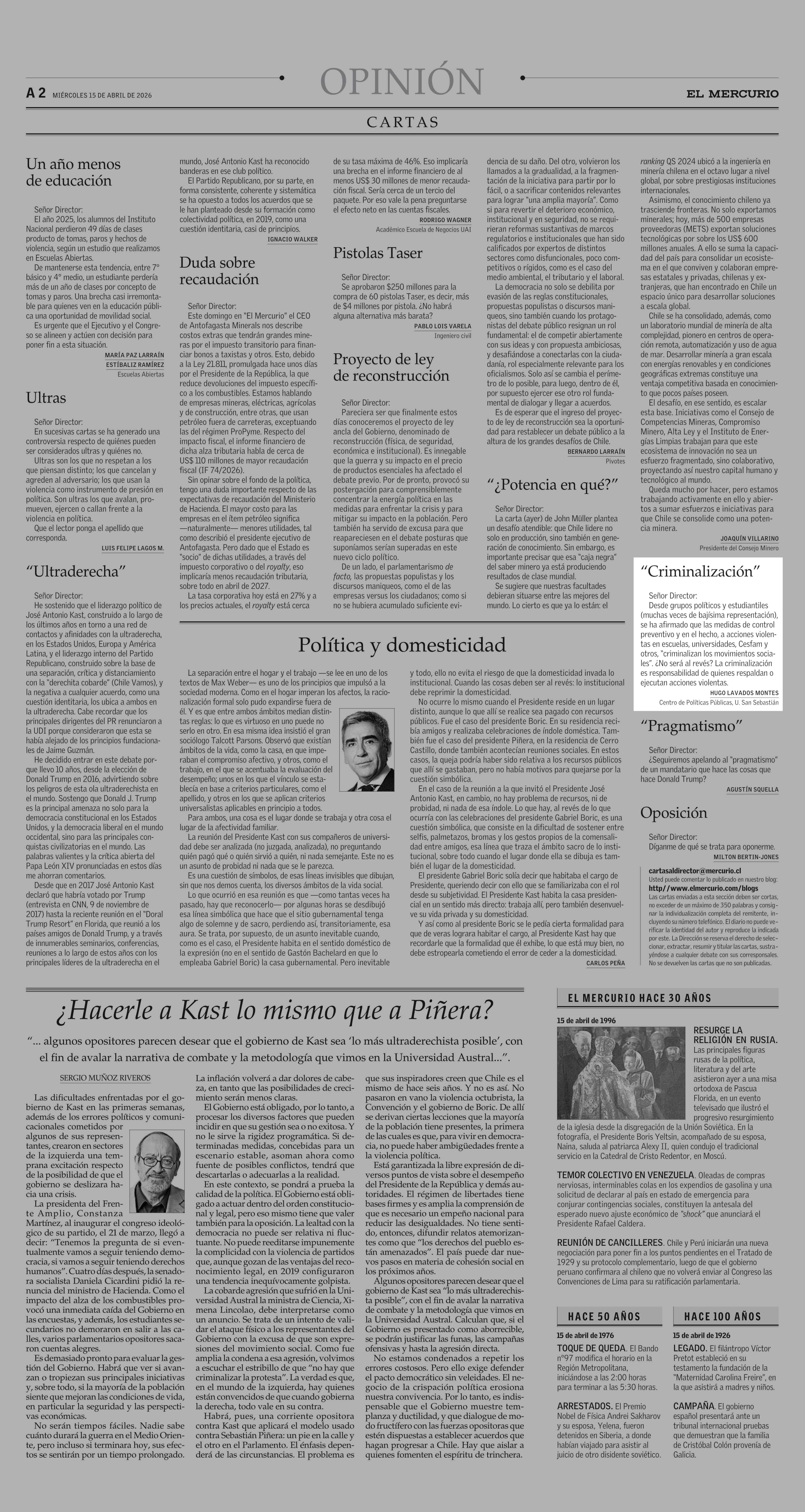 Cartas: “Criminalización” 15-04-2026 El Mercurio |