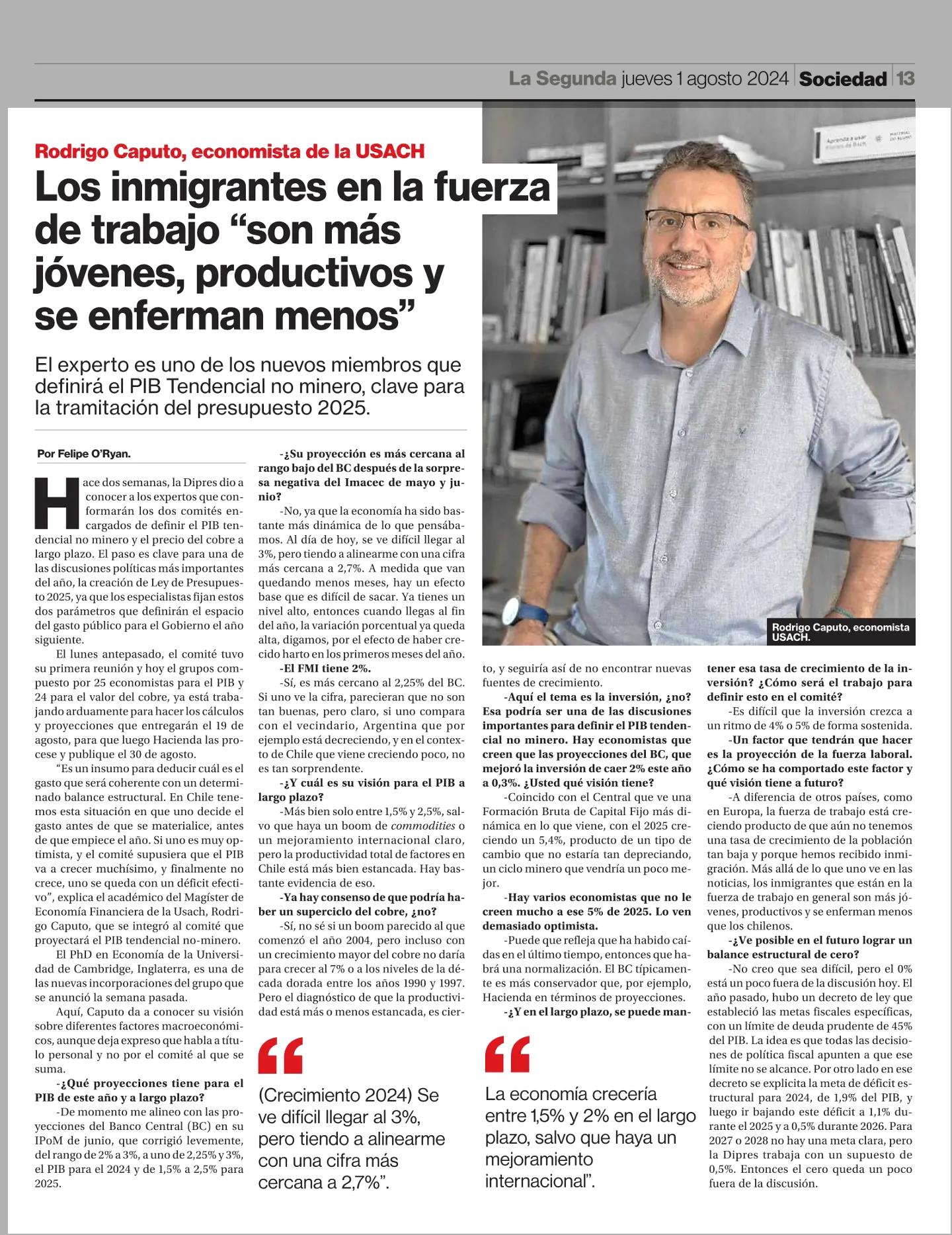 Los inmigrantes en la fuerza de trabajo “son más jóvenes, productivos y se enferman menos” 01-08-2024 La Segunda |
