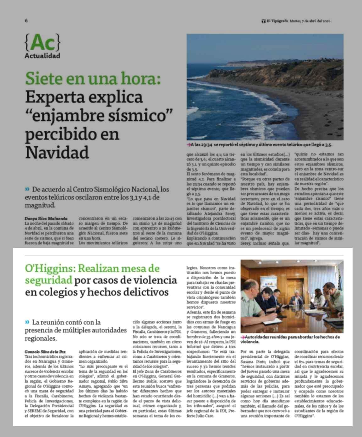 O'Higgins: Realizan mesa de seguridad por casos de violencia en colegios y hechos delictivos 07-04-2026 El Tipógrafo |