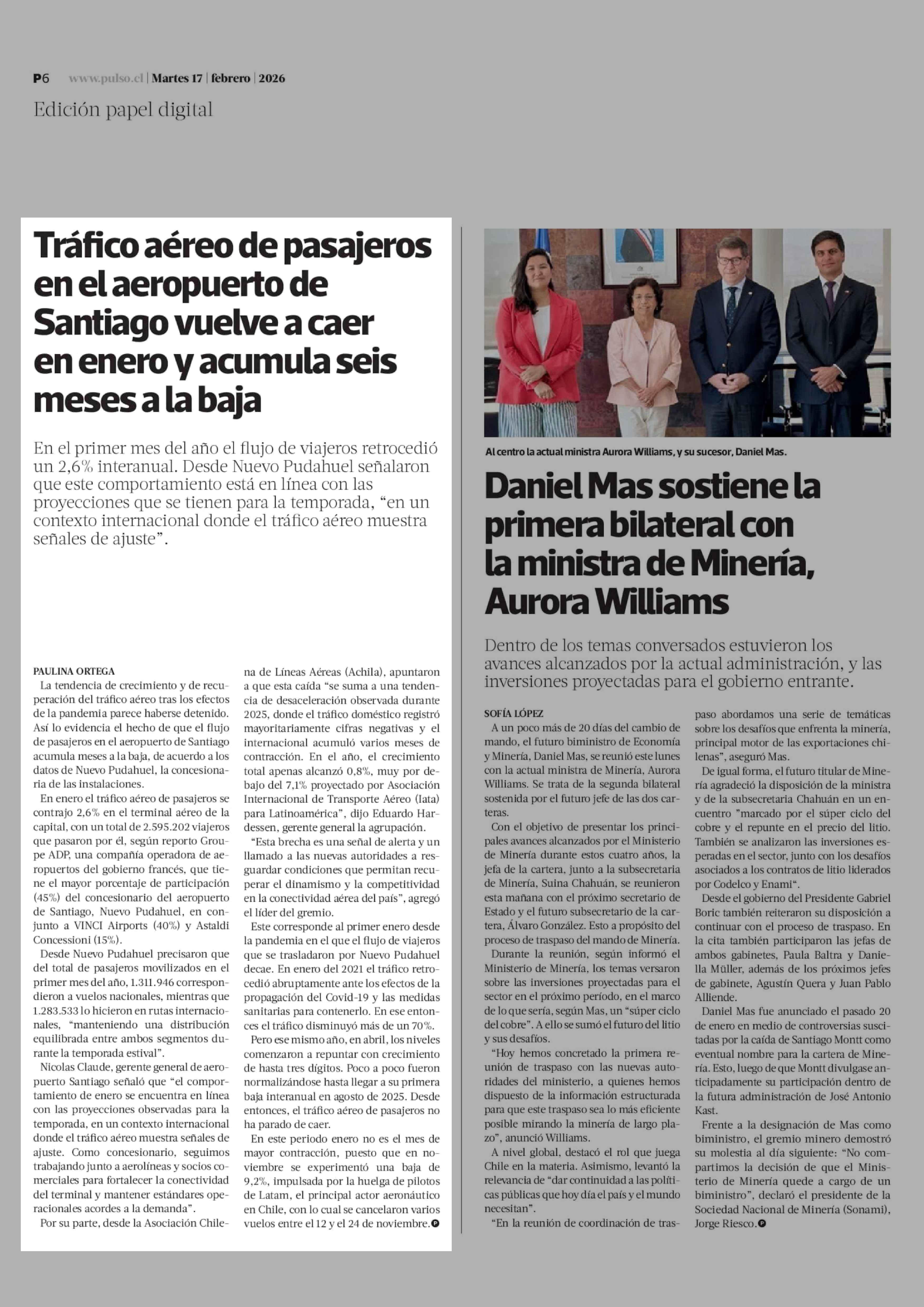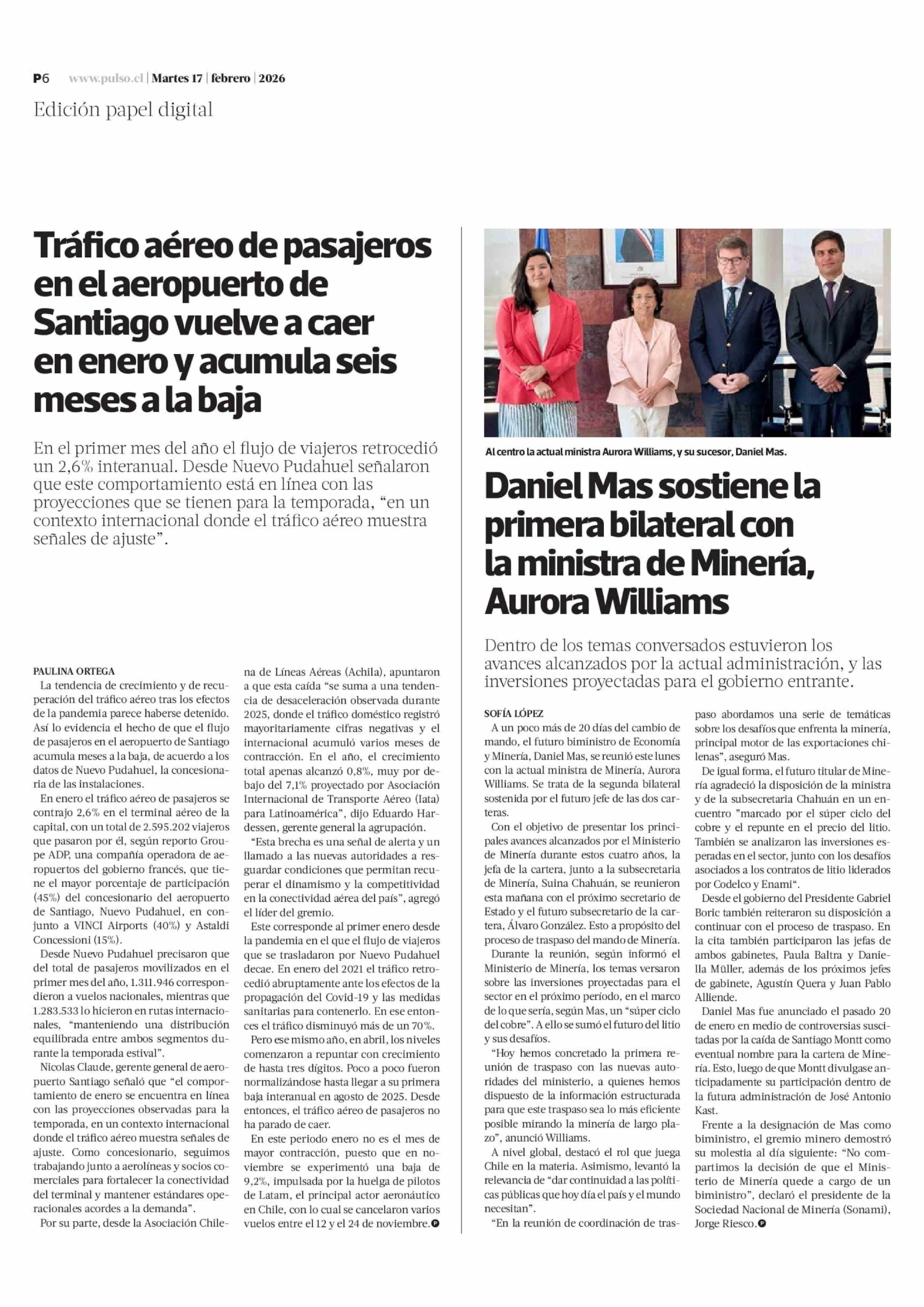 Tráfico aéreo de pasajeros en el aeropuerto de Santiago vuelve a caer en enero y acumula seis meses a la baja 17-02-2026 La Tercera |