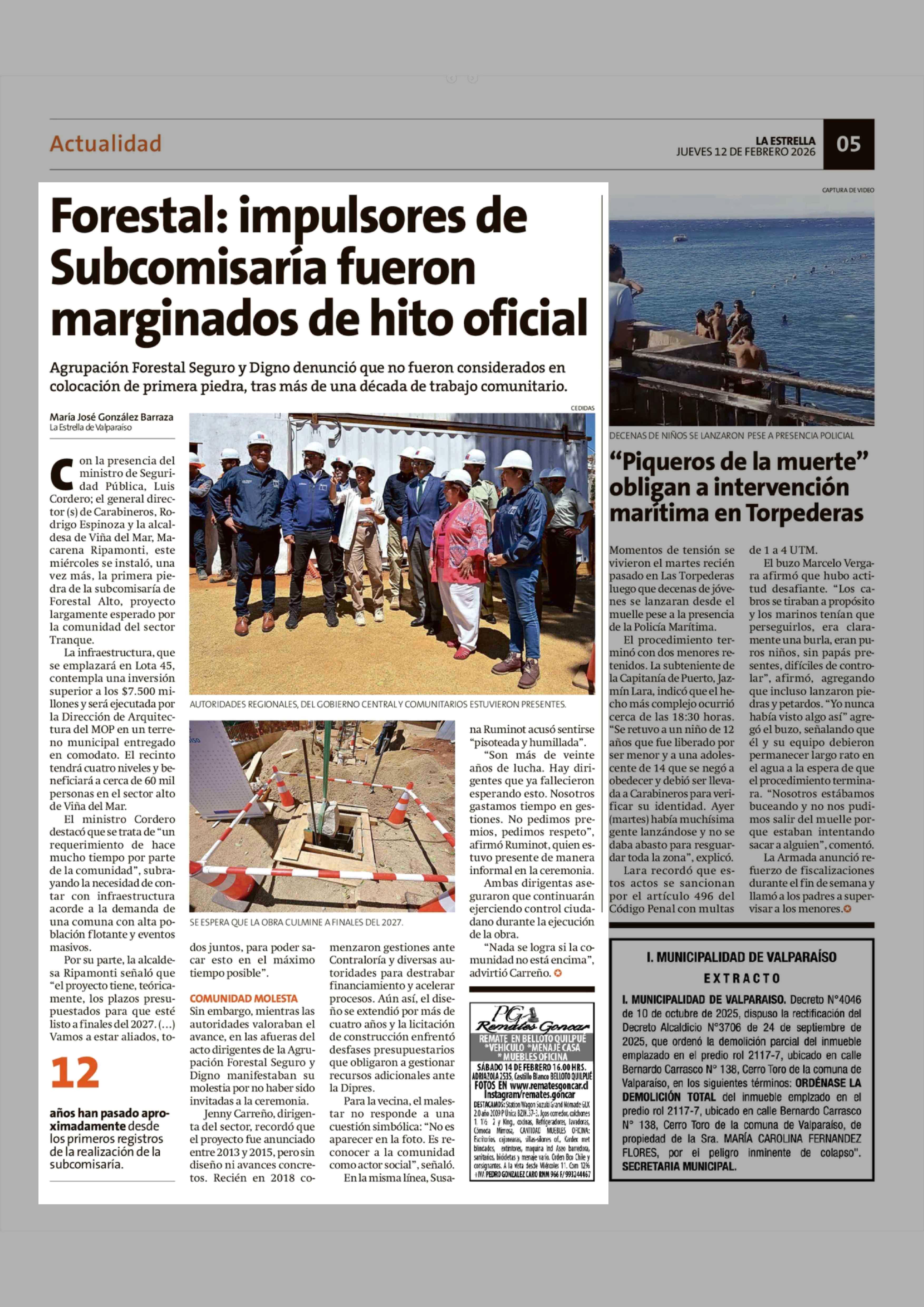 Forestal: impulsores de Subcomisaría fueron marginados de hito oficial 12-02-2026 La Estrella de Valparaíso |