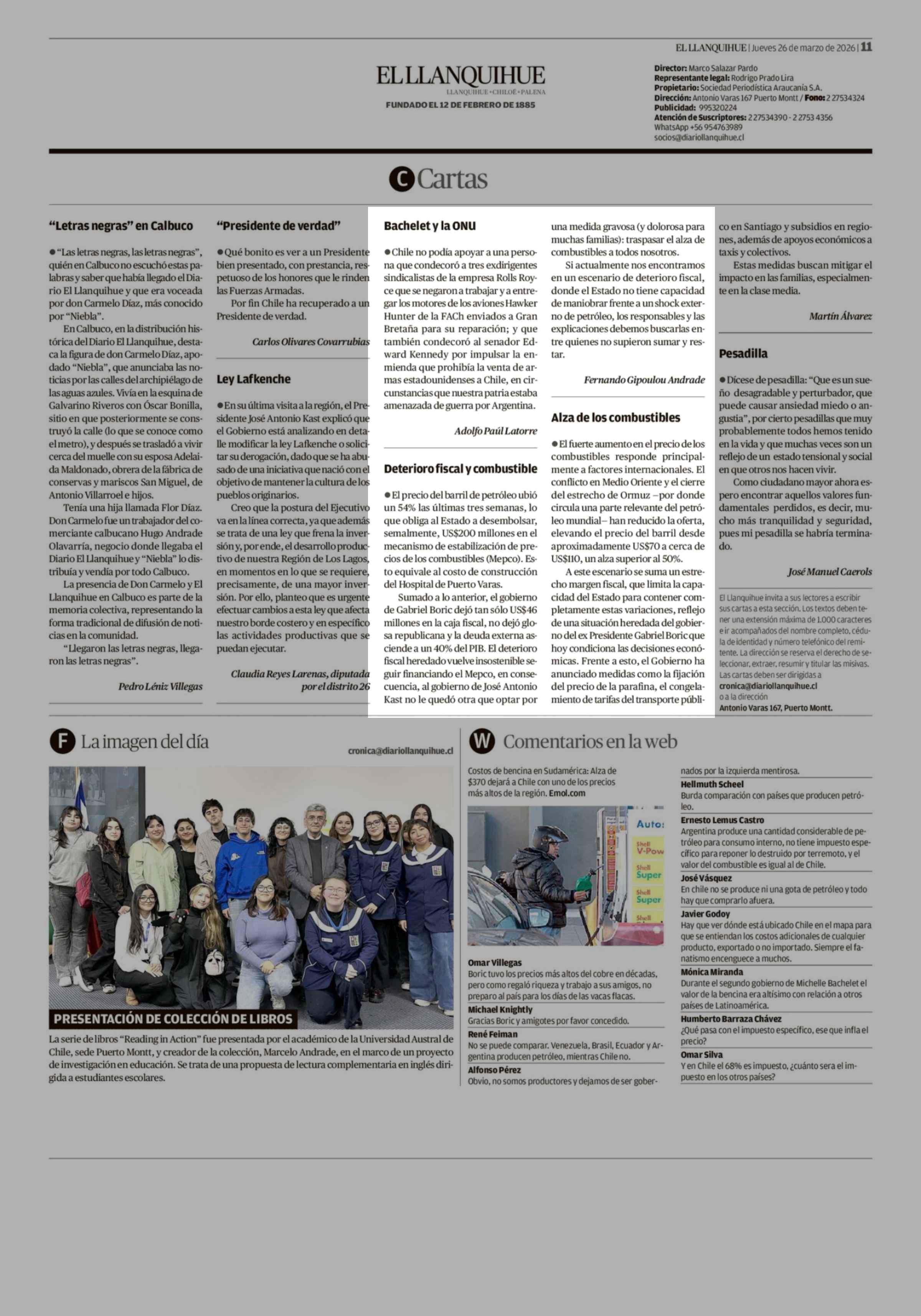 Cartas: Deterioro fiscal y combustible 26-03-2026 El Llanquihue |