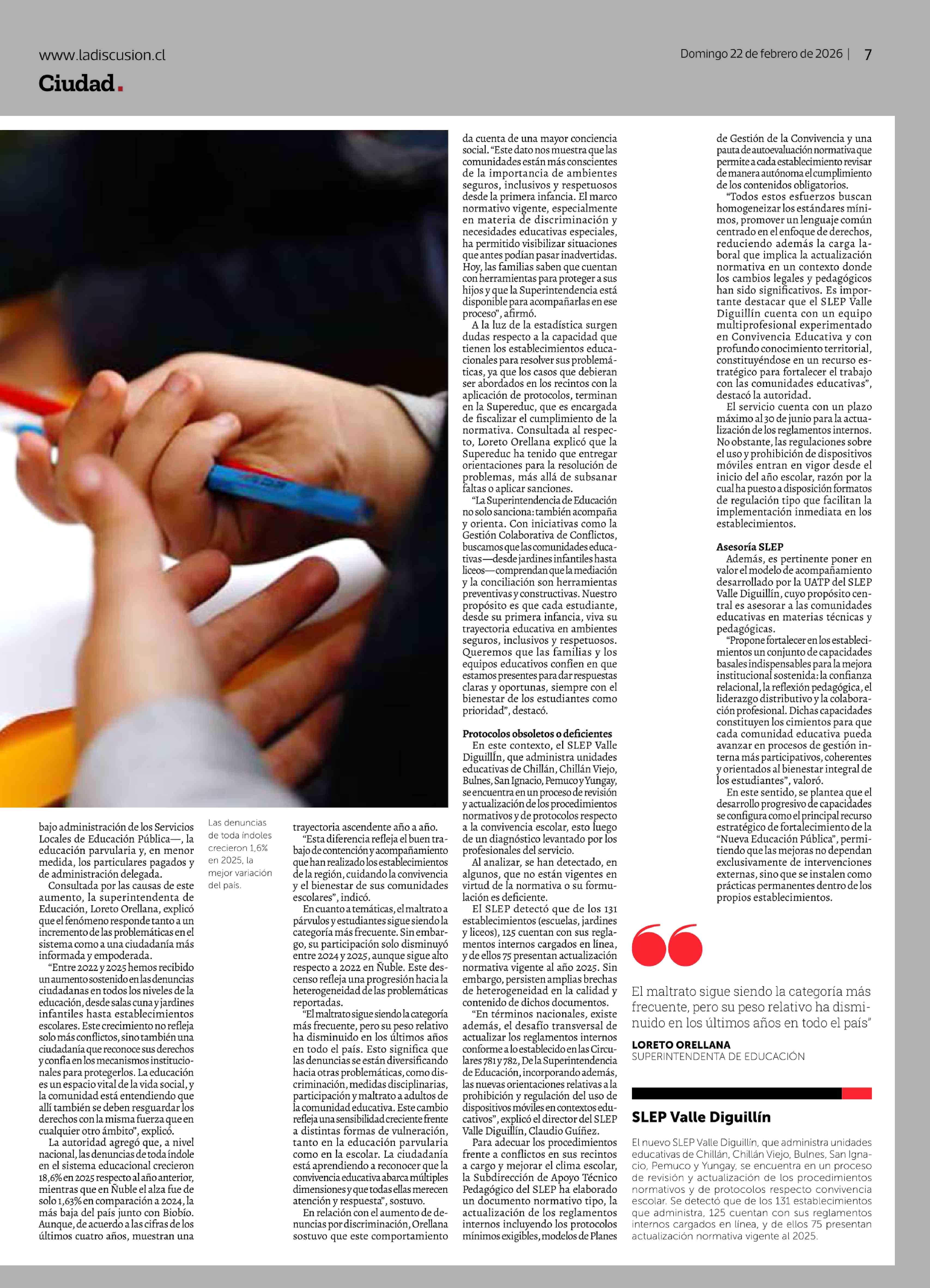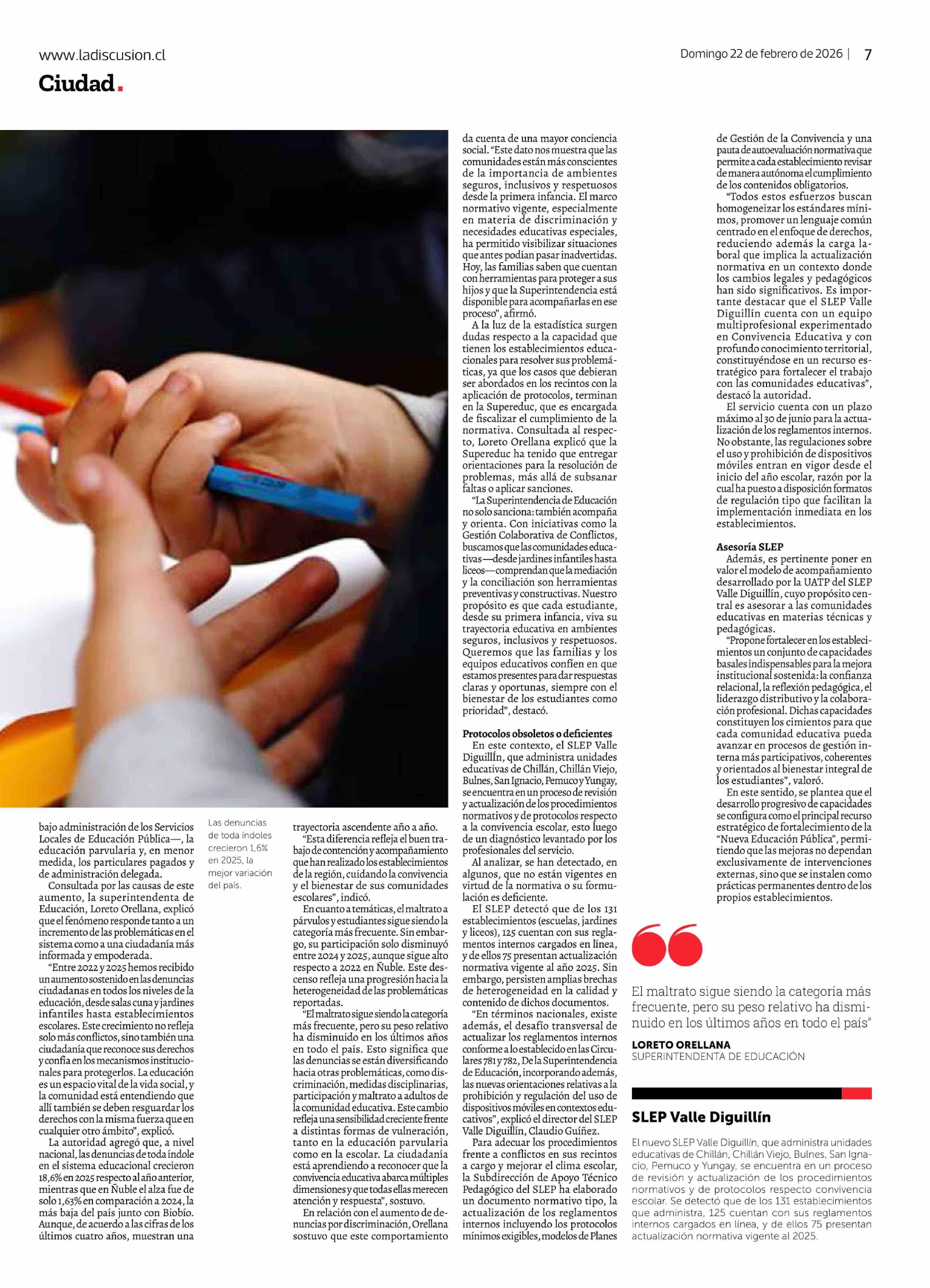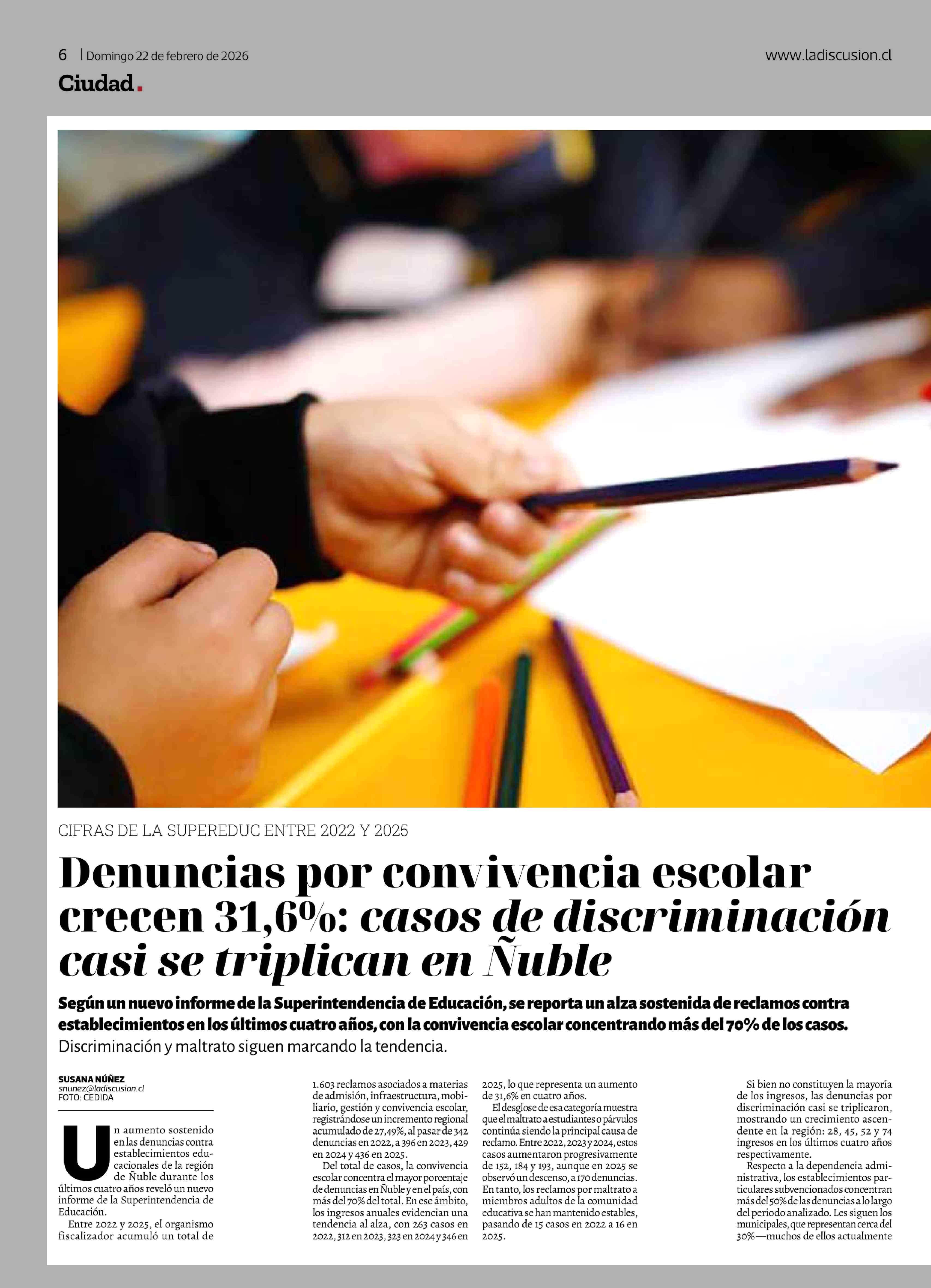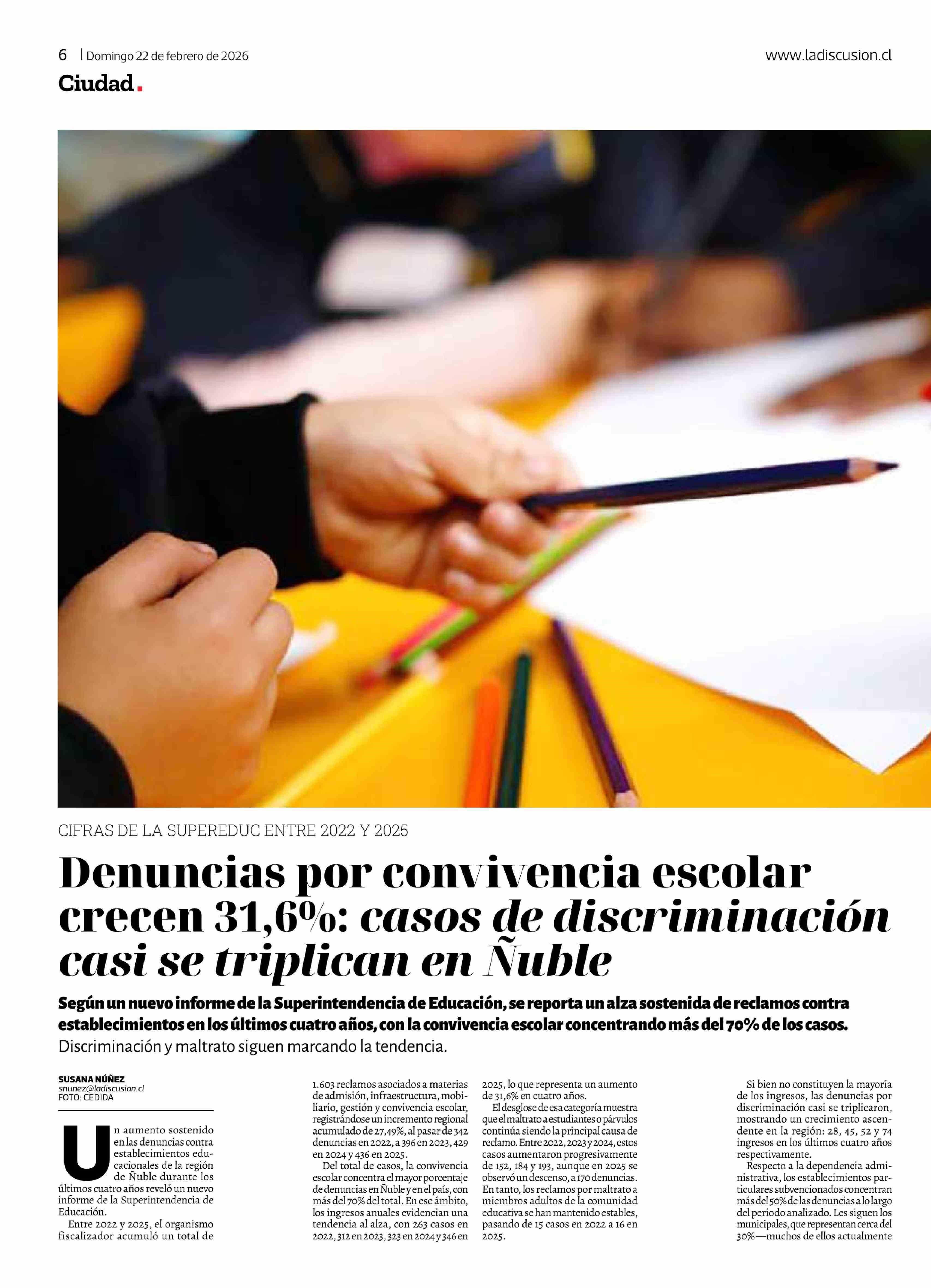 Denuncias por convivencia escolar crecen 31,6%: casos de discriminación casi se triplican en Ñuble 22-02-2026 La Discusión |