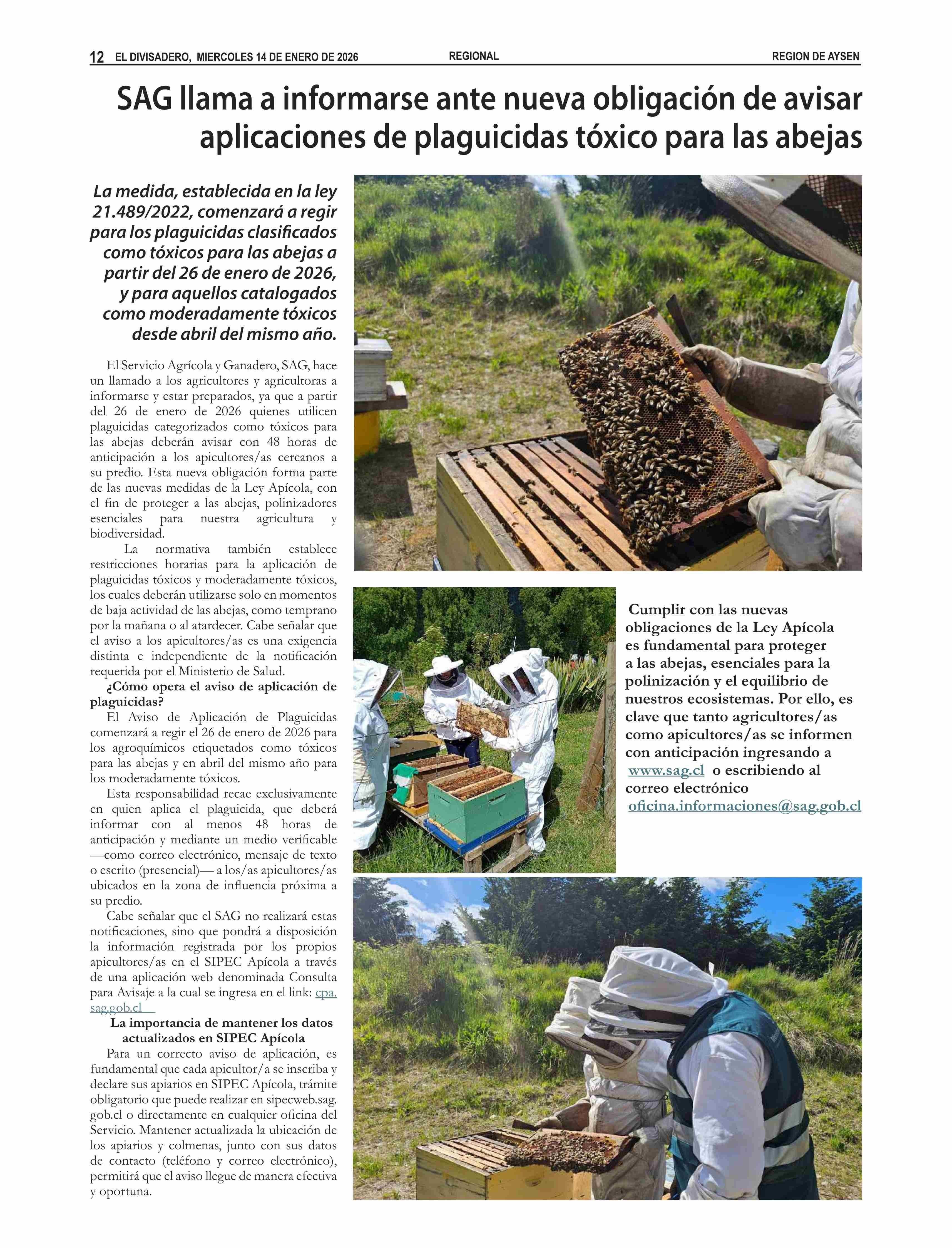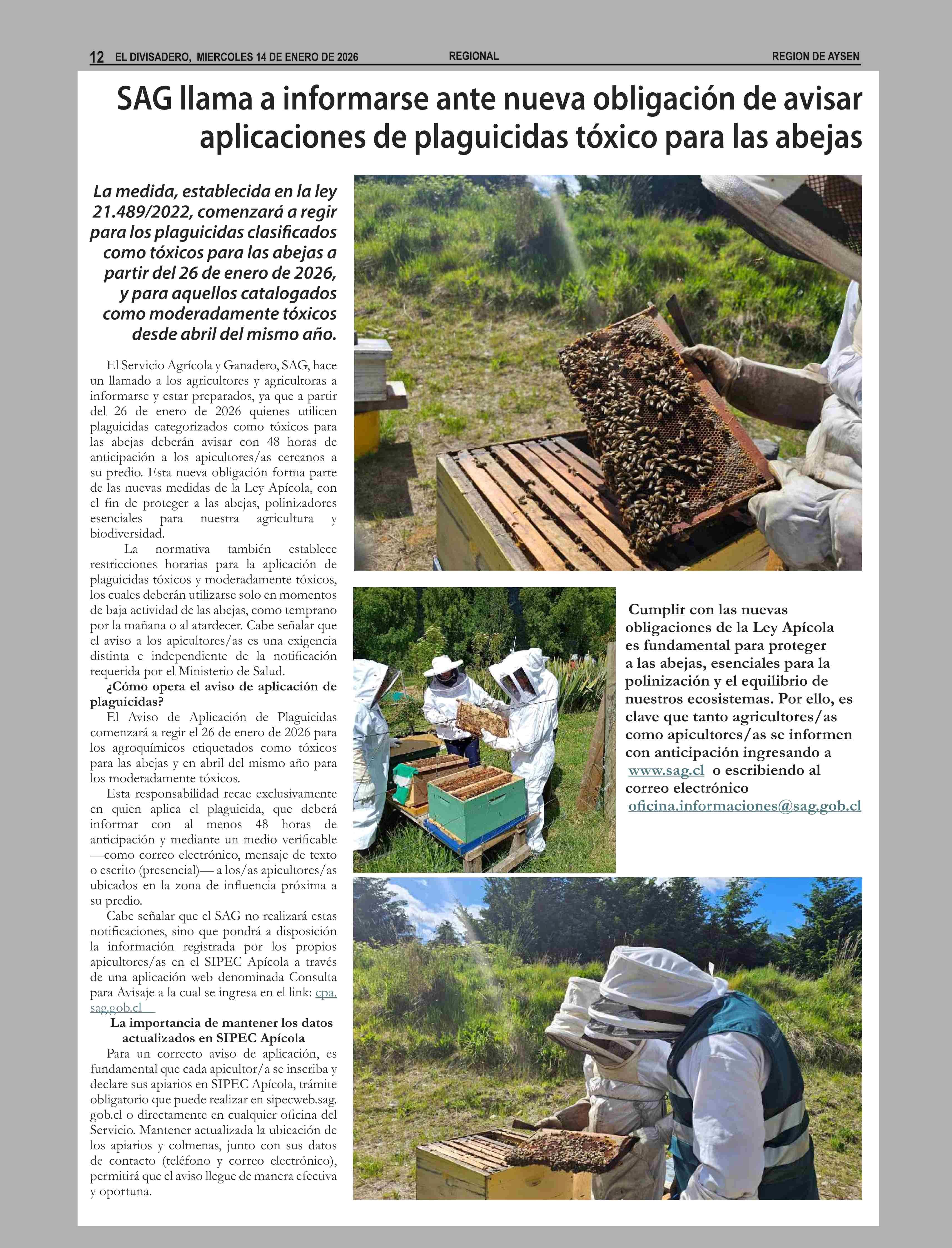 SAG llama a informarse ante nueva obligación de avisar aplicaciones de plaguicidas tóxico para las abejas 14-01-2026 El Divisadero |