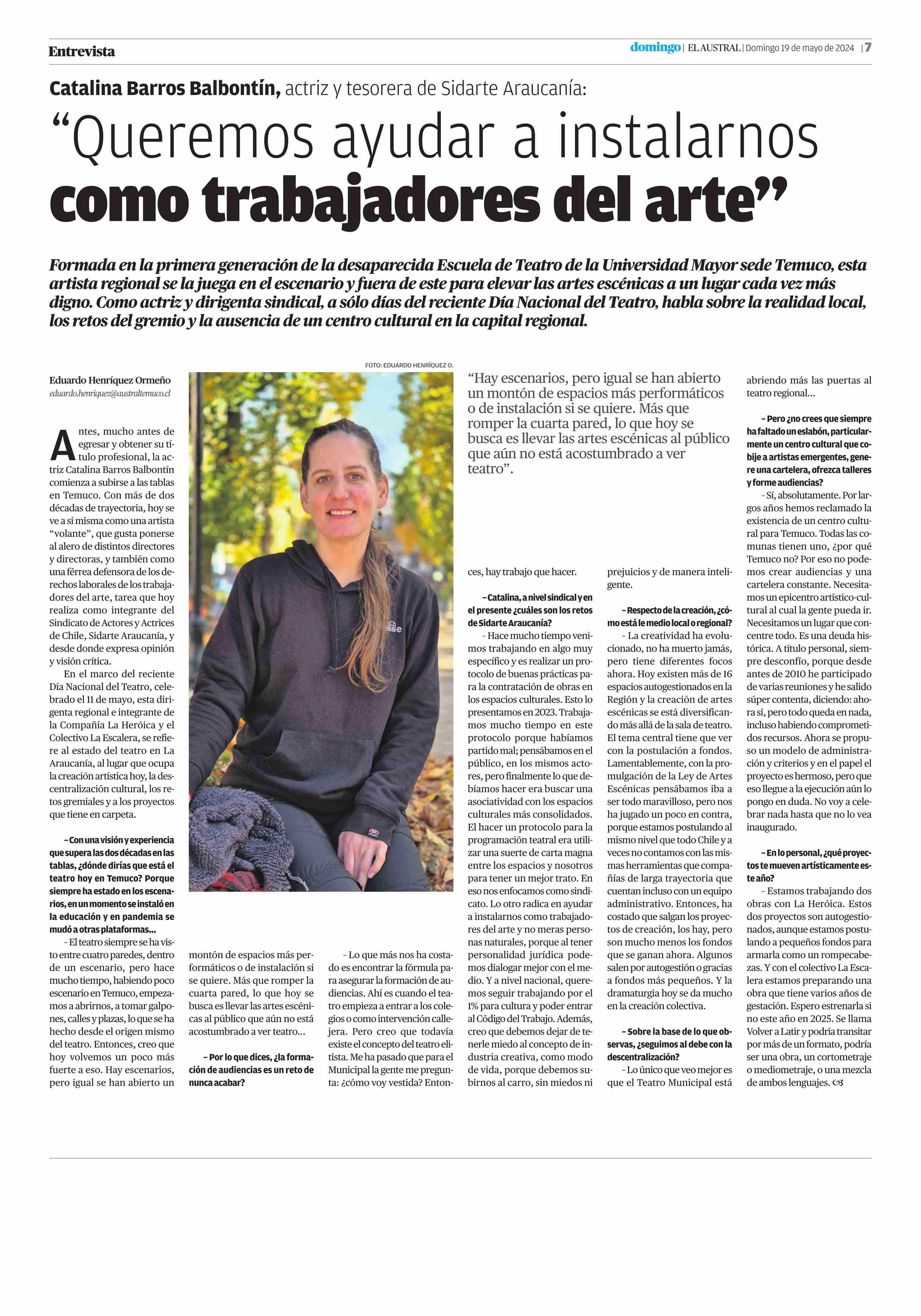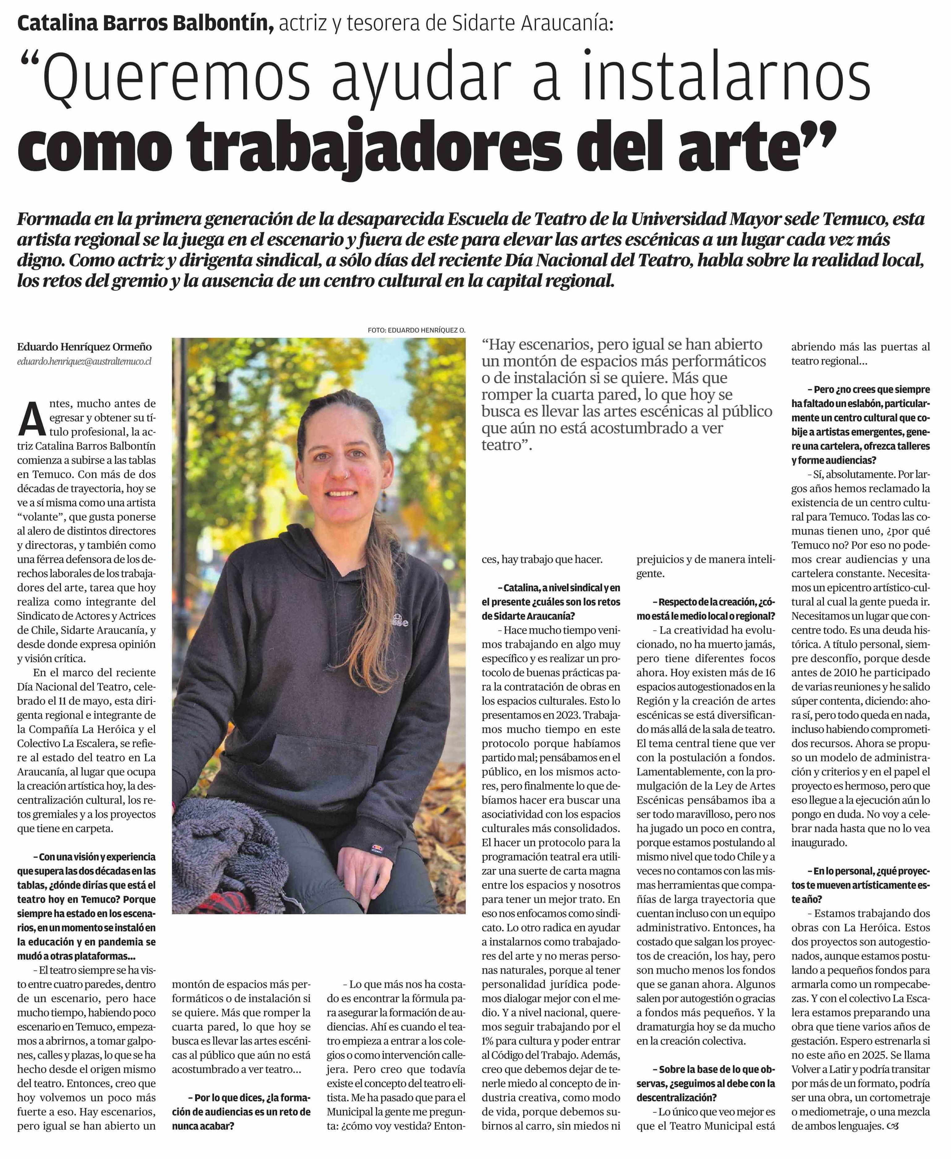 "Queremos ayudar a instalarnos como trabajadores del arte" 19-05-2024 El Austral de la Araucanía |