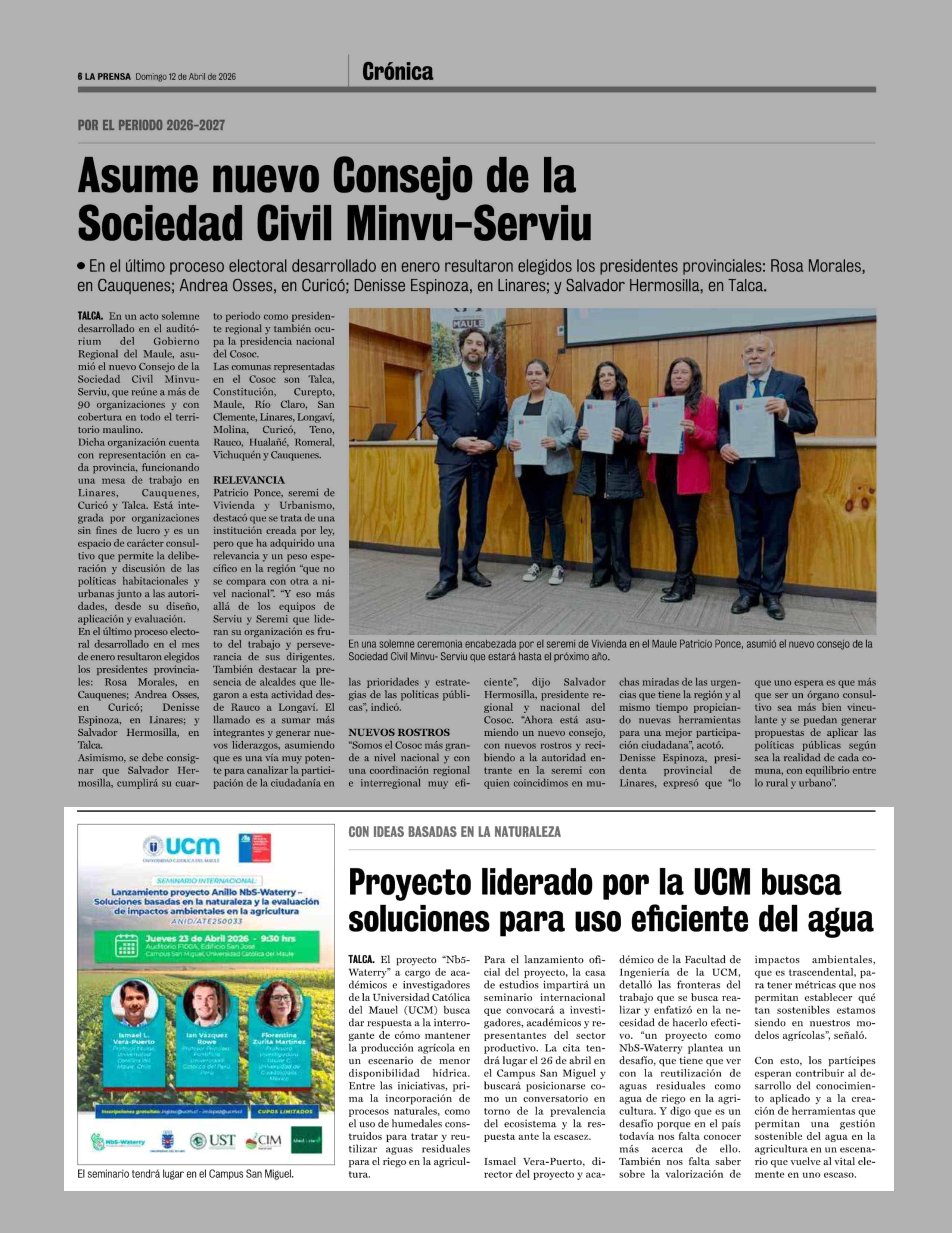 Proyecto liderado por la UCM busca soluciones para uso eficiente del agua 12-04-2026 La Prensa de Curicó |
