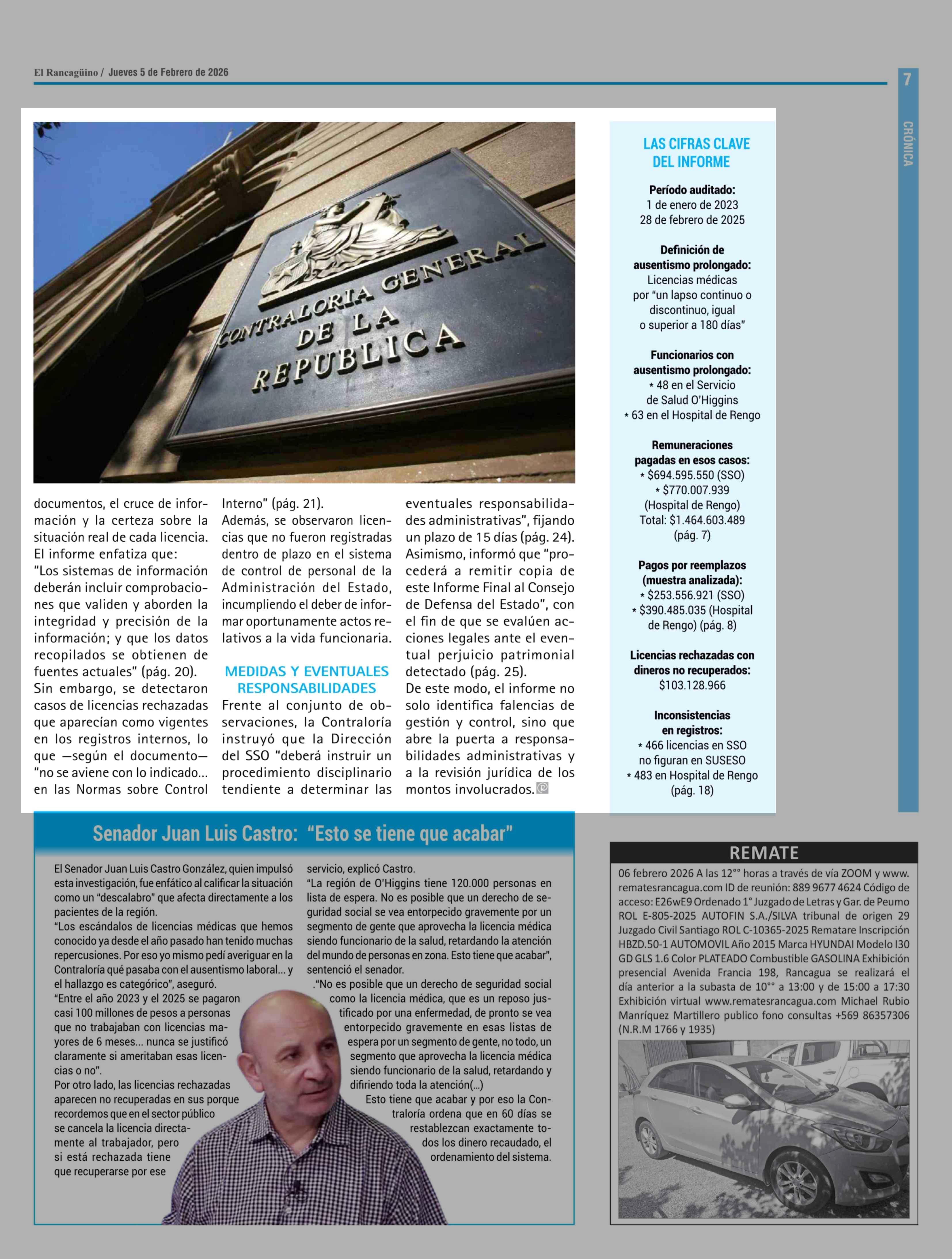 Contraloría detecta millonario impacto por ausentismo en Salud O'Higgins 05-02-2026 El Rancagüino |
