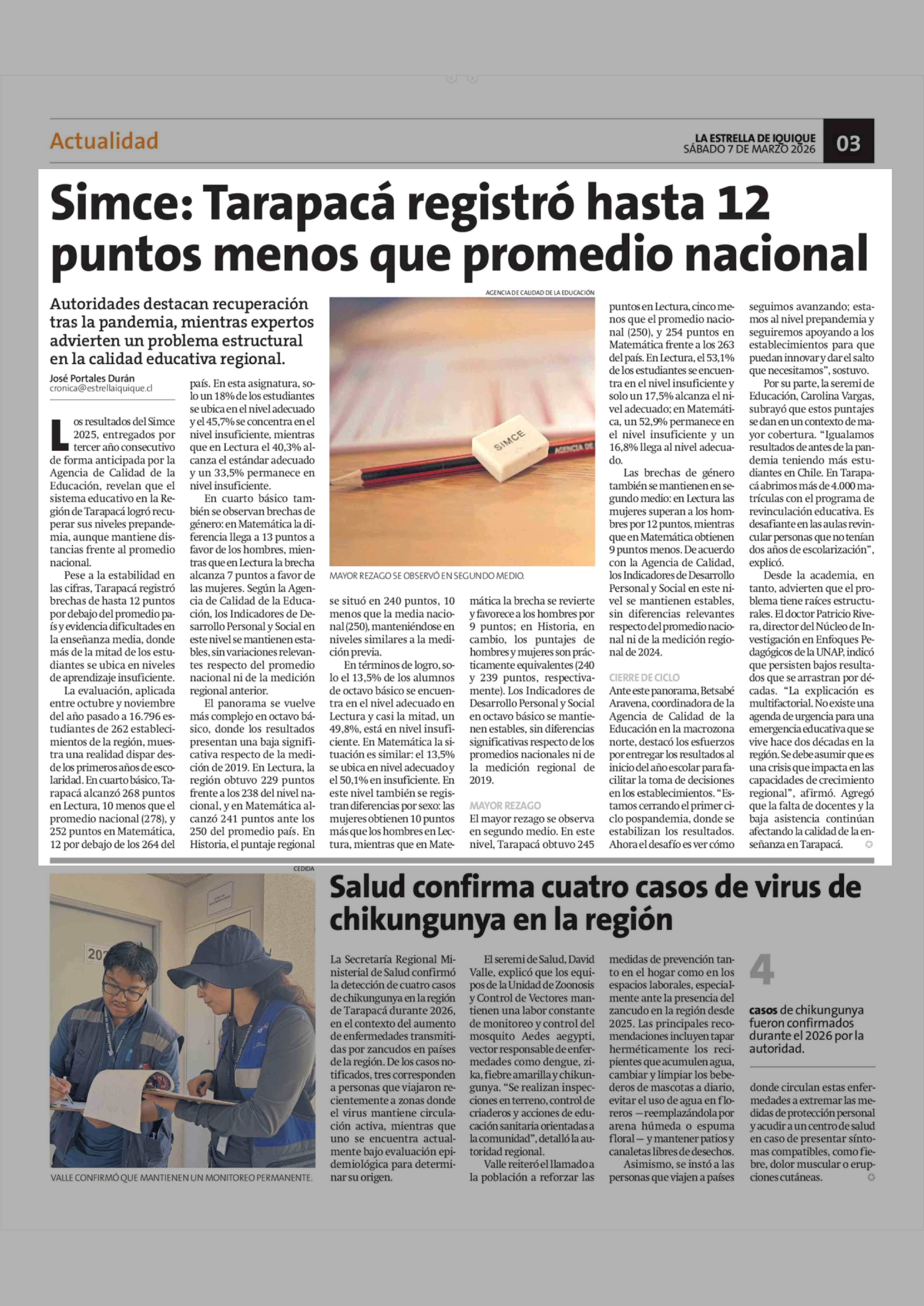Simce: Tarapacá registró hasta 12 puntos menos que promedio nacional 07-03-2026 La Estrella de Iquique |