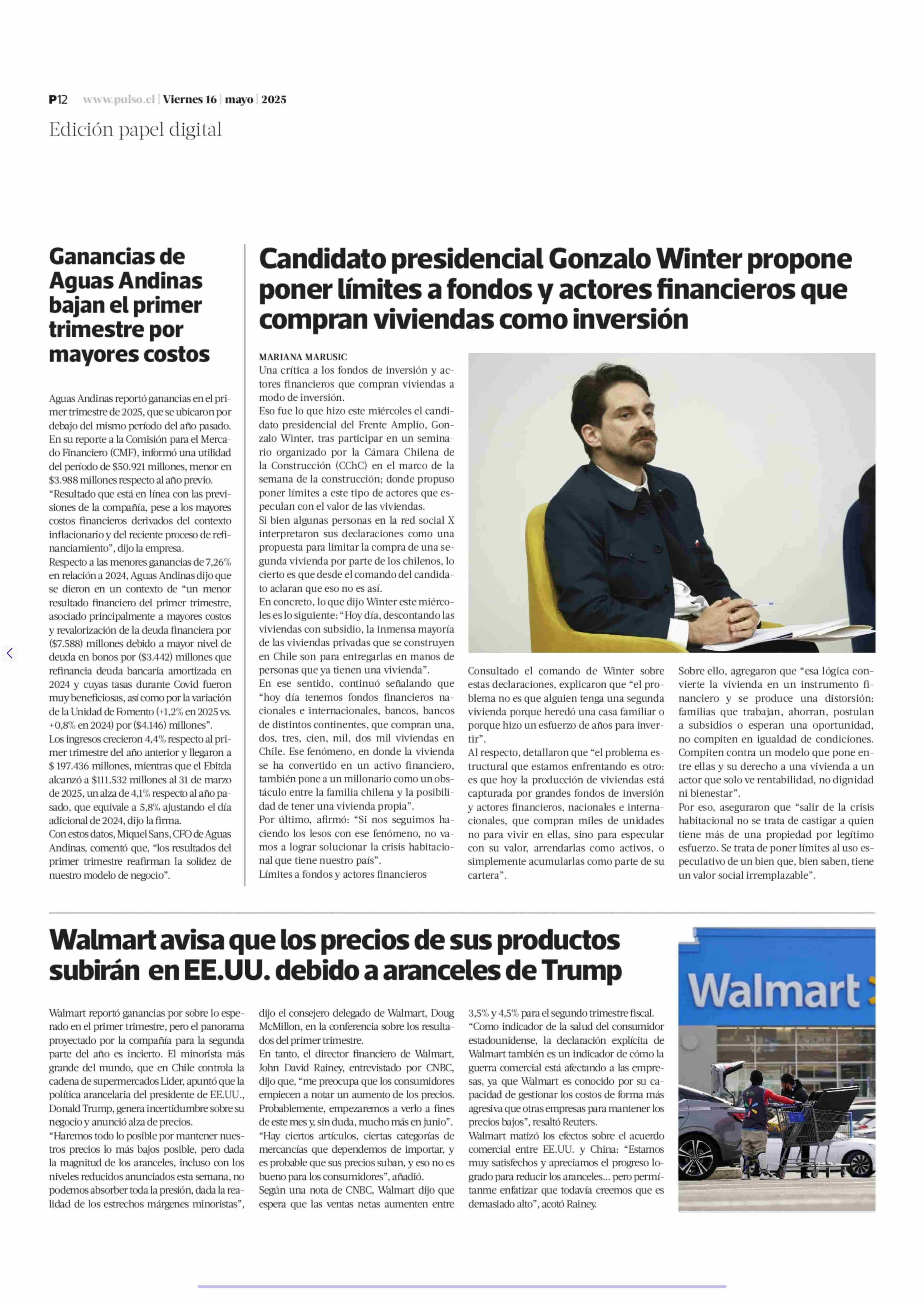 Candidato presidencial Gonzalo Winter propone poner límites a fondos y actores financieros que compran viviendas como inversión 16-05-2025 La Tercera |