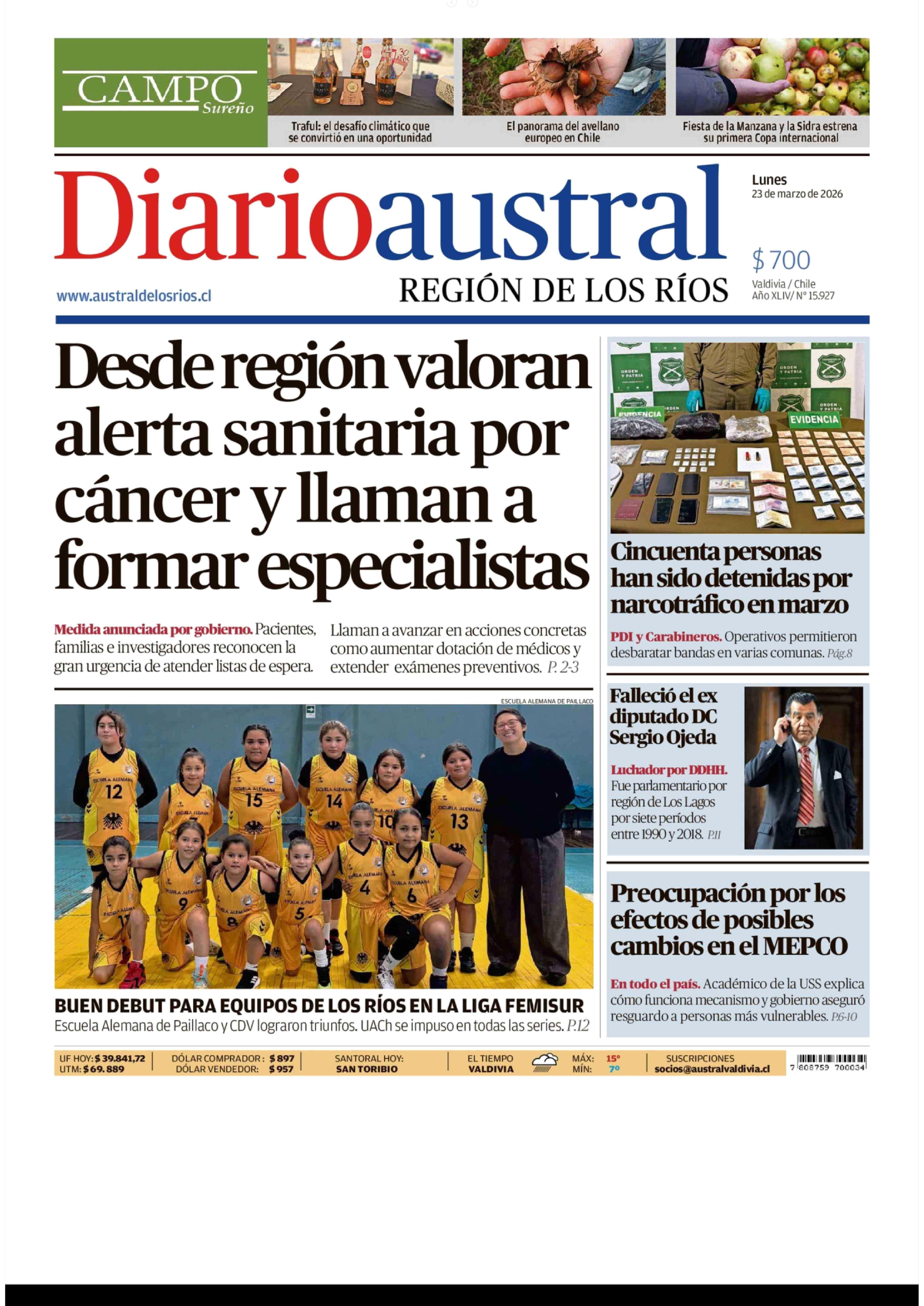 | Fecha: | 23-03-2026 | Sector: | Portada | Región: | Región de Los Ríos |