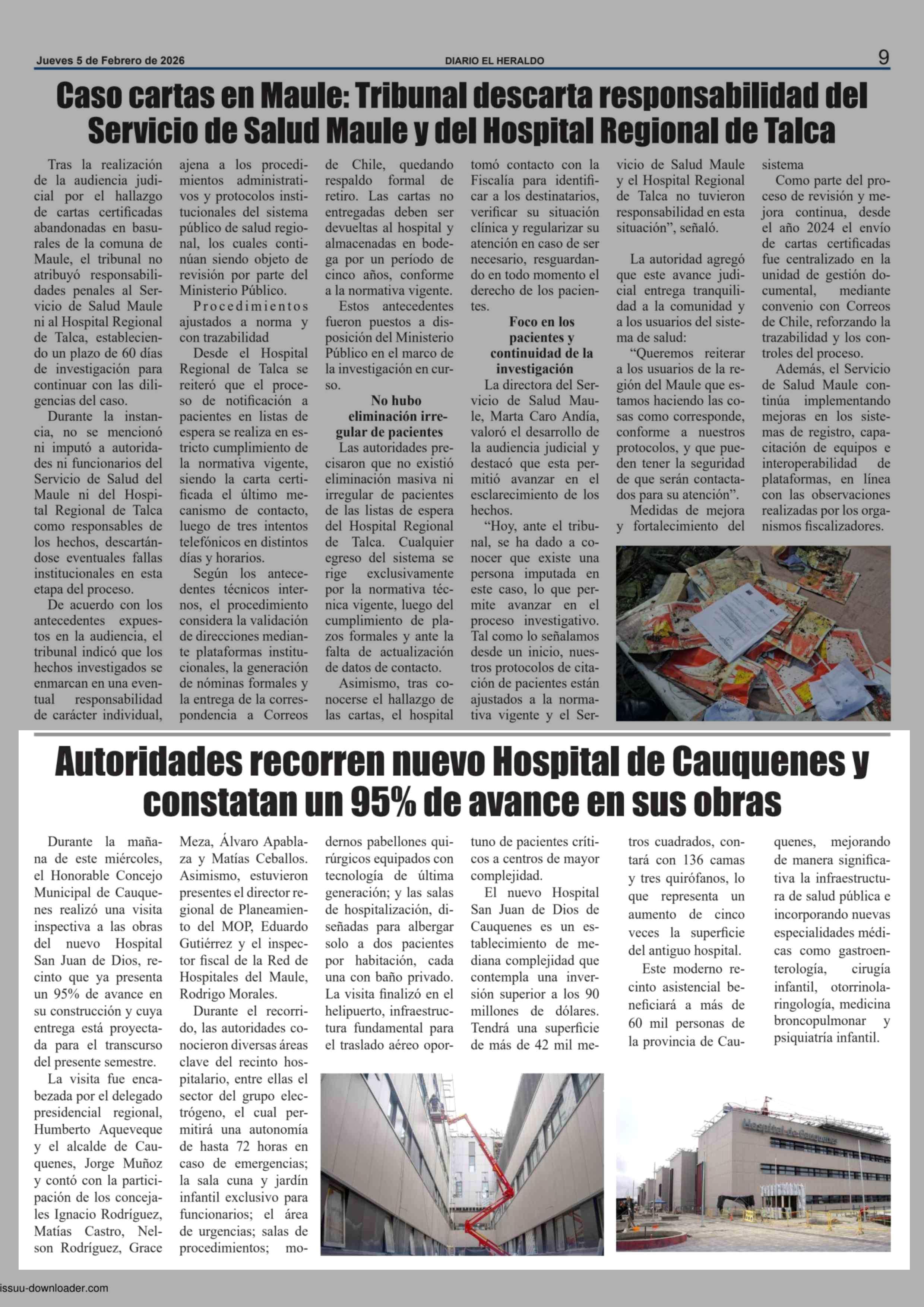 Autoridades recorren nuevo Hospital de Cauquenes y constatan un 95% de avance en sus obras 05-02-2026 El Heraldo |