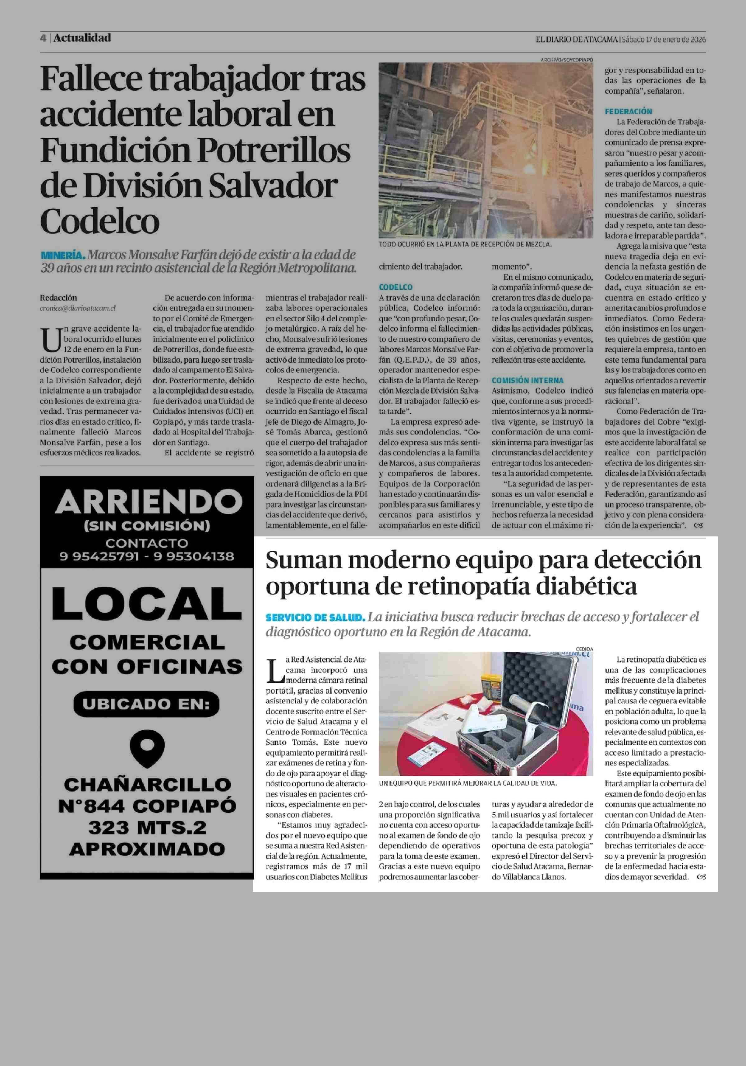 Suman moderno equipo para detección oportuna de retinopatía diabética 17-01-2026 El Diario de Atacama |
