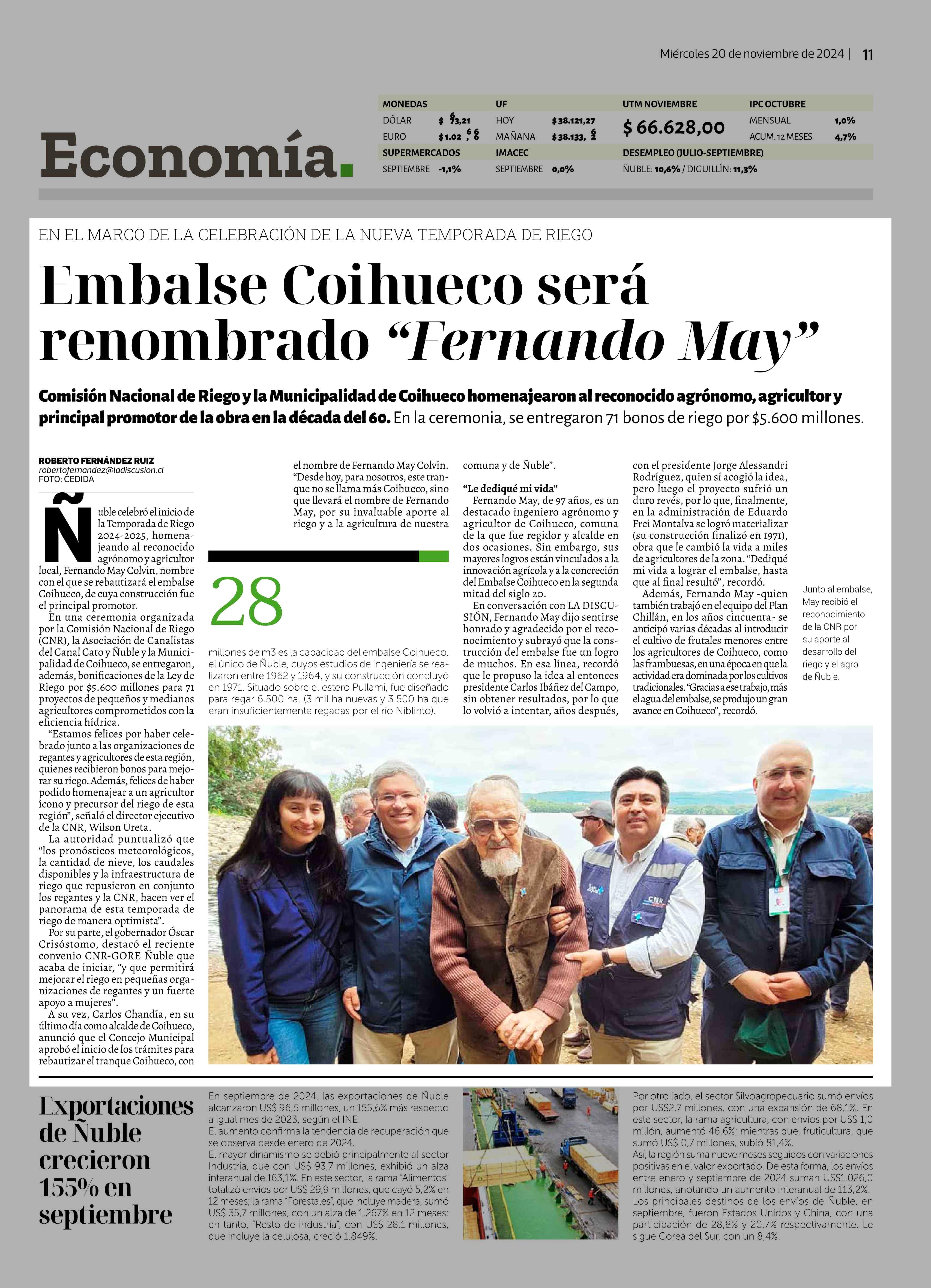 Embalse Coihueco será renombrado “Fernando May” 20-11-2024 La Discusión |