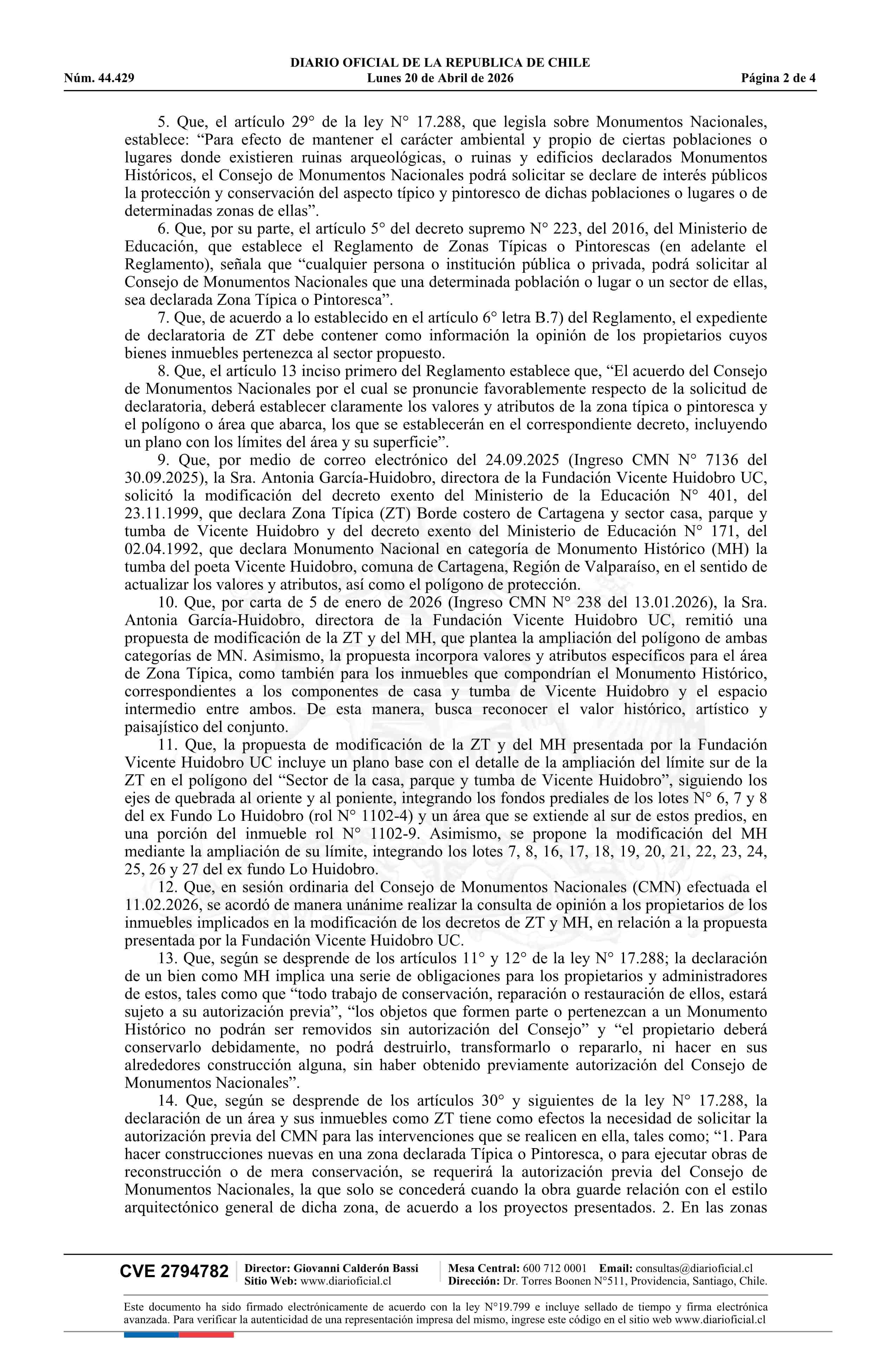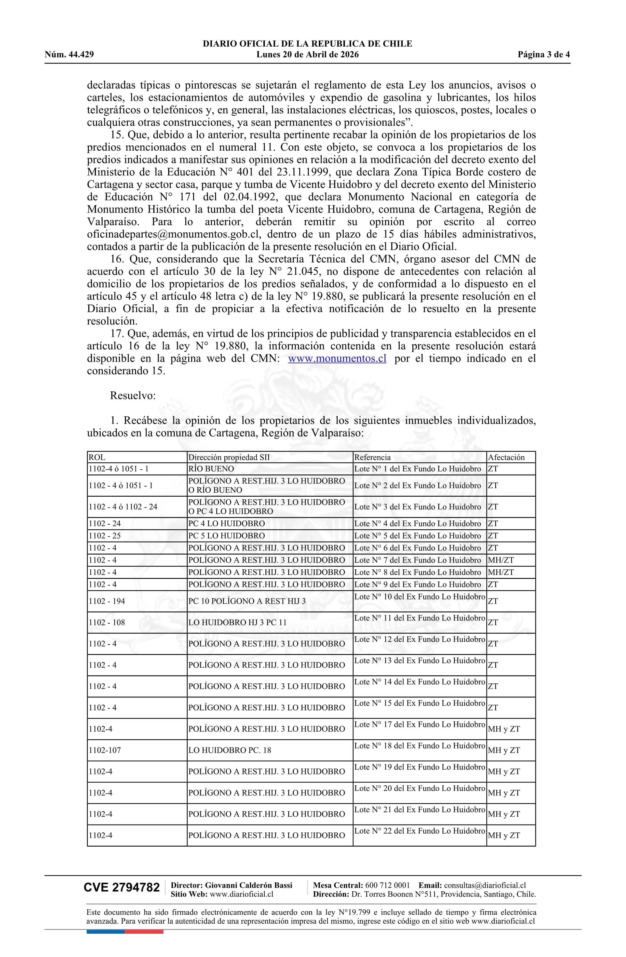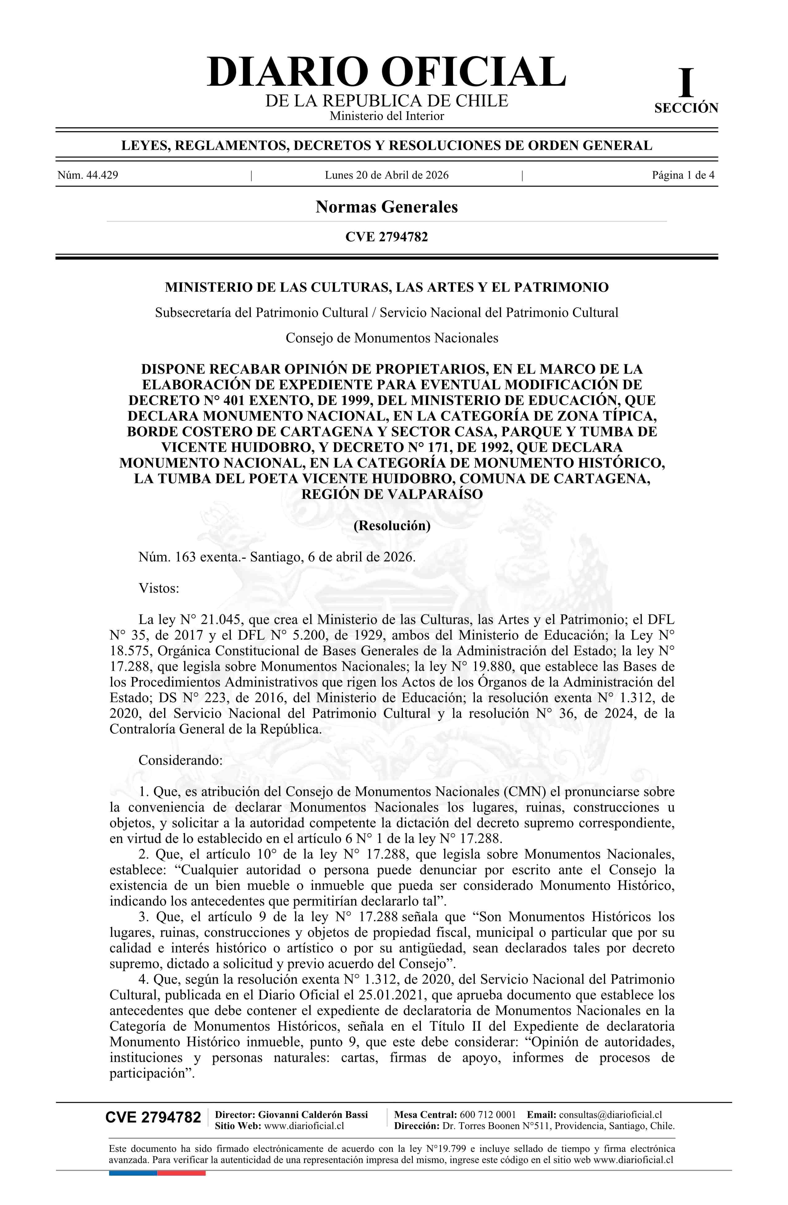 | Título: | Resolución exenta número 163, de 2026.- Dispone recabar opinión de propietarios, en el marco de la elaboración de expediente para eventual modificación del decreto N° 401 exento de 1999, del Ministerio de Educación, que declara Monumento Nacional, en la categoría de Zona Típica, Borde costero de Car |