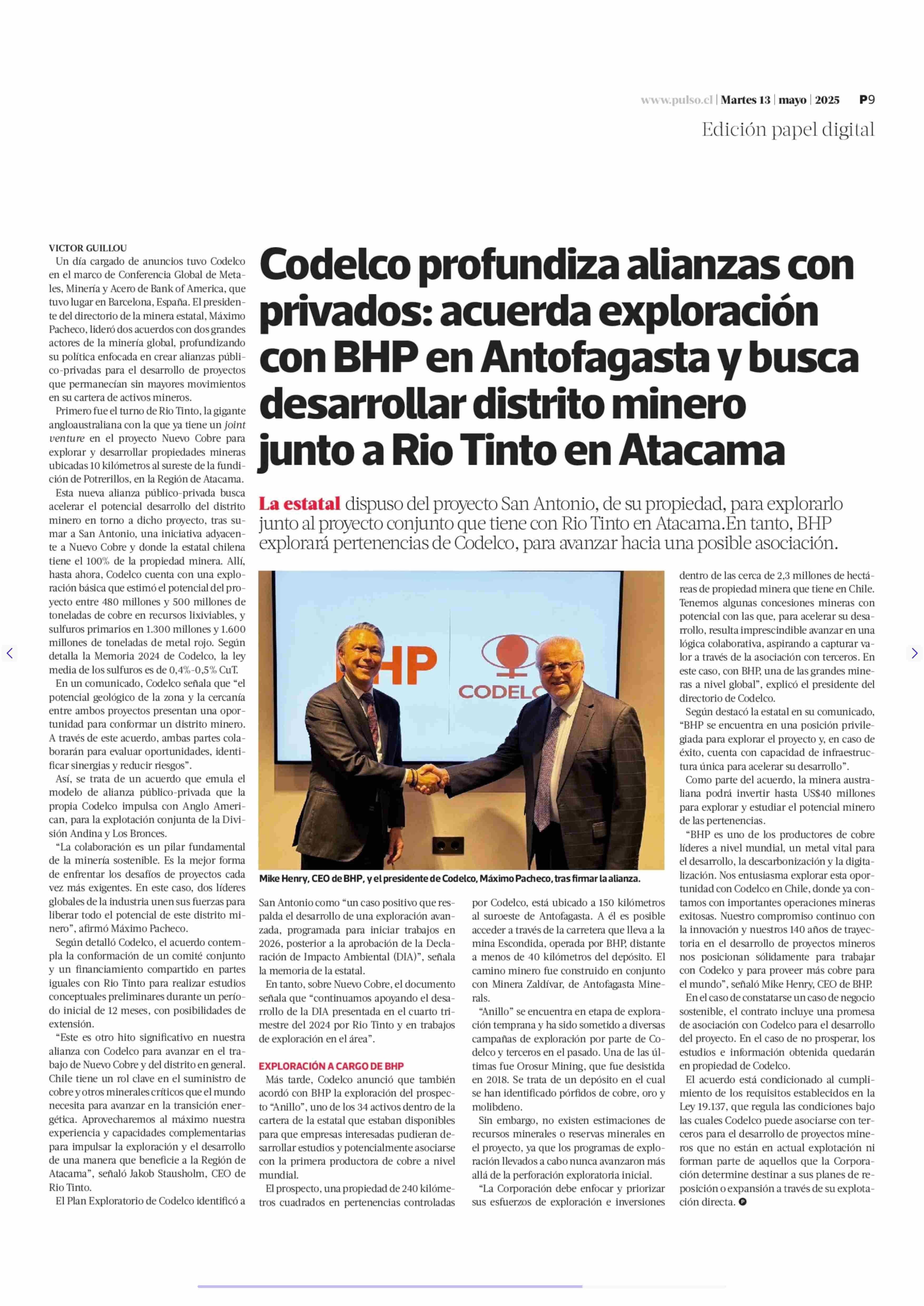 Codelco profundiza alianzas con privados: acuerda exploración con BHP en Antofagasta y busca desarrollar distrito minero junto a Rio Tinto en Atacama 13-05-2025 La Tercera |