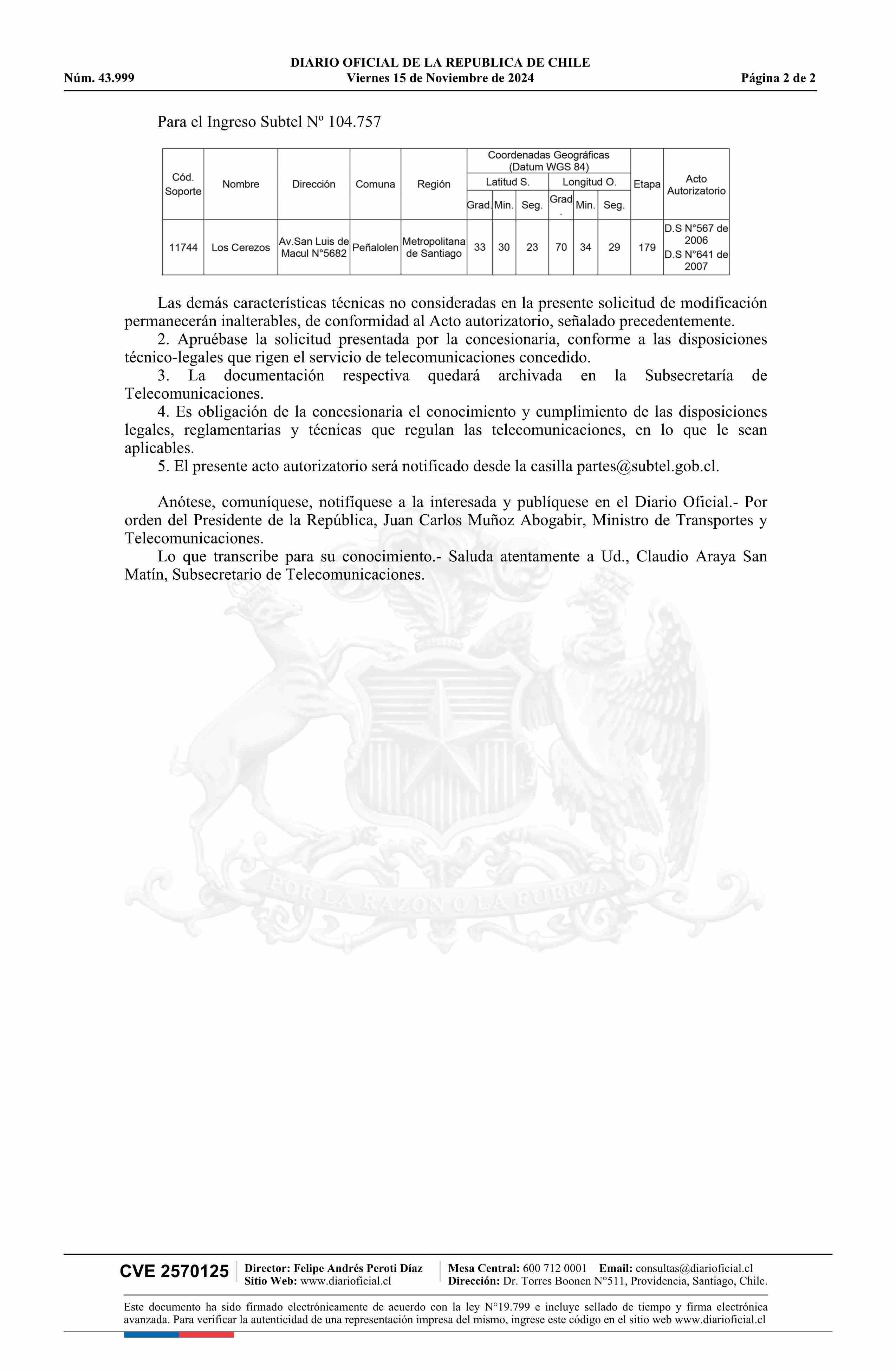 Decreto exento número 464, de 2024.- Modificación de concesiones de servicio público de telefonía móvil celular a la empresa Claro Chile SpA 15-11-2024 Diario Oficial Edición Electrónica |