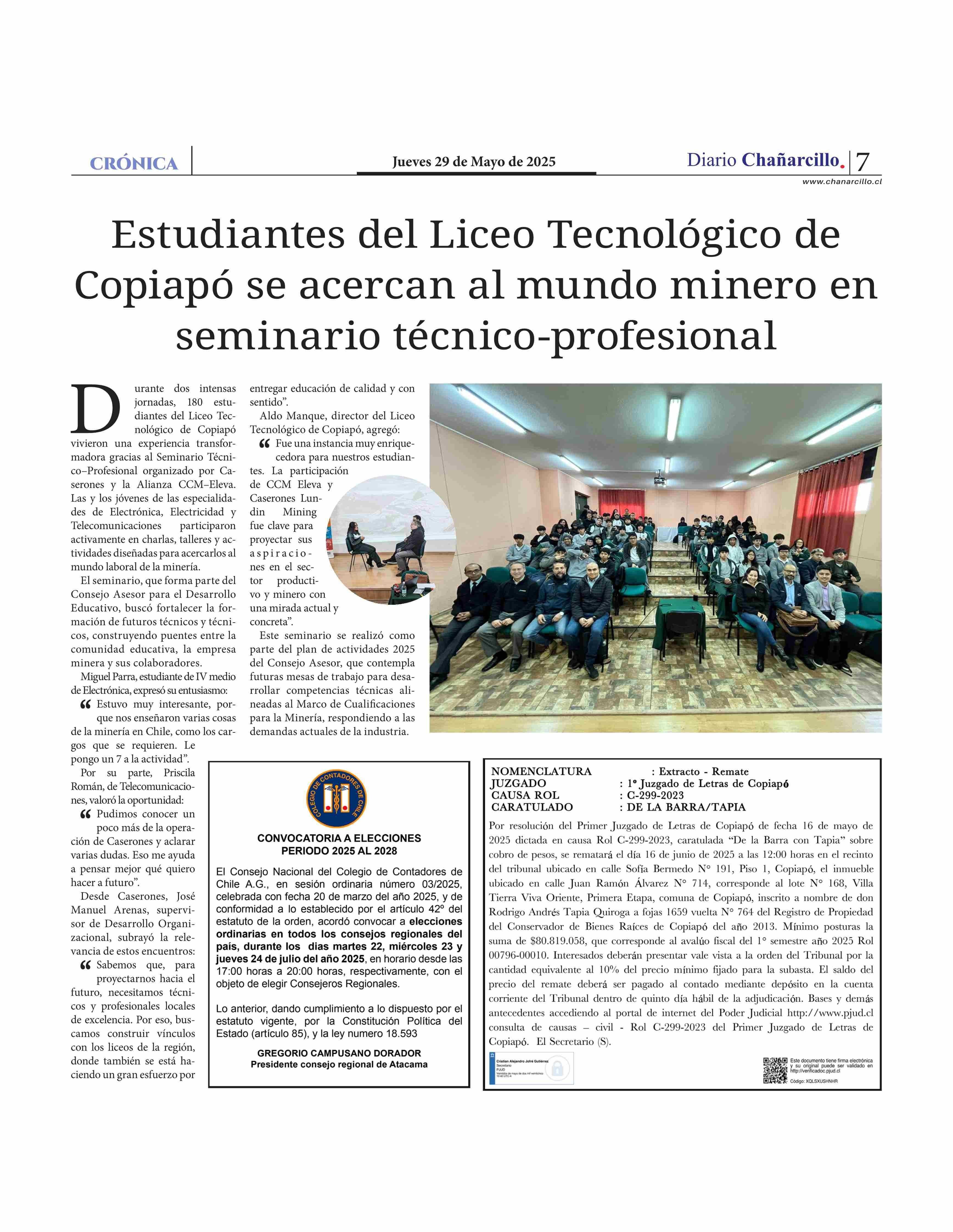 Estudiantes del Liceo Tecnológico de Copiapó se acercan al mundo minero en seminario técnico-profesional 29-05-2025 Diario Chañarcillo |