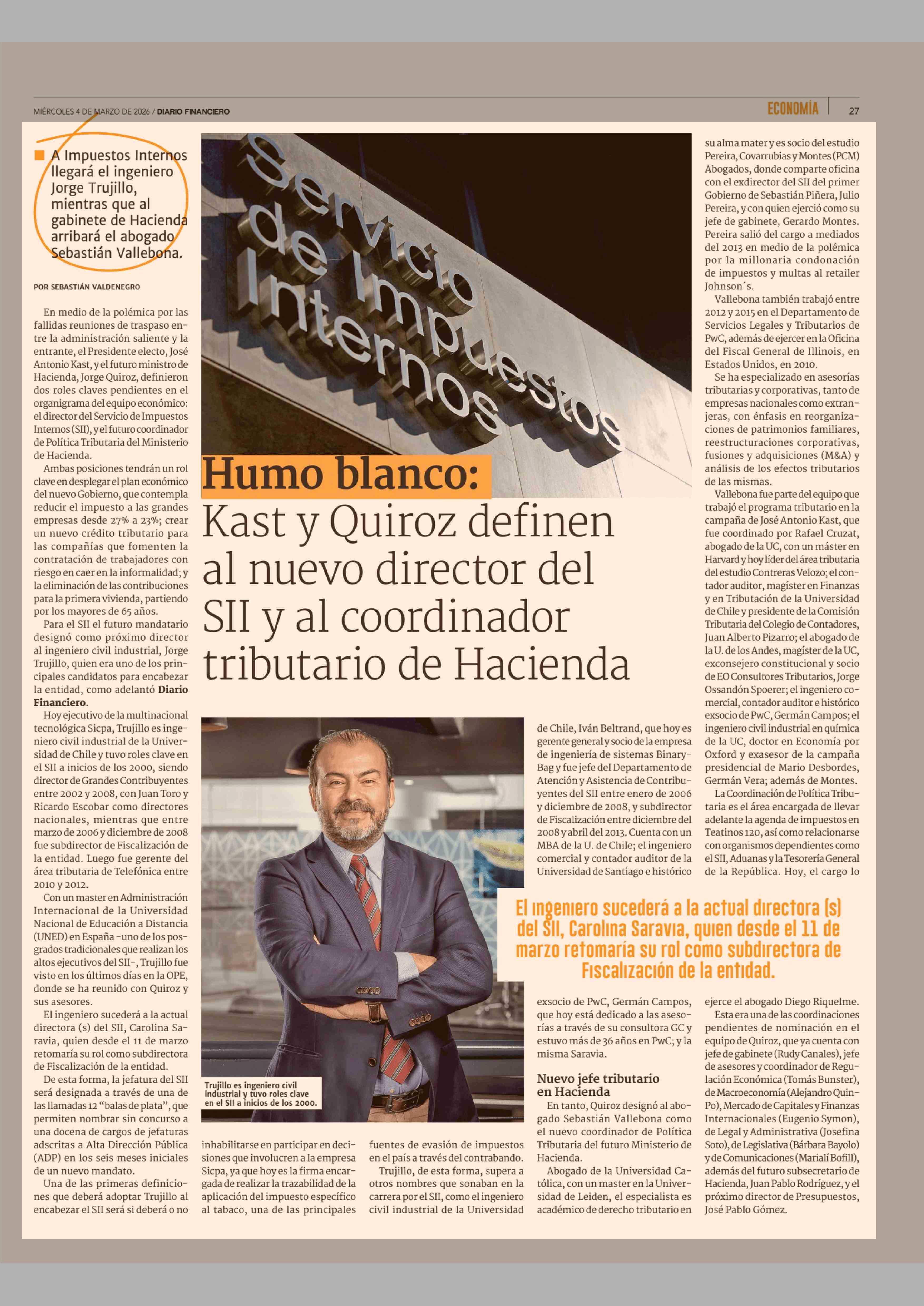 Humo blanco: Kast y Quiroz definen al nuevo director del SII y al coordinador tributario de Hacienda 04-03-2026 Diario Financiero |