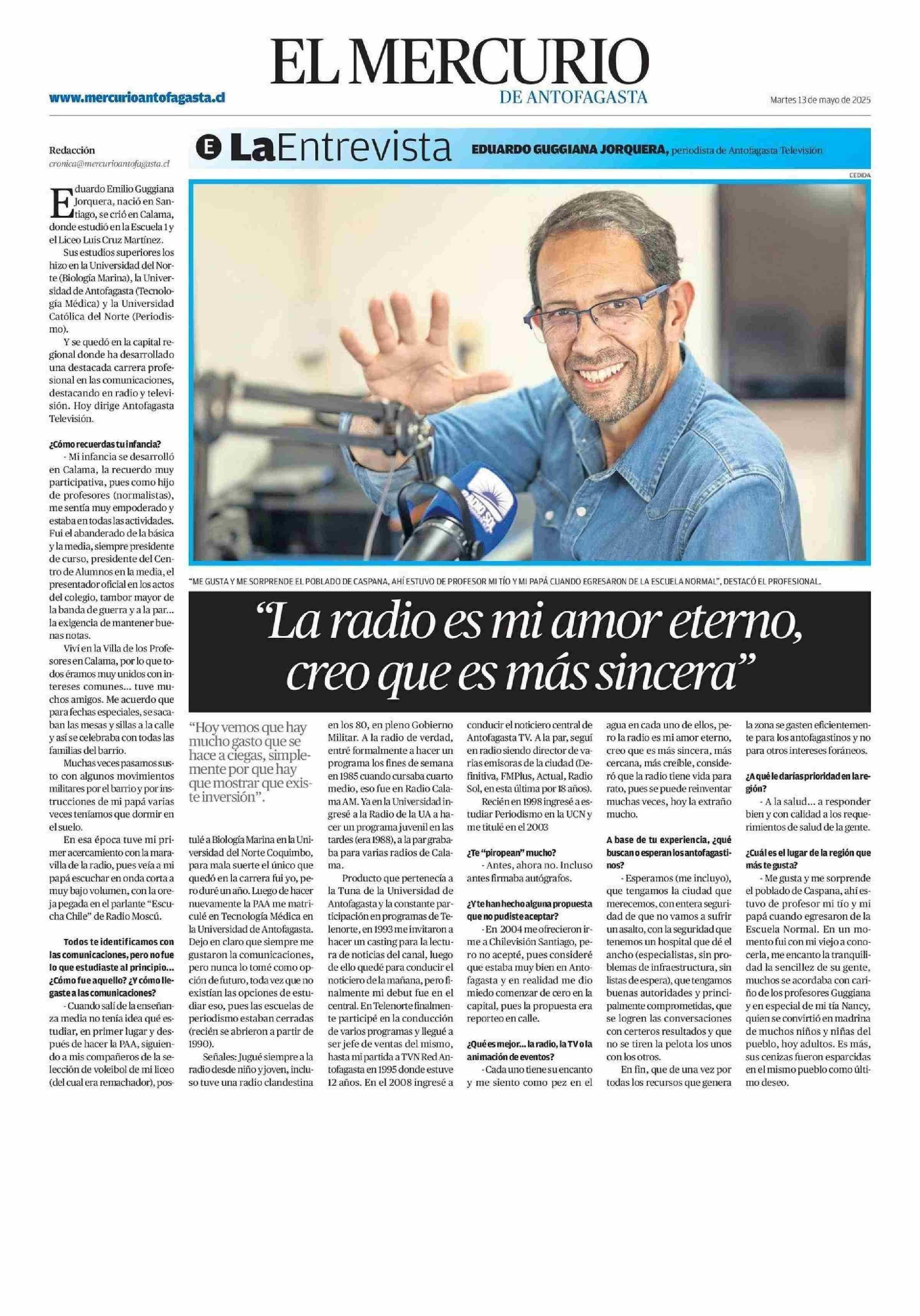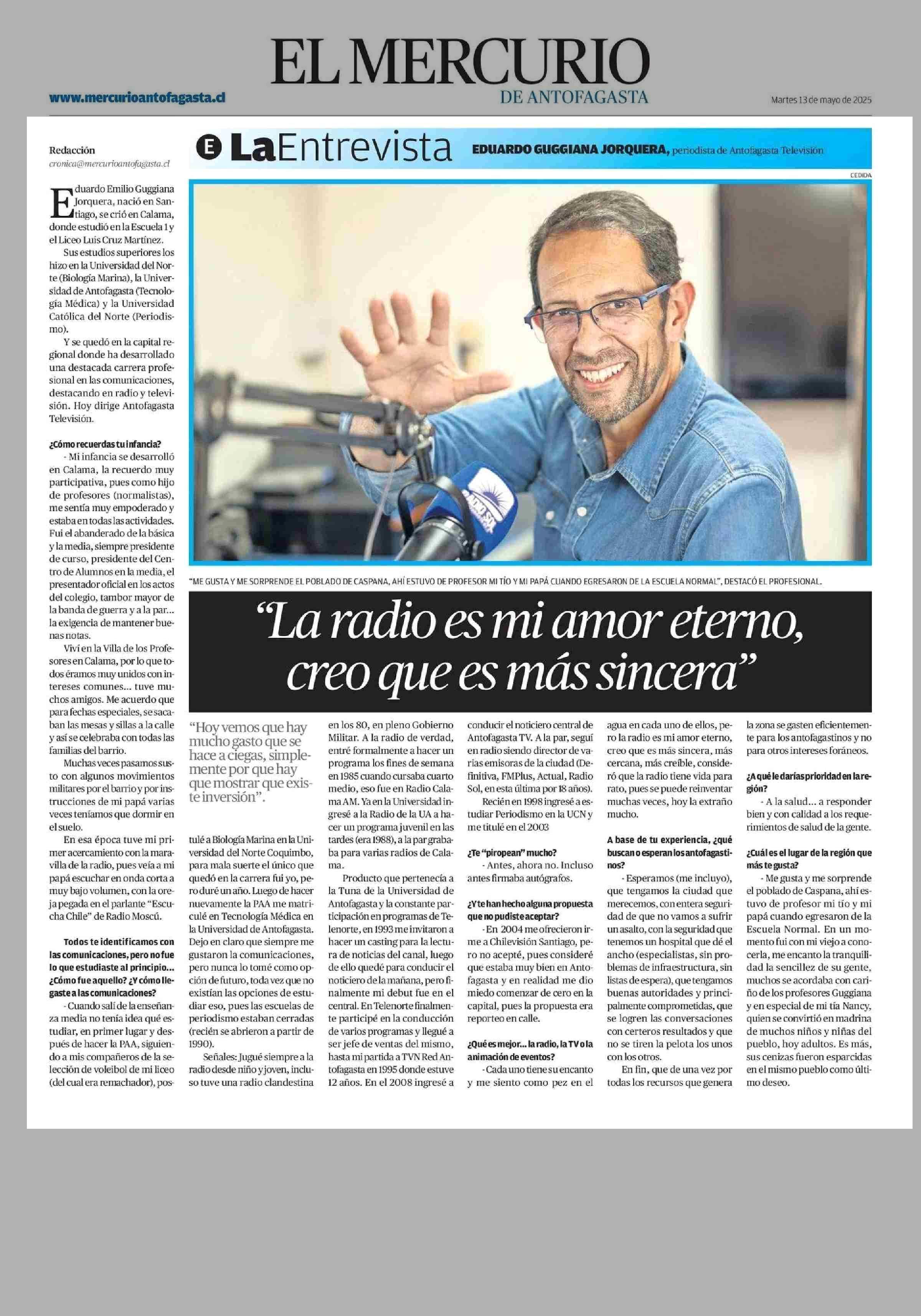 "La radio es mi amor eterno, creo que es más sincera" 13-05-2025 El Mercurio de Antofagasta |