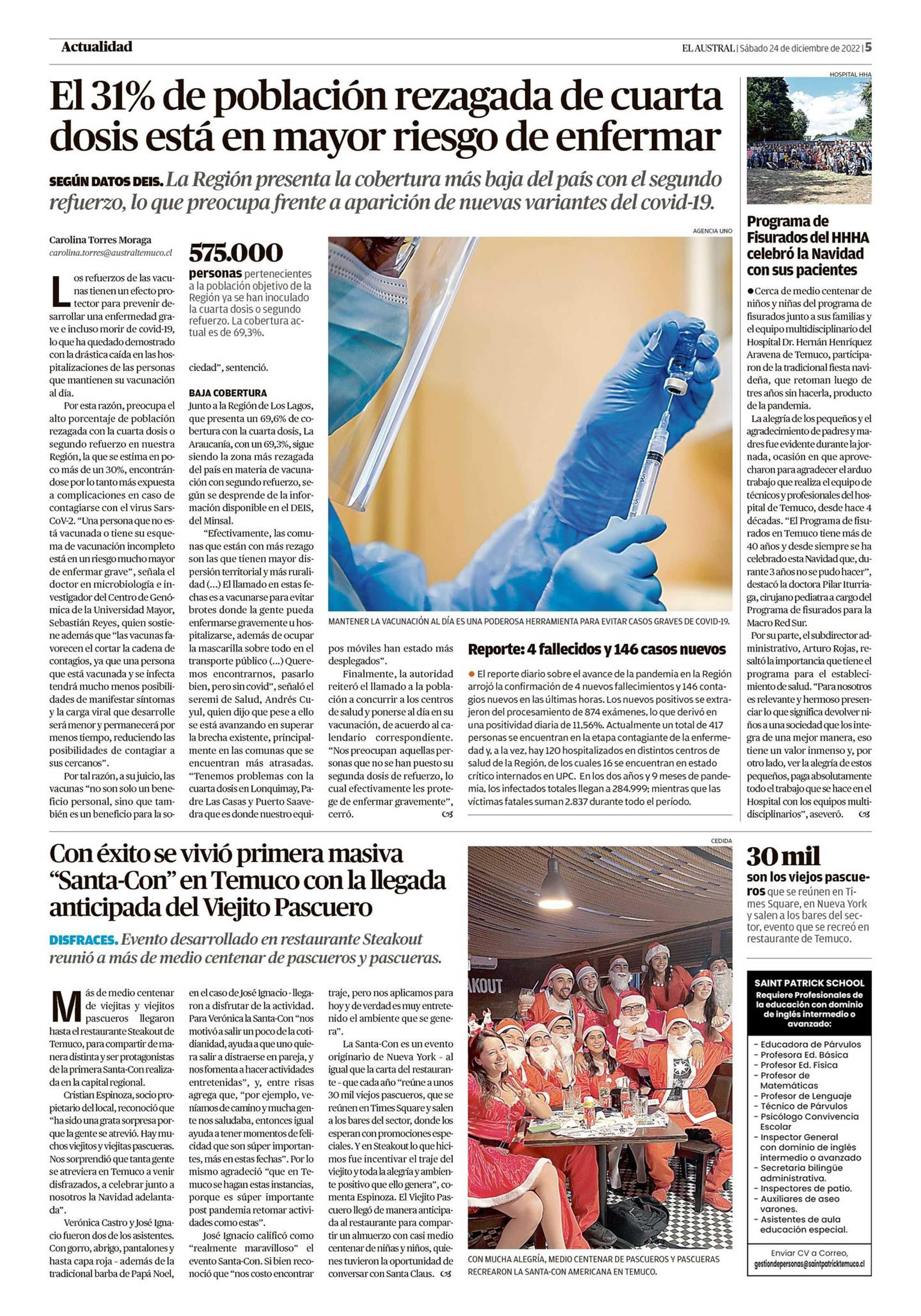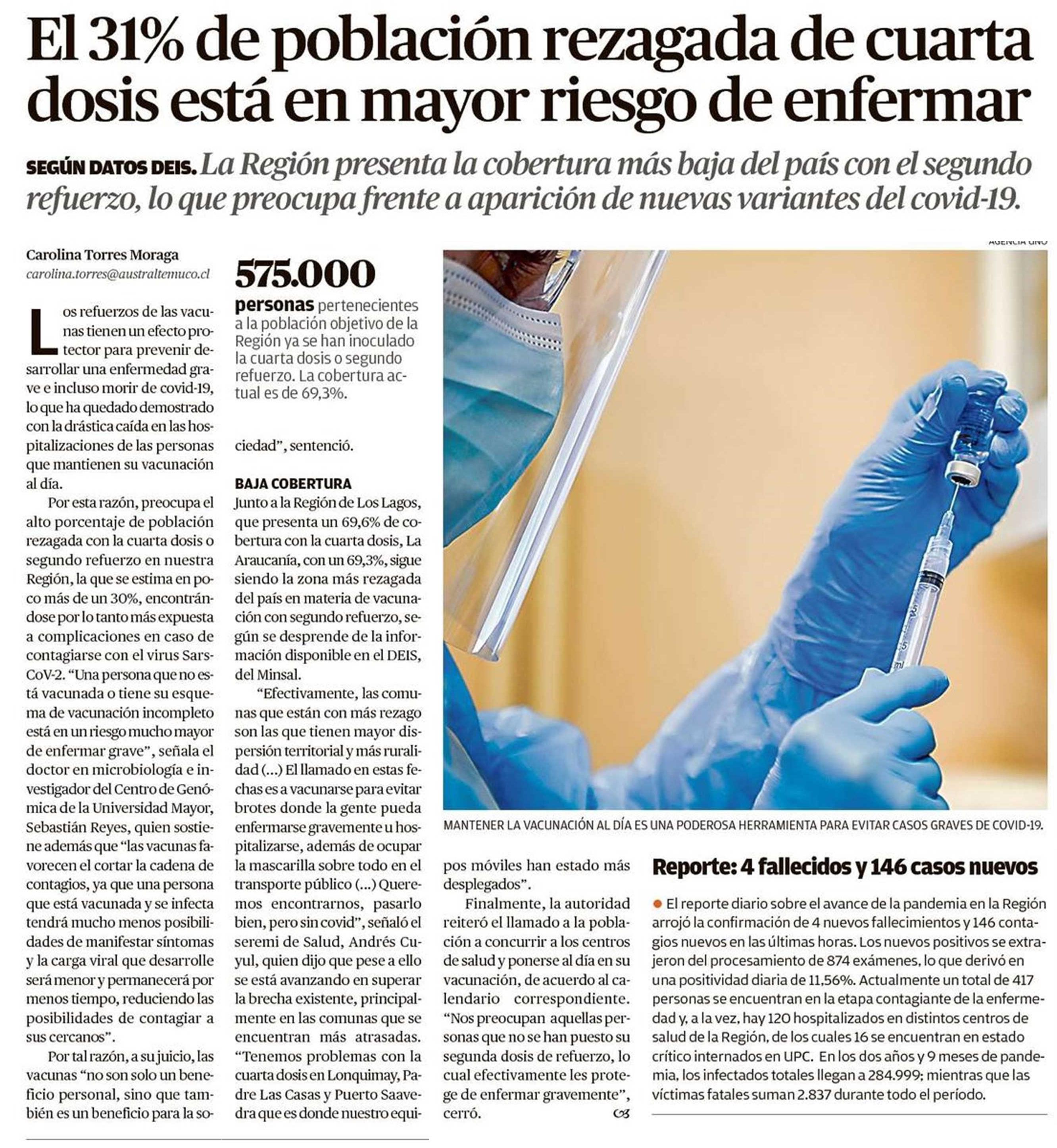 El 31% de población rezagada de cuarta dosis está en mayor riesgo de enfermar 24-12-2022 El Austral de la Araucanía |
