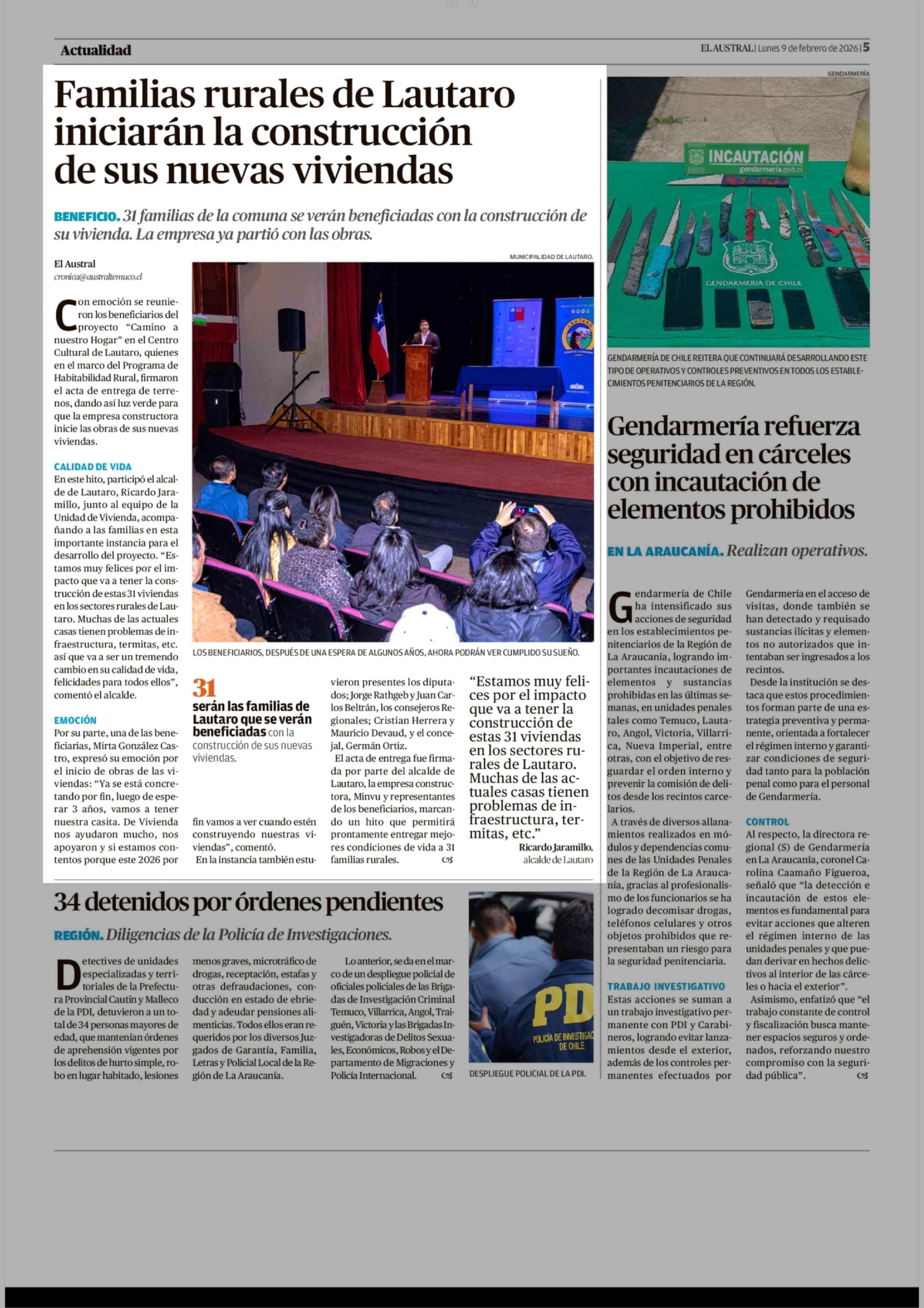 Familias rurales de Lautaro iniciarán la construcción de sus nuevas viviendas 09-02-2026 El Austral de la Araucanía |