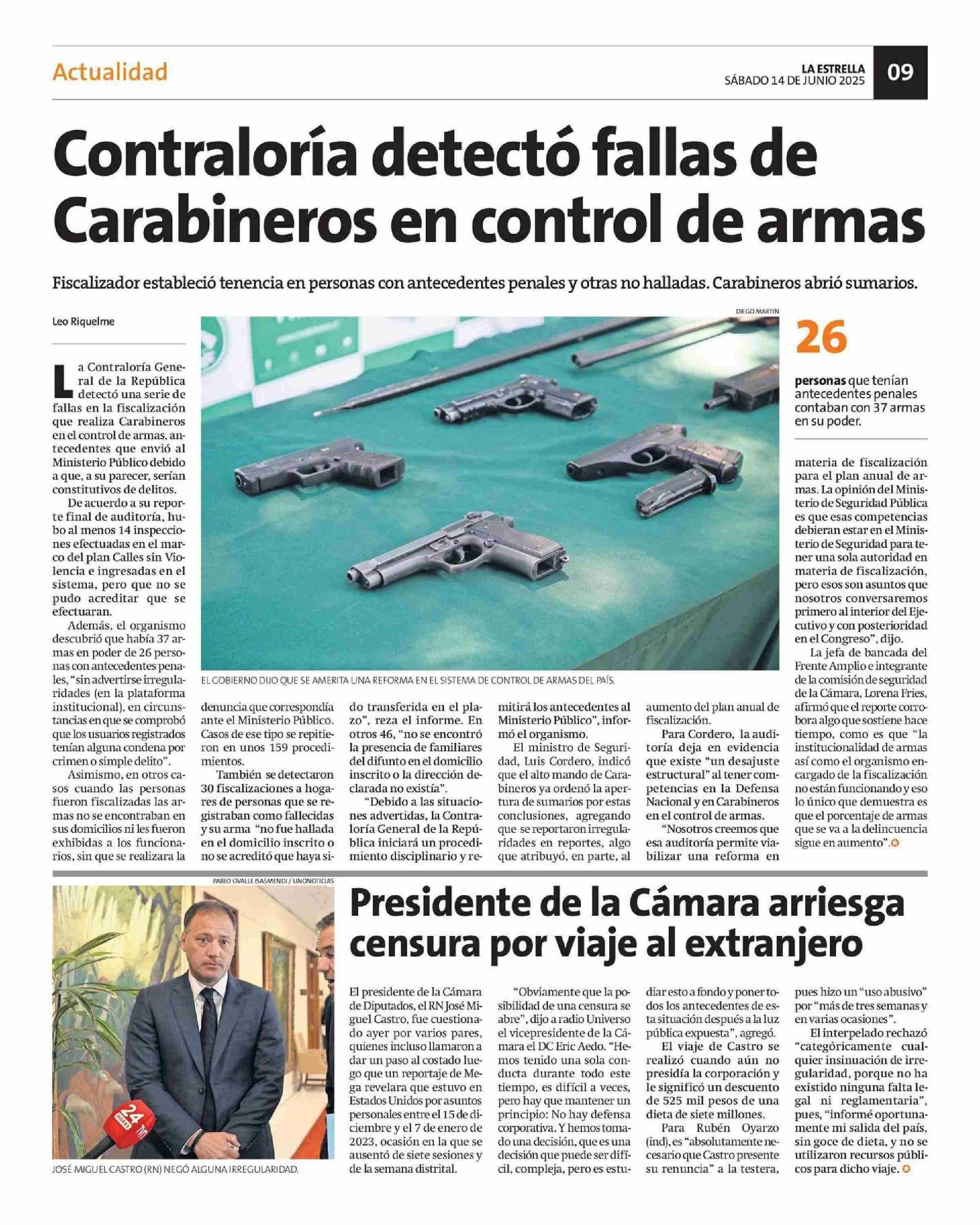 Contraloría detectó fallas de Carabineros en control de armas 14-06-2025 La Estrella de Concepción |