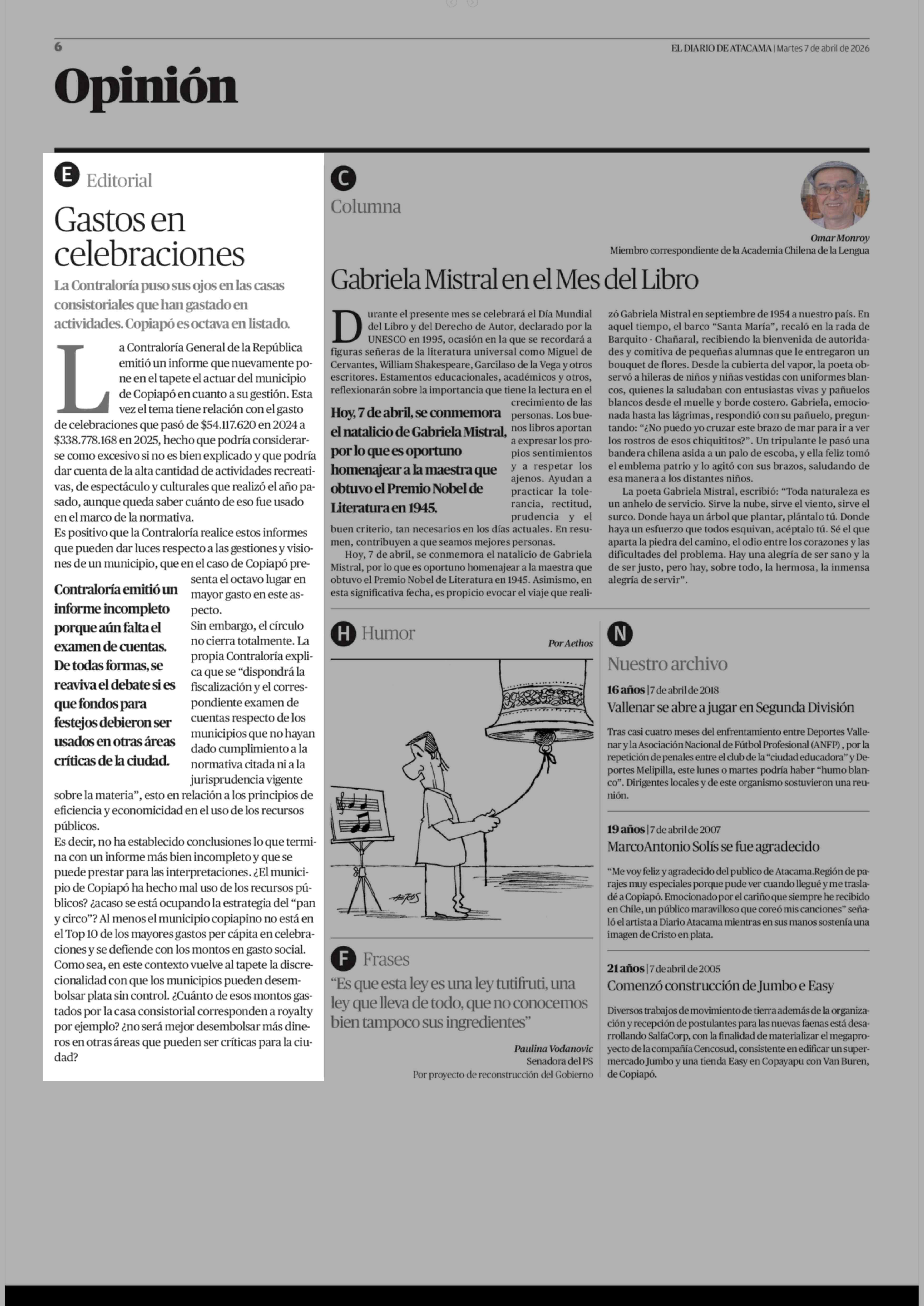 Editorial: Gastos en celebraciones 07-04-2026 El Diario de Atacama |