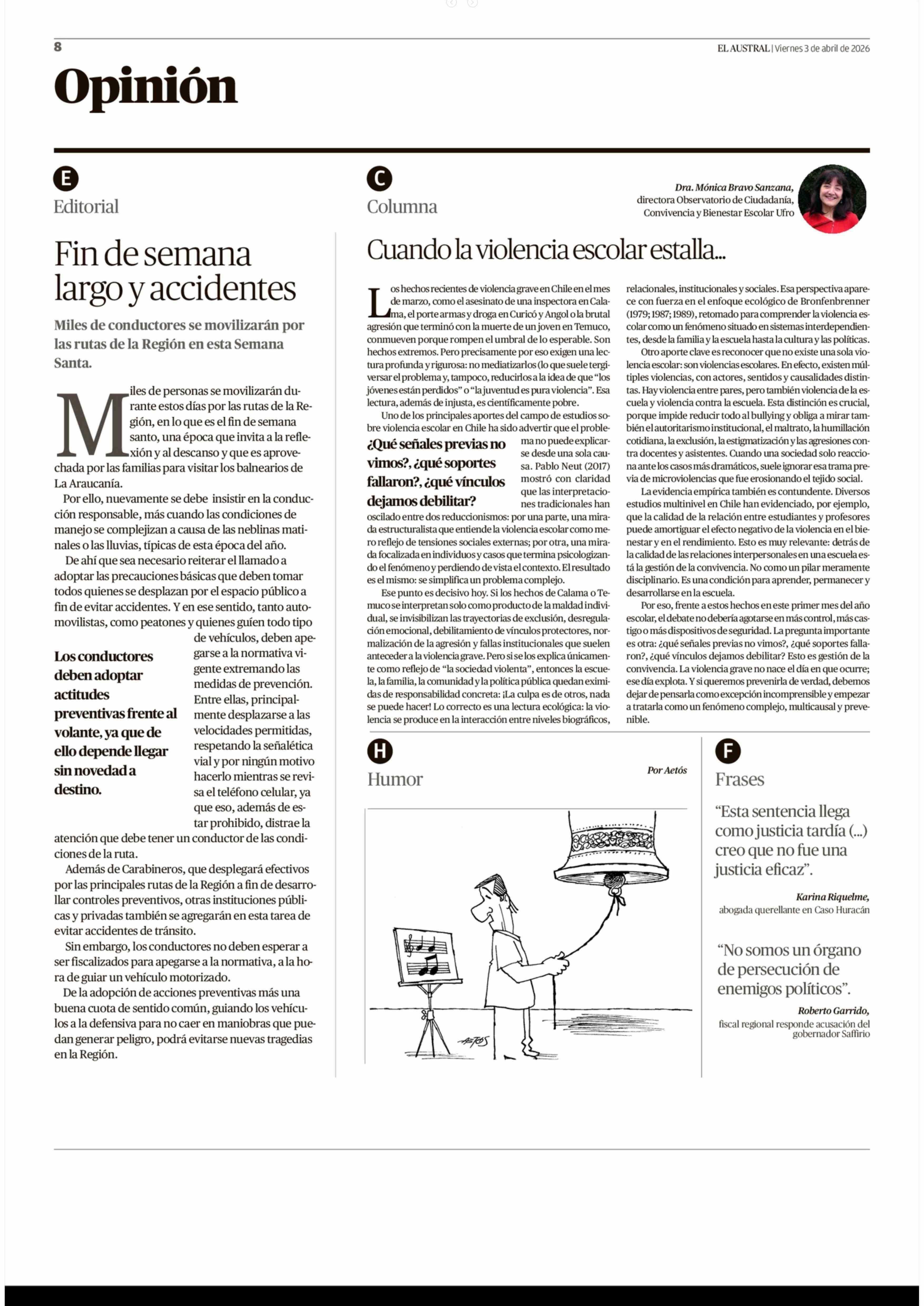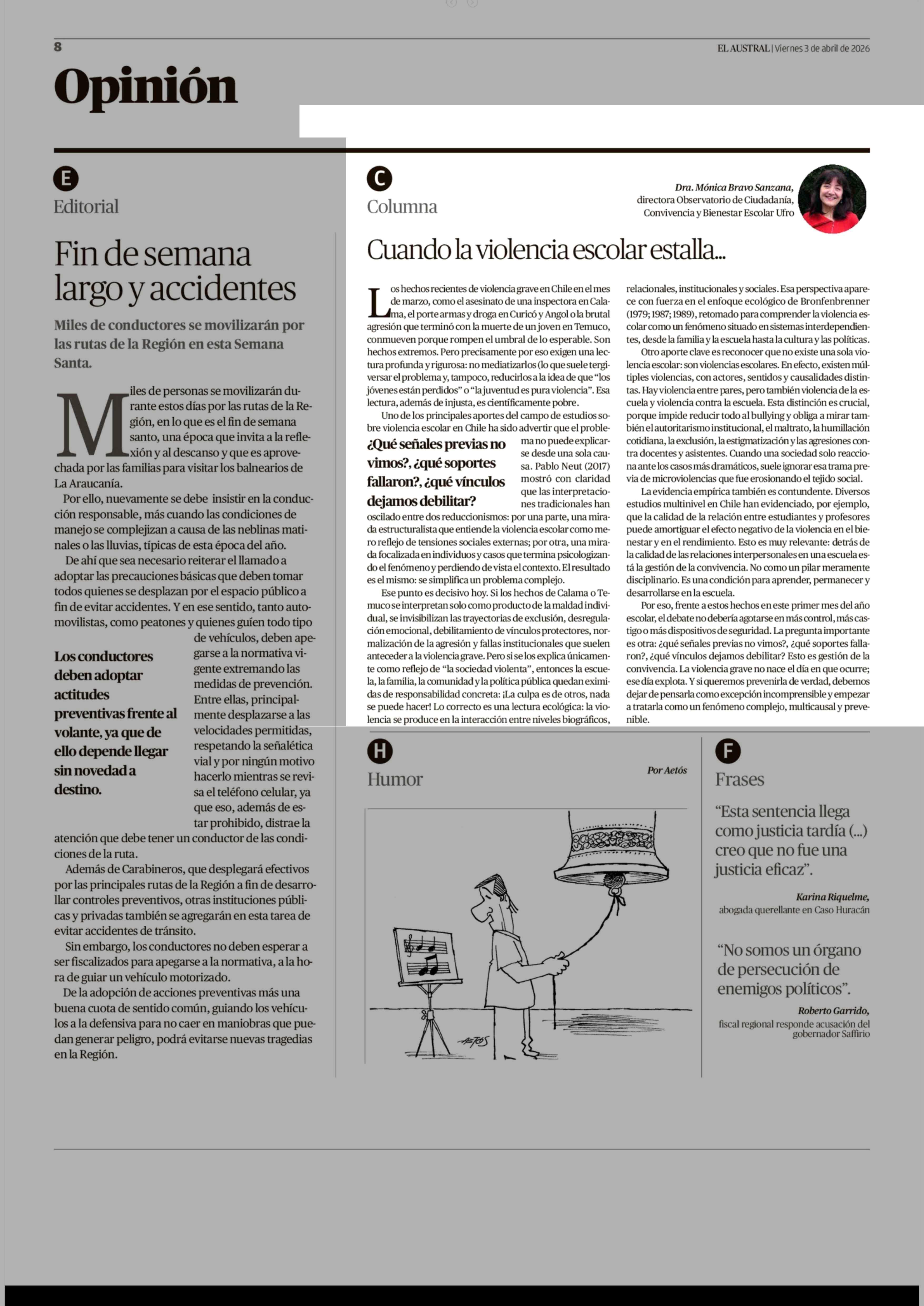 COLUMNAS DE OPINIÓN: Cuando la violencia escolar estalla... 03-04-2026 El Austral de la Araucanía |