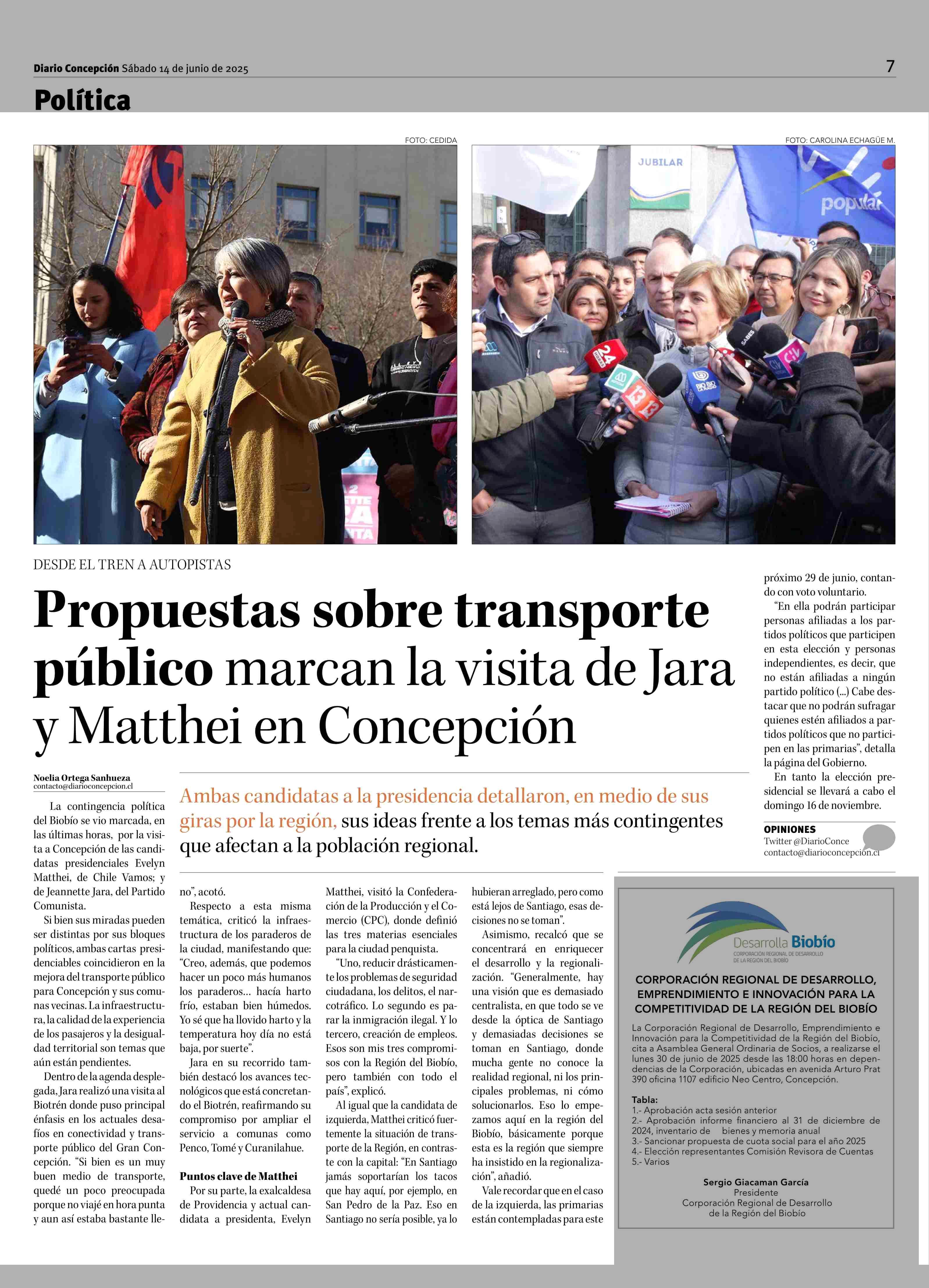 Propuestas sobre transporte público marcan la visita de Jara y Matthei en Concepción 14-06-2025 Diario Concepción |