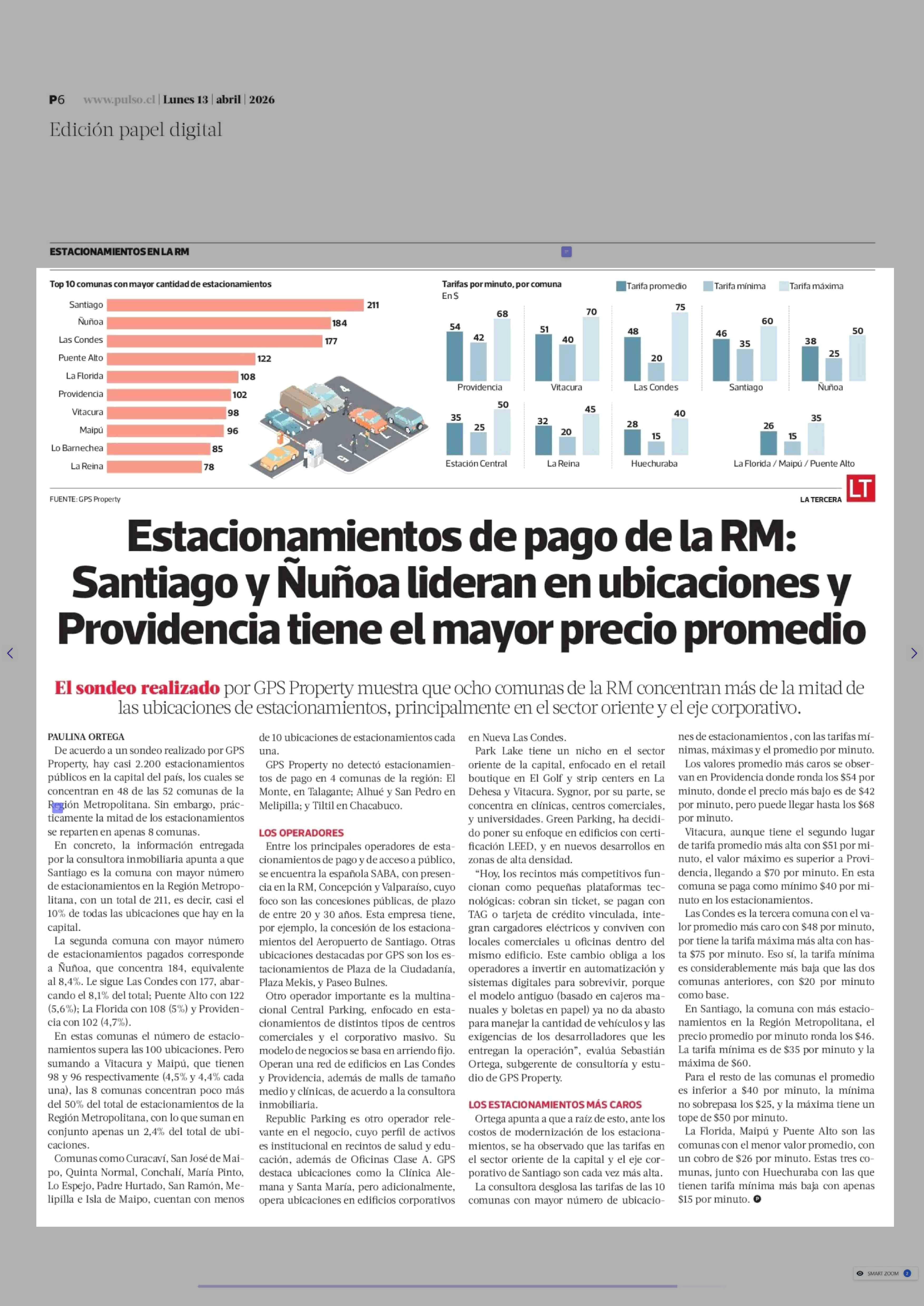 Título: Estacionamientos de pago de la RM: Santiago y Nuñoa lideran en ubicaciones y Providencia tiene el mayor precio promedio