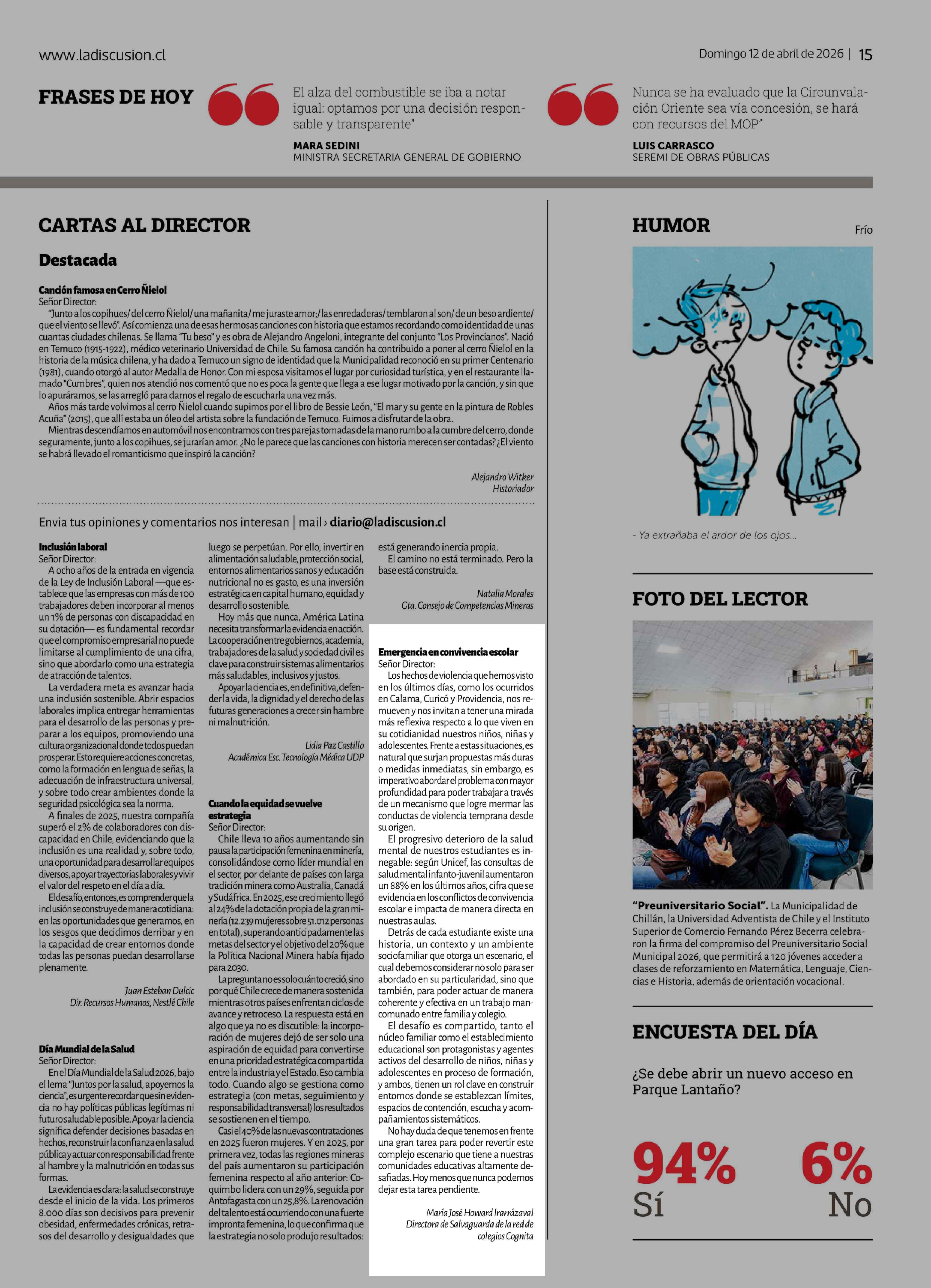 CARTAS: Emergencia en convivencia escolar 12-04-2026 La Discusión |