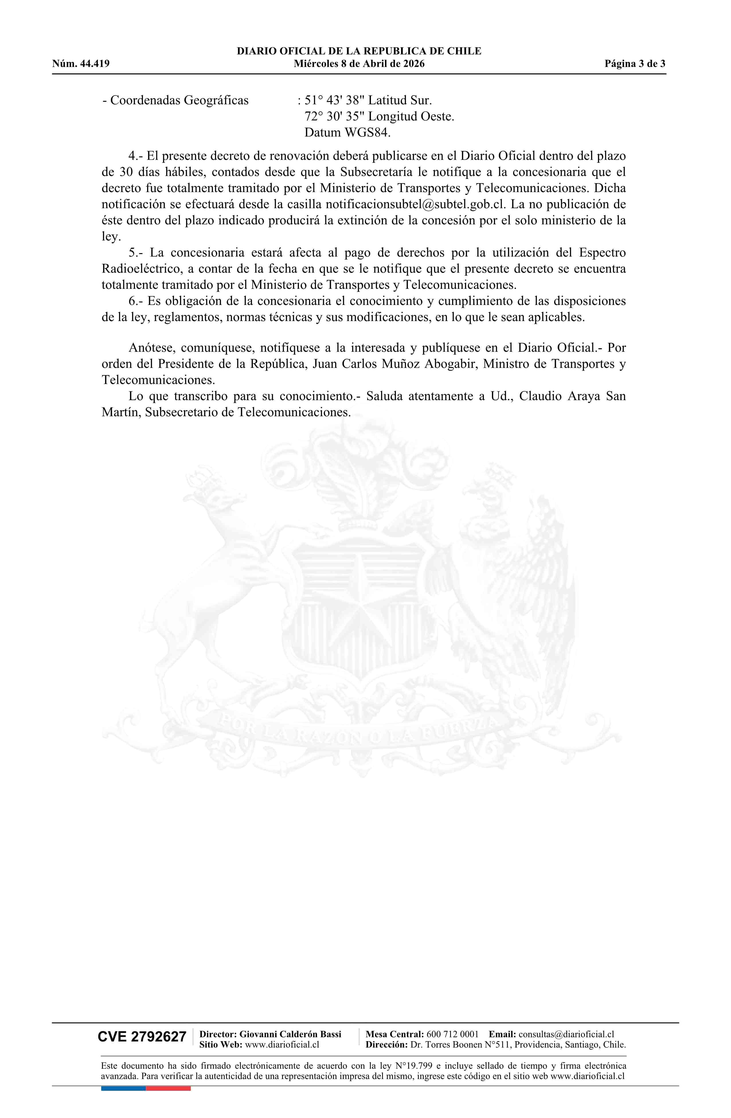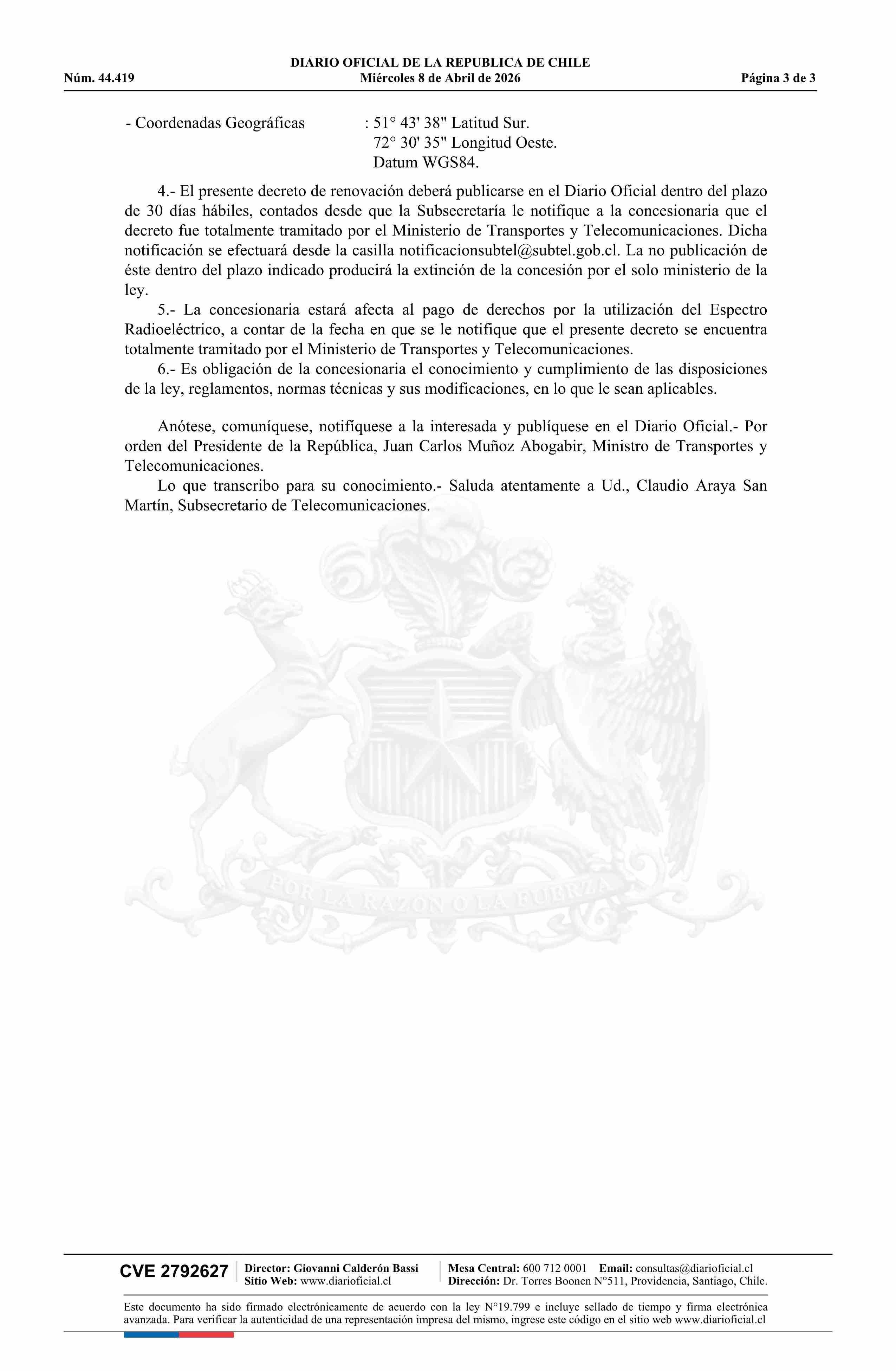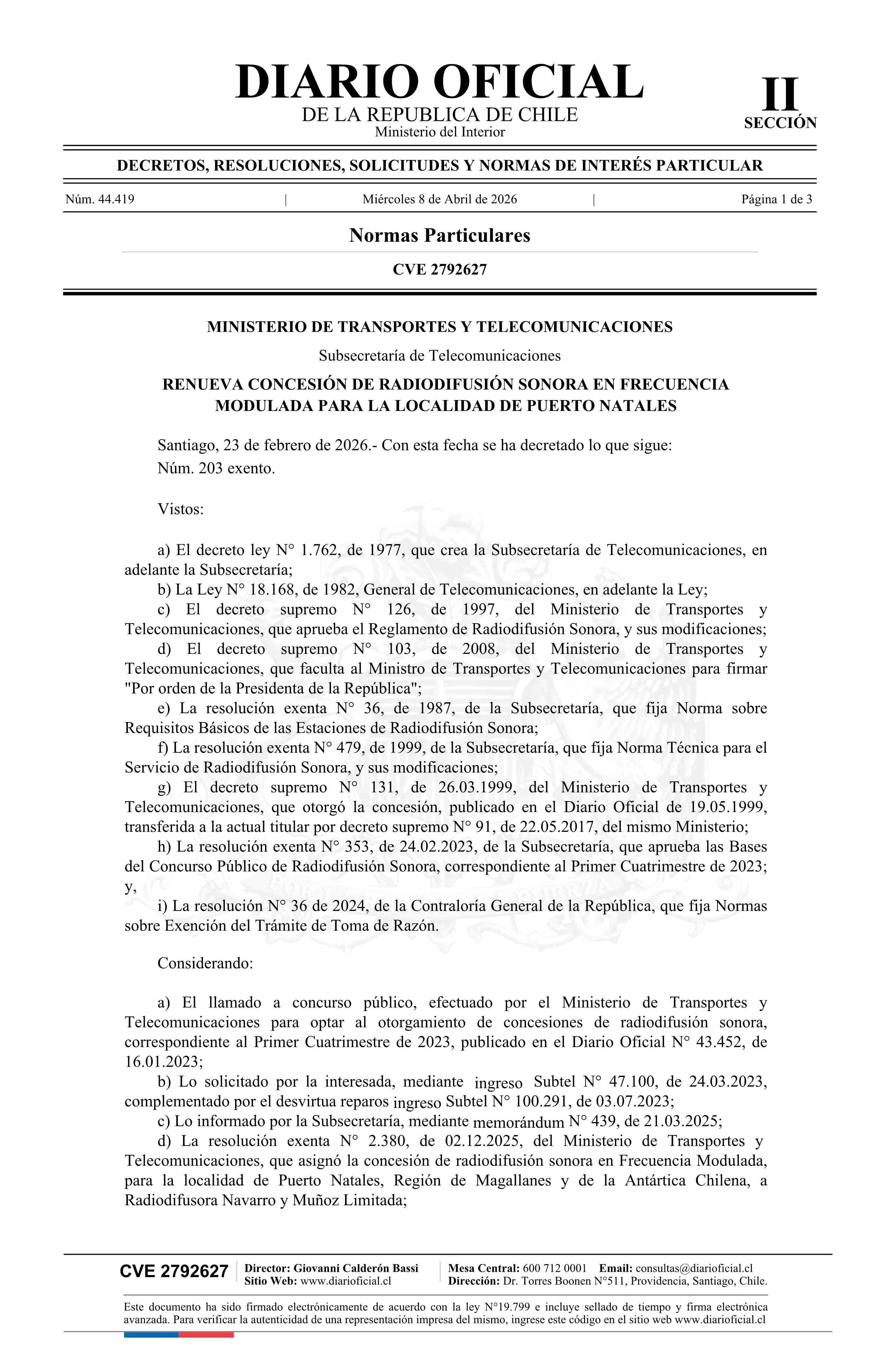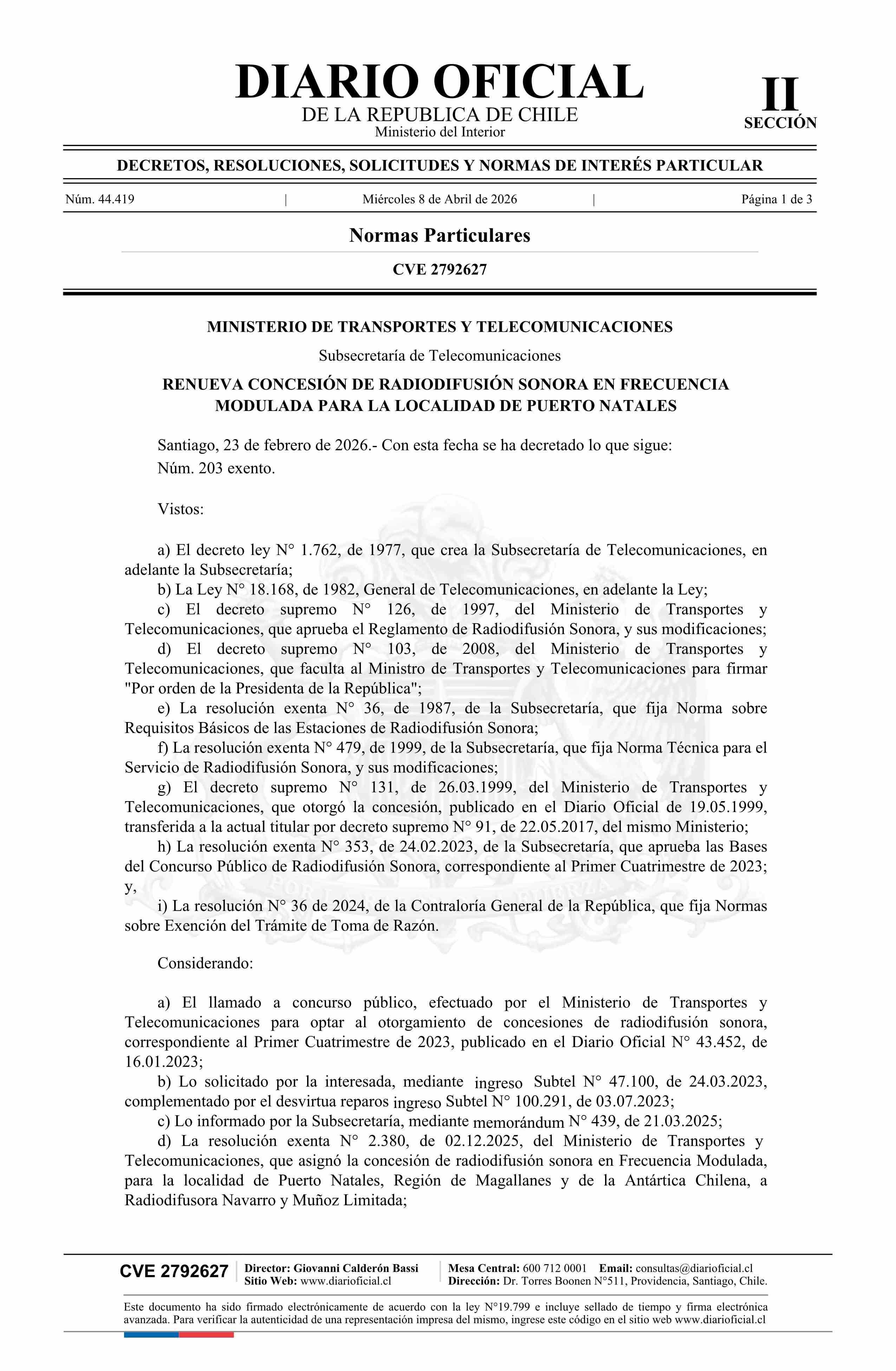 Título: Decreto exento número 203, de 2026.- Renueva concesión de radiodifusión sonora en frecuencia modulada para la localidad de Puerto Natales