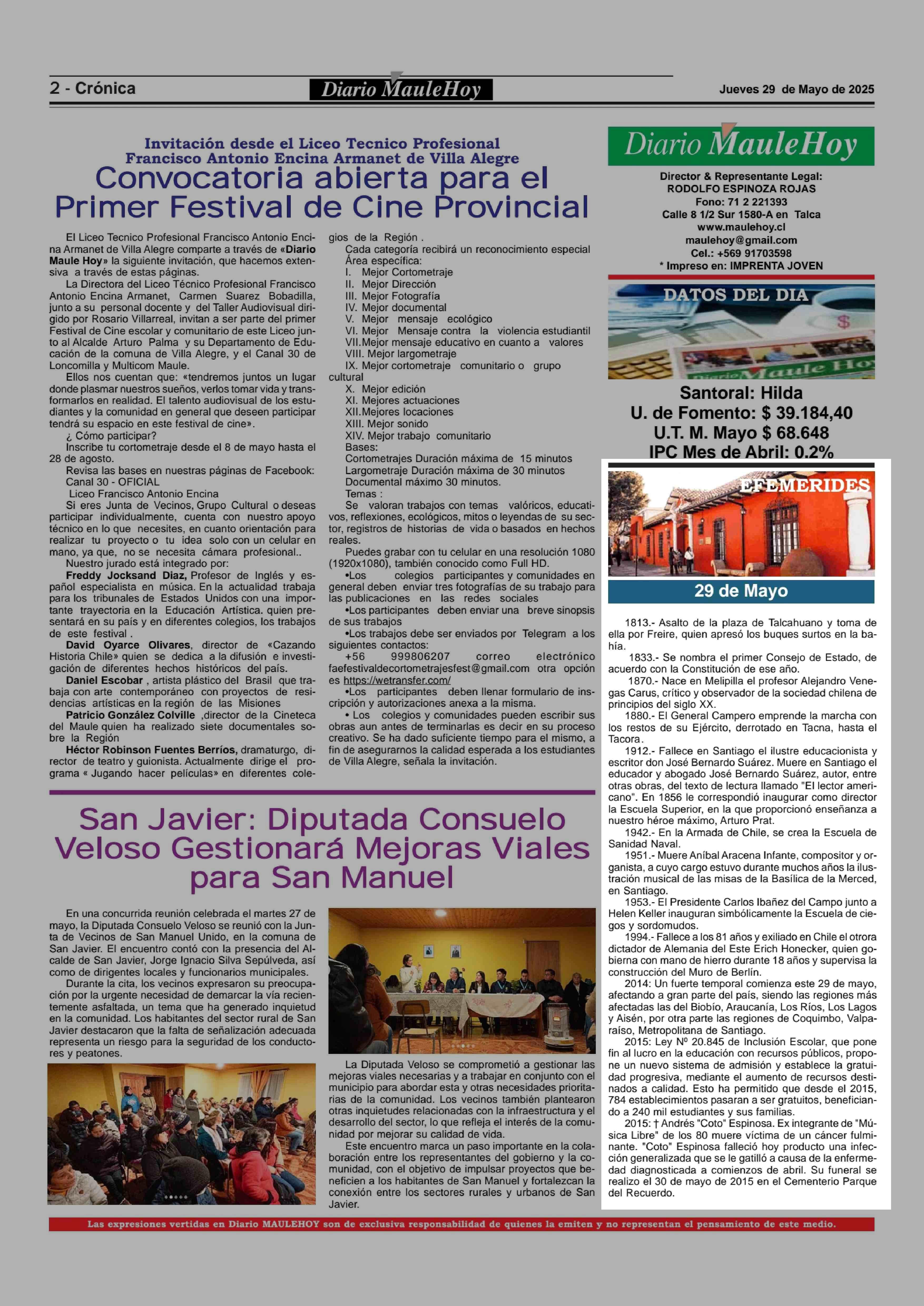 EFEMERIDES 29-05-2025 Maule Hoy |