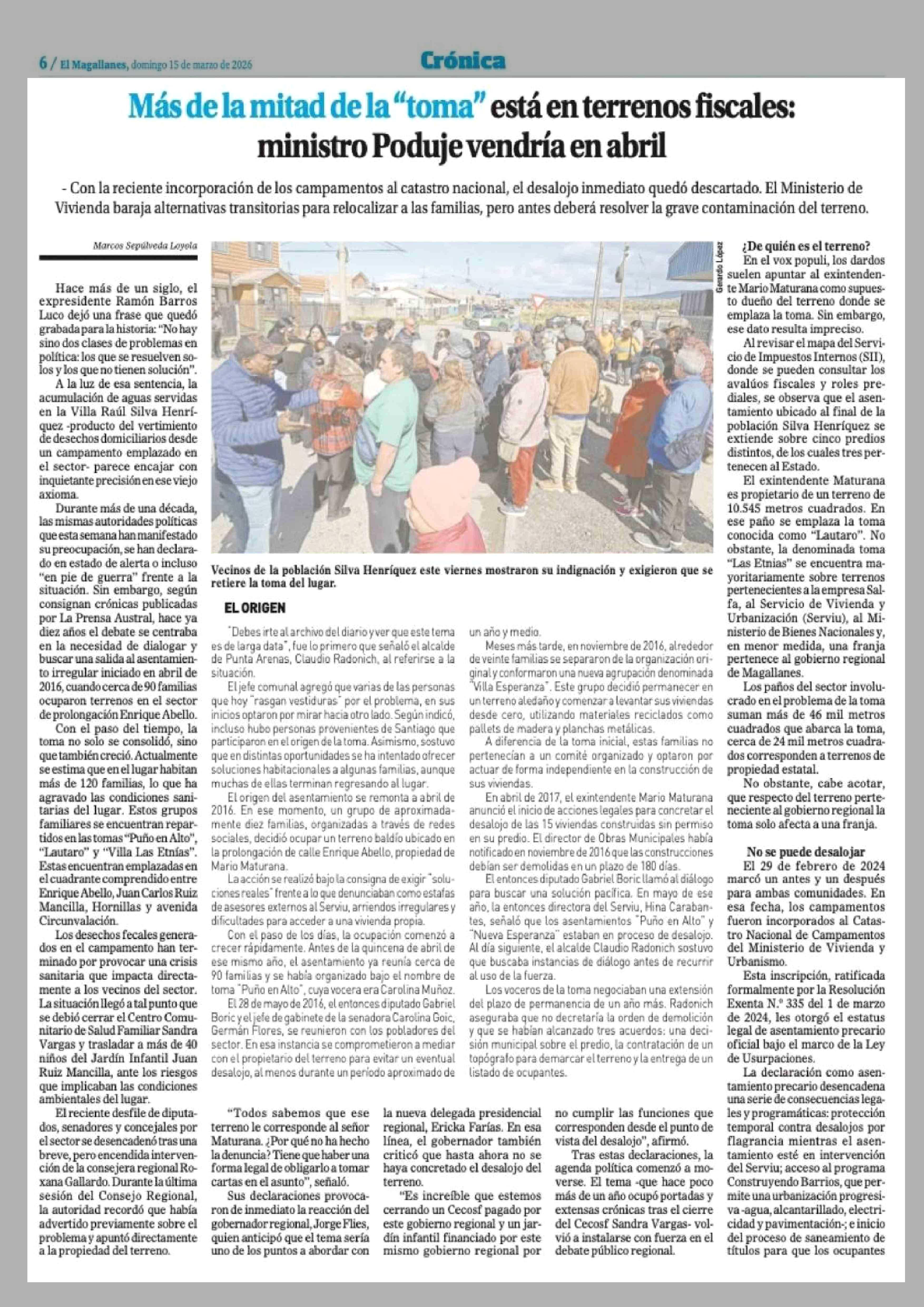 Título: Más de la mitad de la "toma" está en terrenos fiscales: ministro Poduje vendría en abril