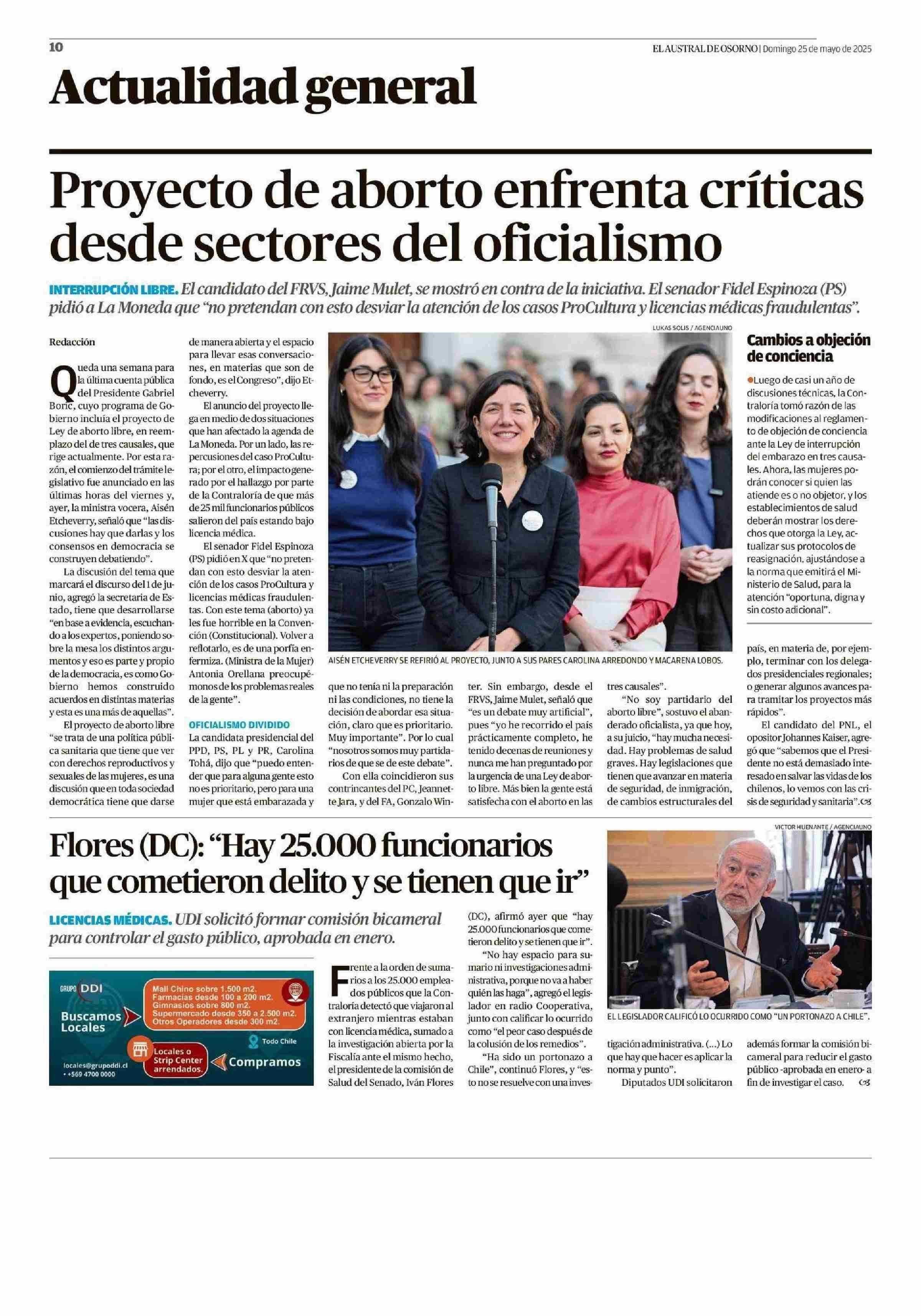 Proyecto de aborto enfrenta críticas desde sectores del oficialismo 25-05-2025 El Austral de Osorno |