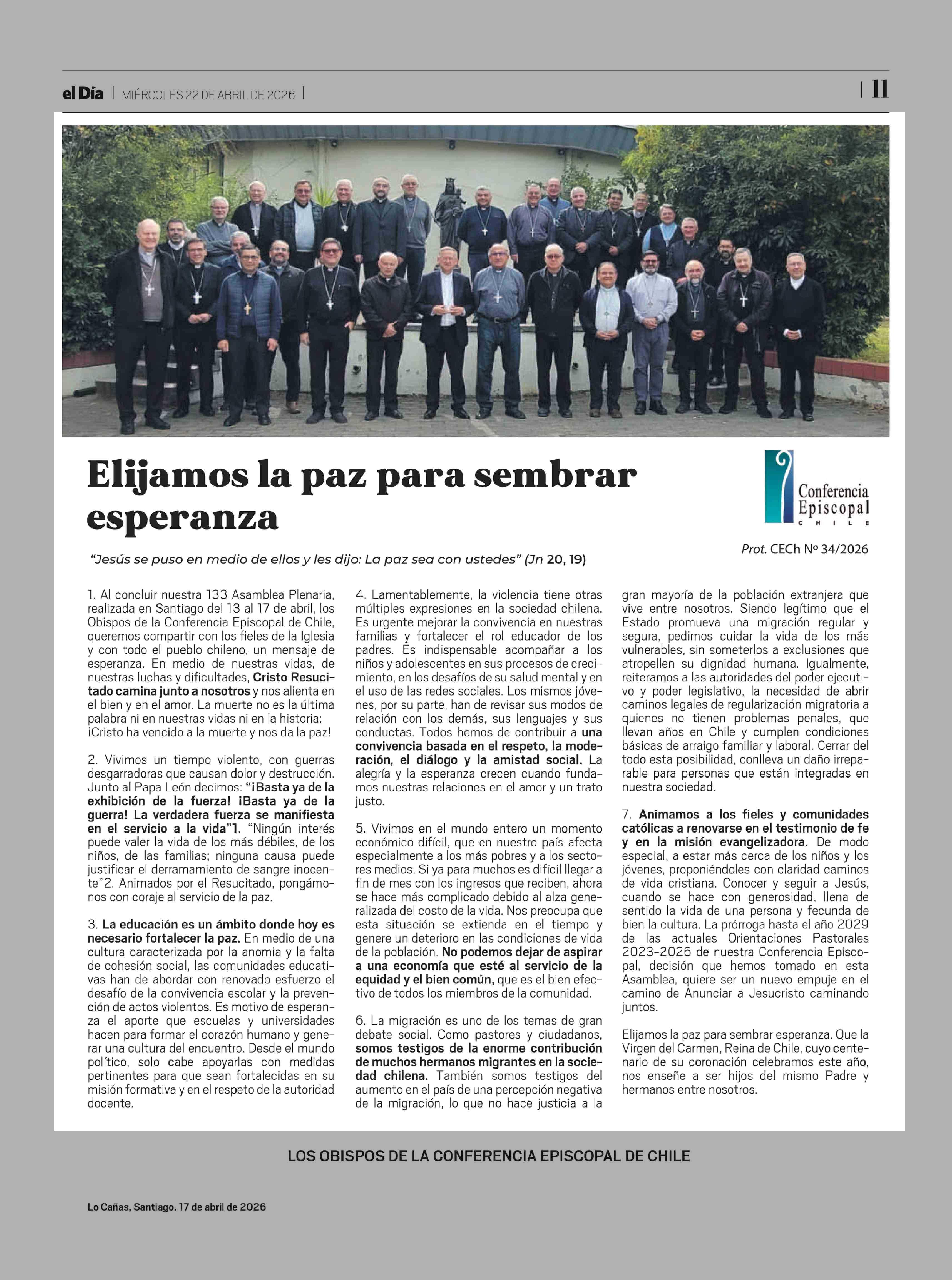 Elijamos la paz para sembrar esperanza 22-04-2026 El Día |