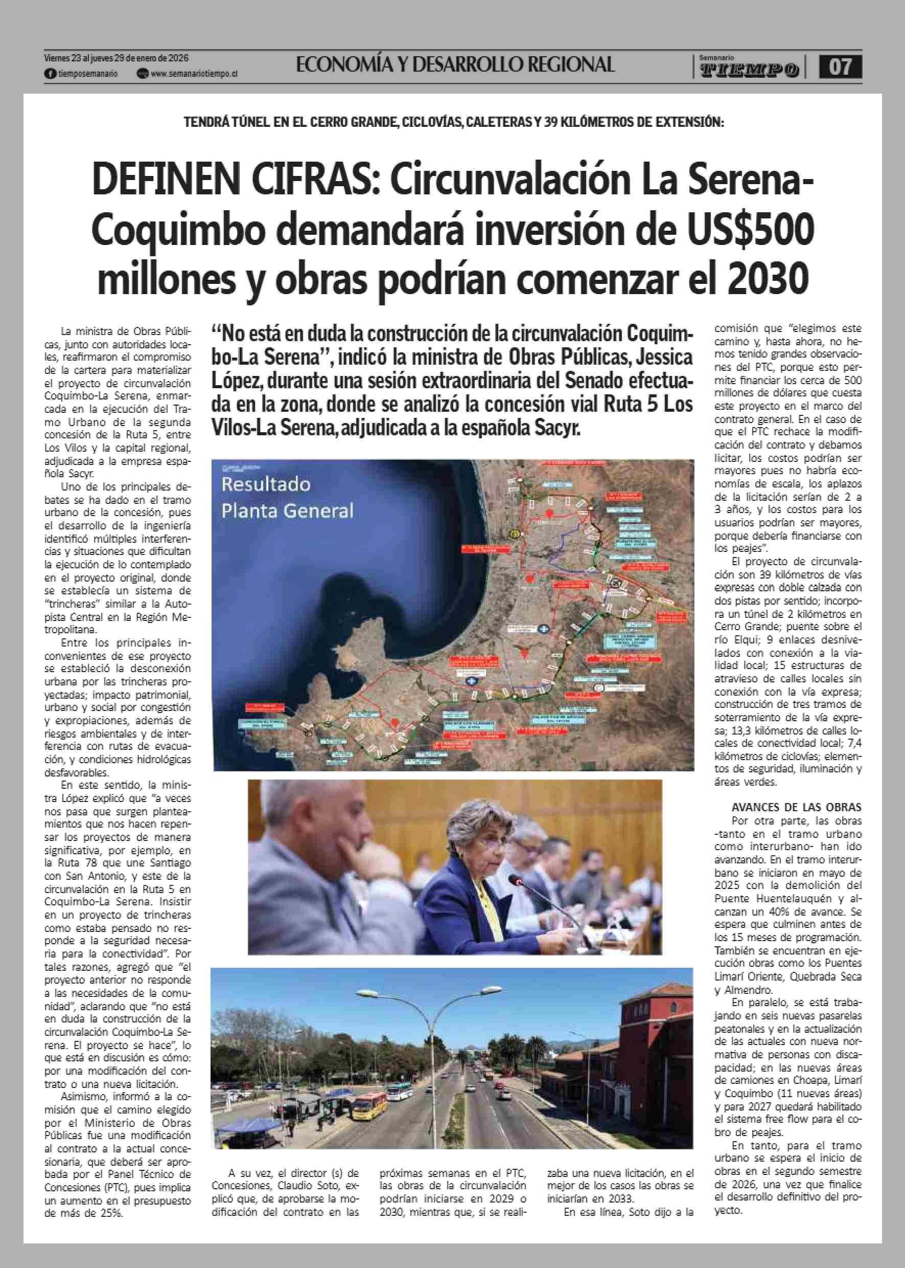 DEFINEN CIFRAS: Circunvalación La SerenaCoquimbo demandará inversión de US$500 millones y obras podrían comenzar el 2030 23-01-2026 Semanario Tiempo |