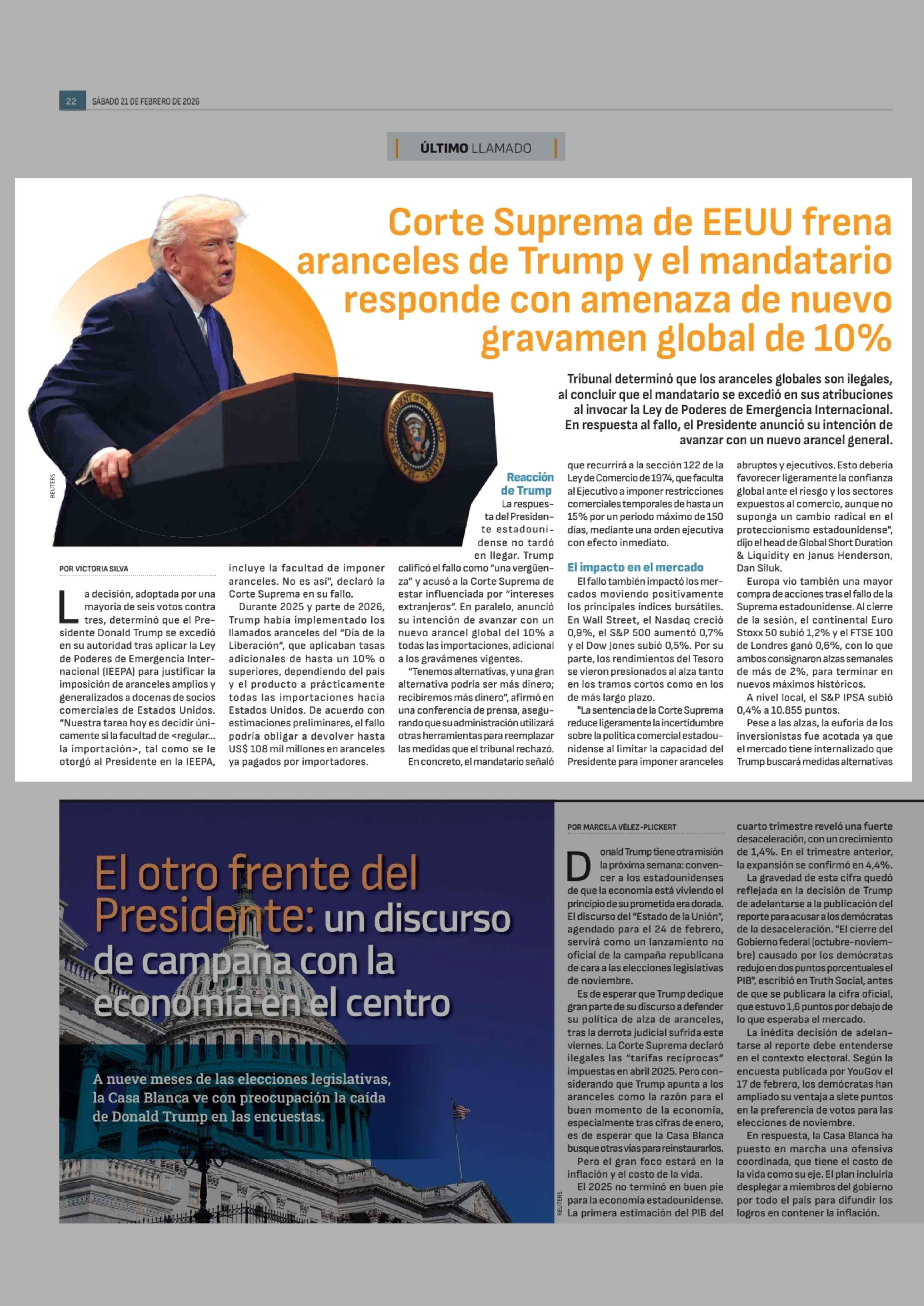 Corte Suprema de EEUU frena aranceles de Trump y el mandatario responde con amenaza de nuevo gravamen global de 10% 21-02-2026 Diario Financiero |
