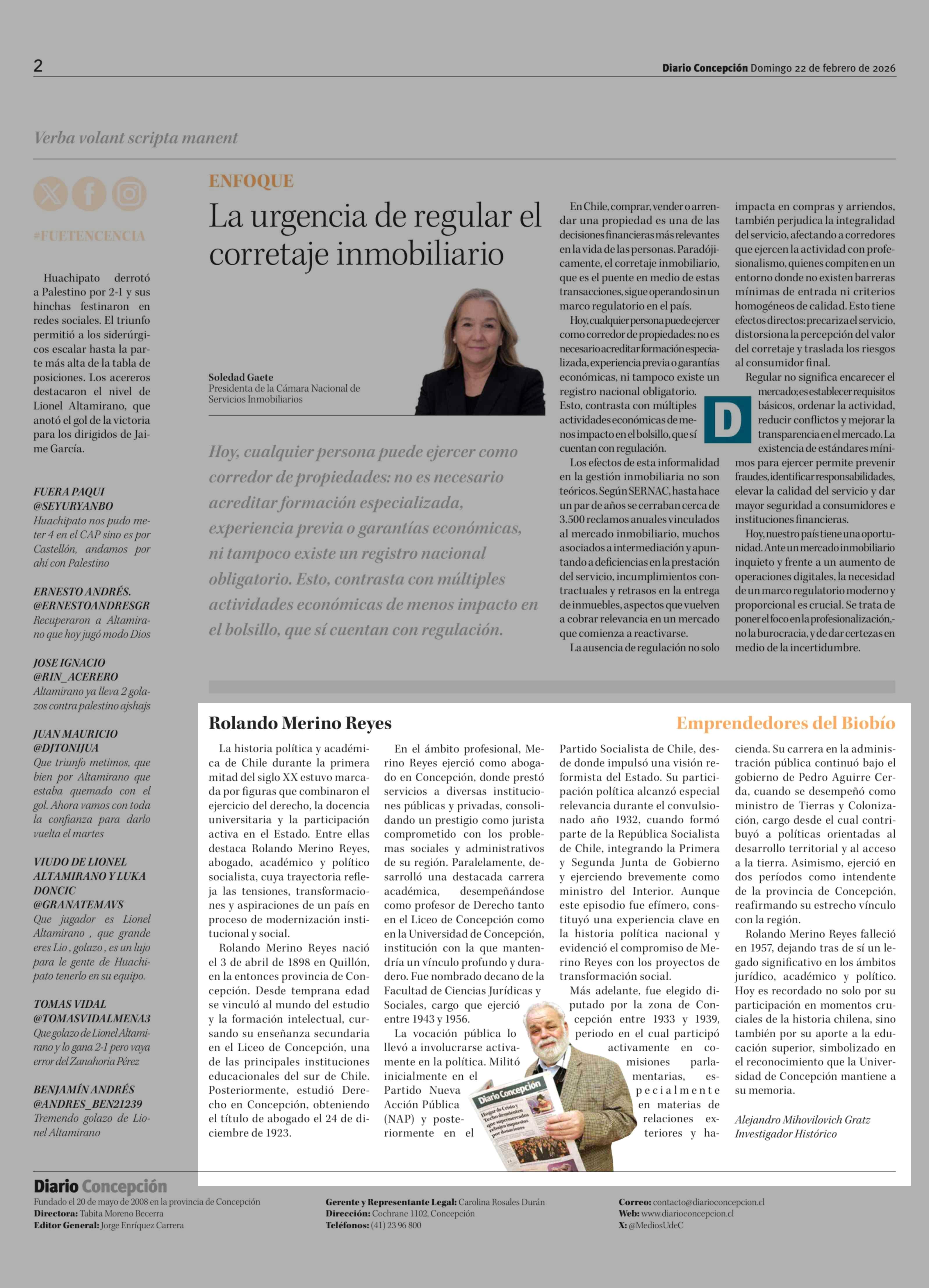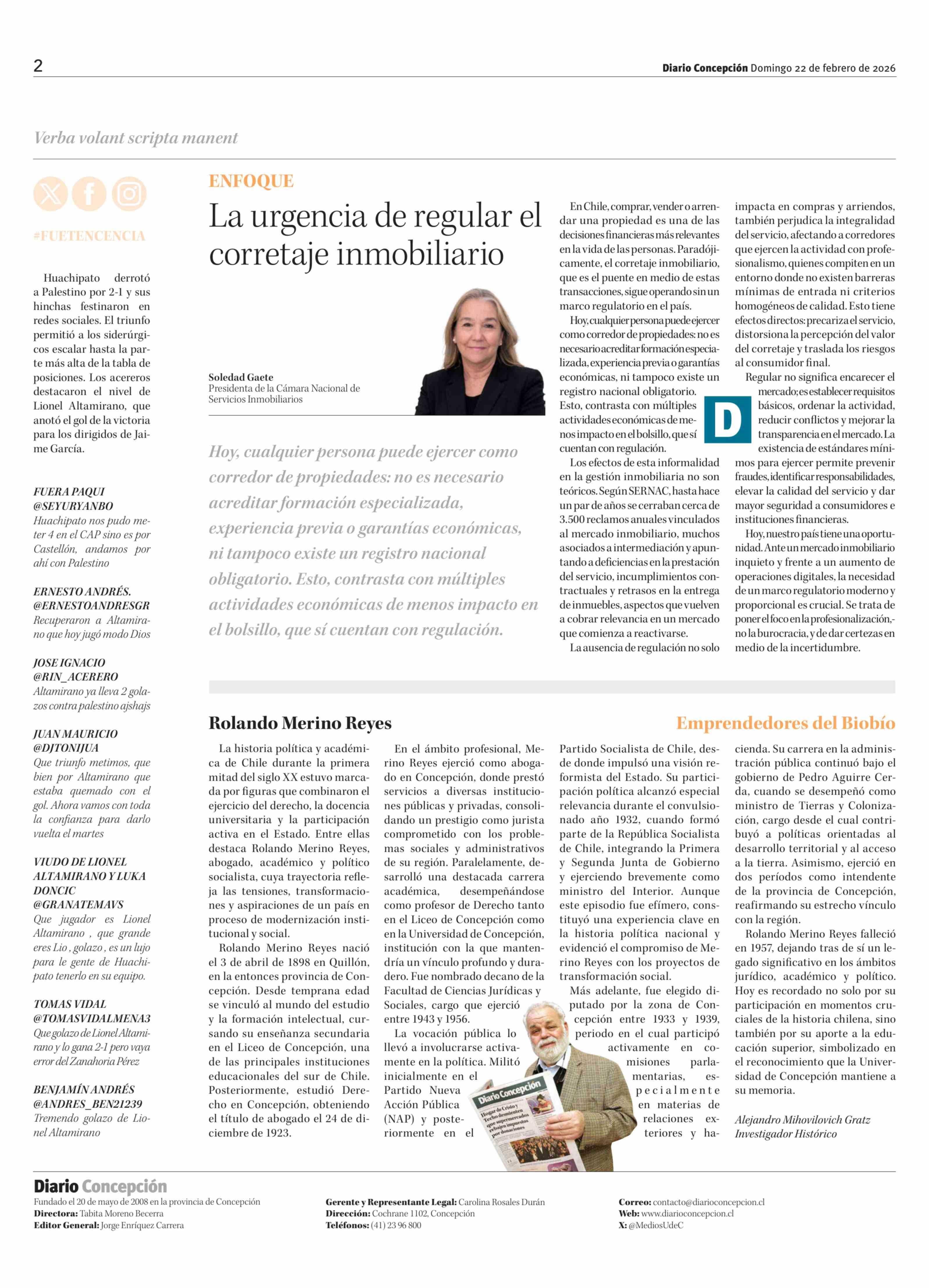 Columnas de Opinión: Rolando Merino Reyes 22-02-2026 Diario Concepción |
