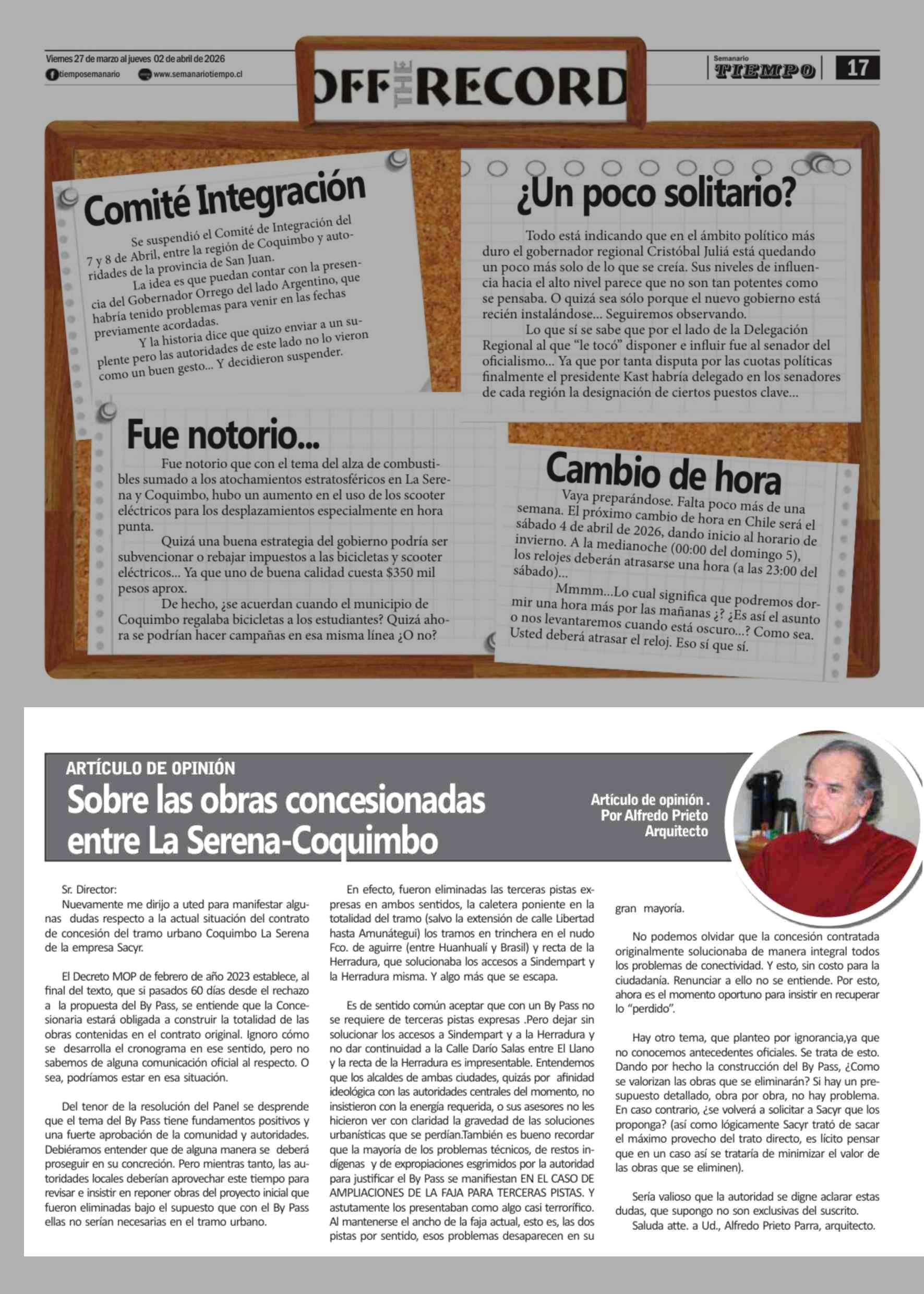 Columnas de Opinión: Sobre las obras concesionadas entre La Serena-Coquimbo 27-03-2026 Semanario Tiempo |