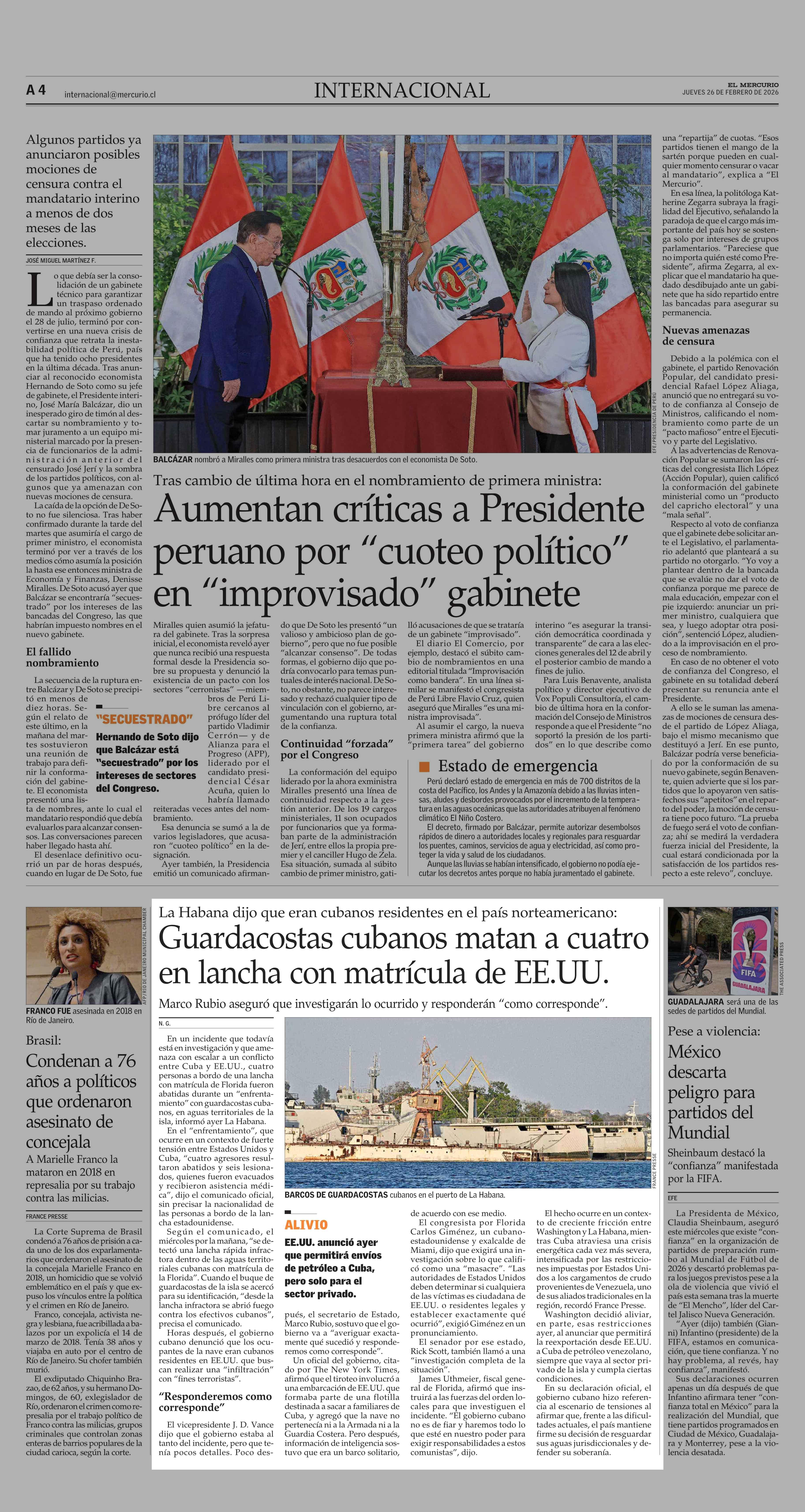 Guardacostas cubanos matan a cuatro en lancha con matrícula de EE.UU. 26-02-2026 El Mercurio |