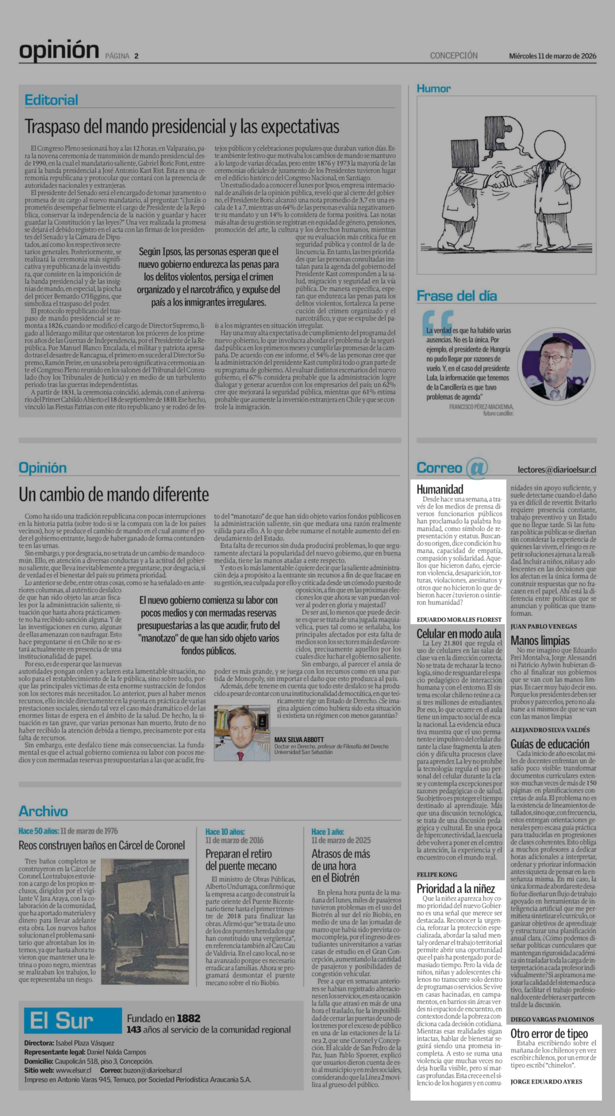 CARTAS: Prioridad a la niñez 11-03-2026 El Sur |