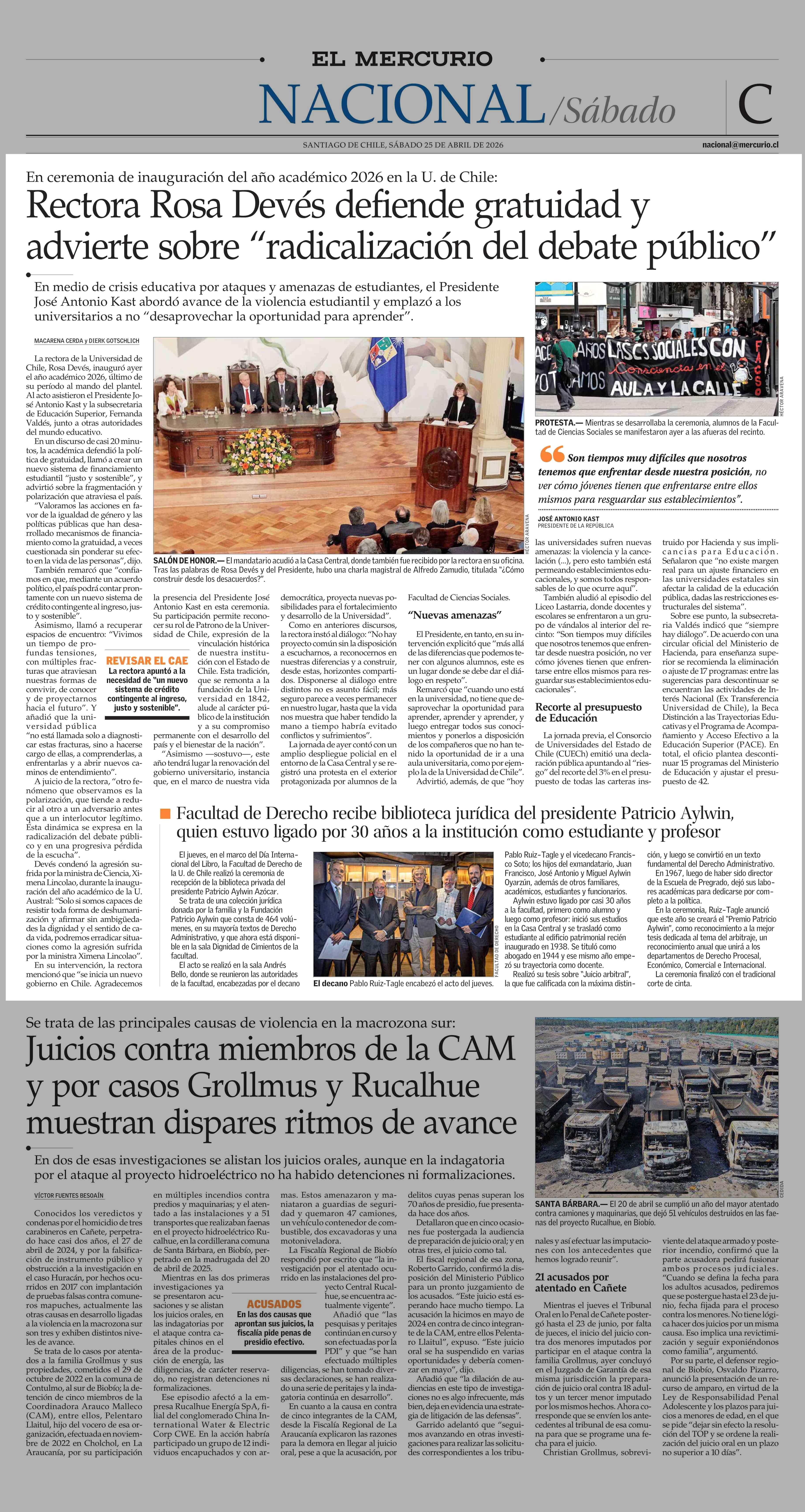 Rectora Rosa Devés defiende gratuidad y advierte sobre “radicalización del debate público” 25-04-2026 El Mercurio |