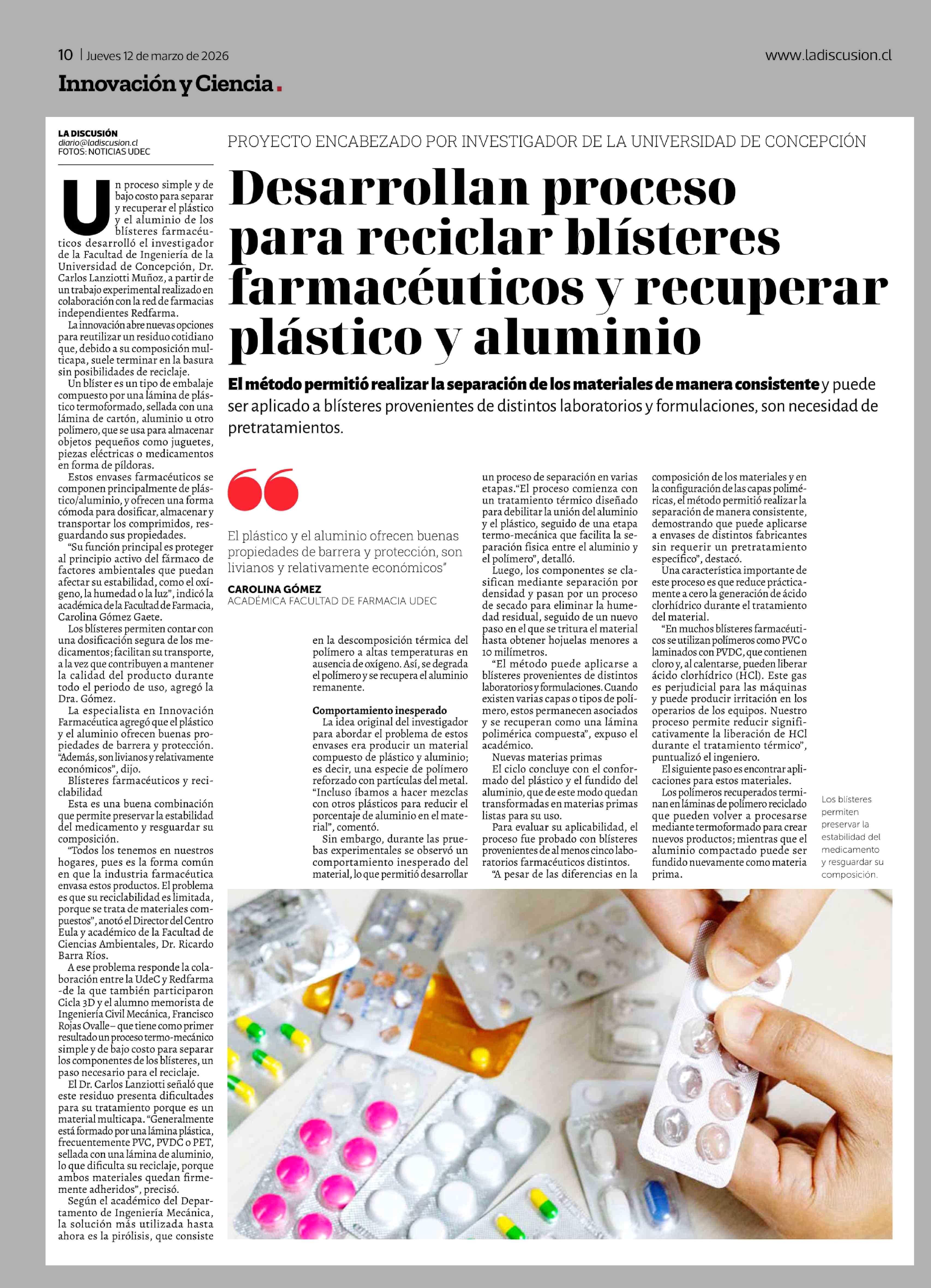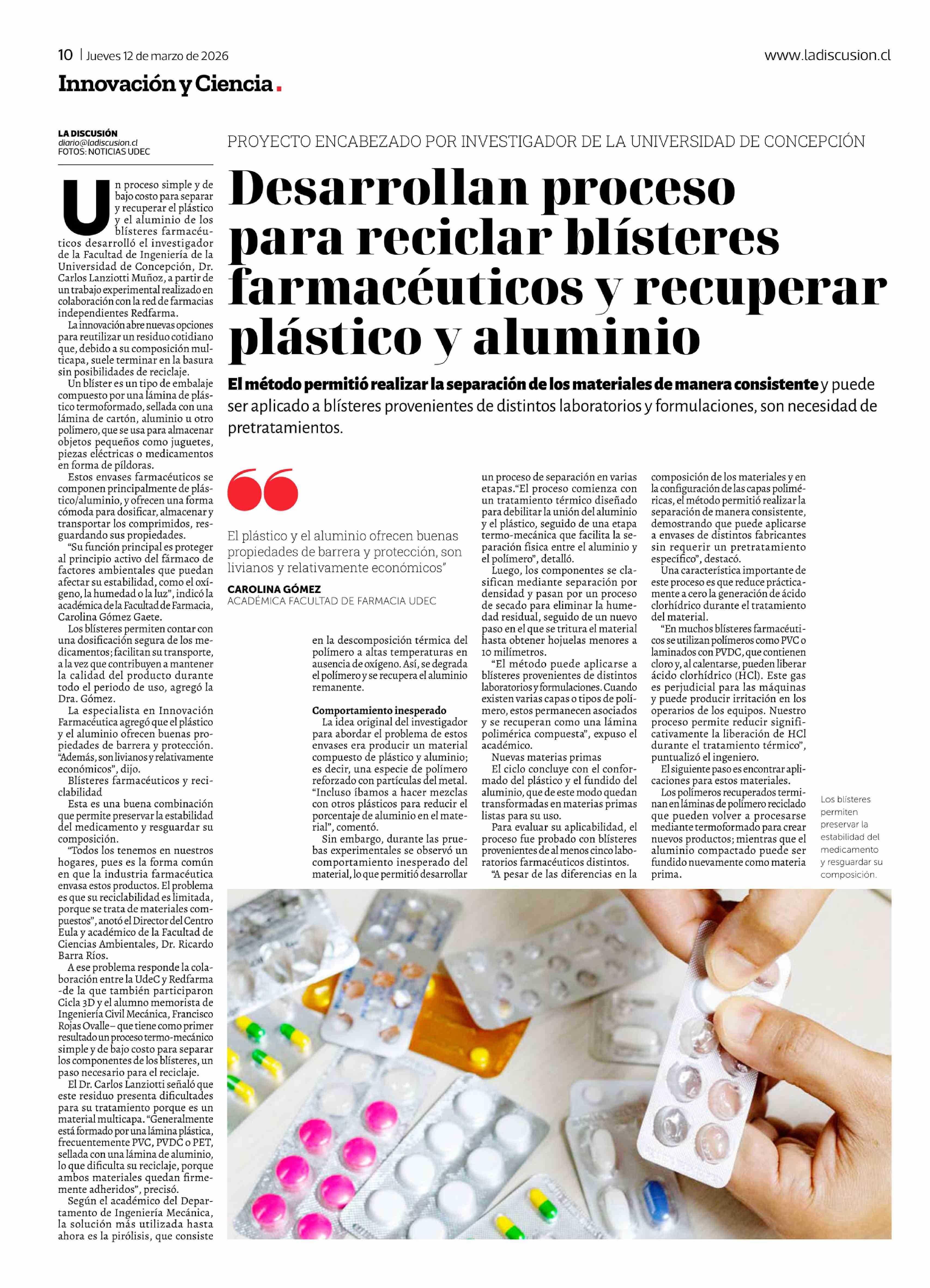 Desarrollan proceso para reciclar blísteres farmacéuticos y recuperar plástico y aluminio 12-03-2026 La Discusión |