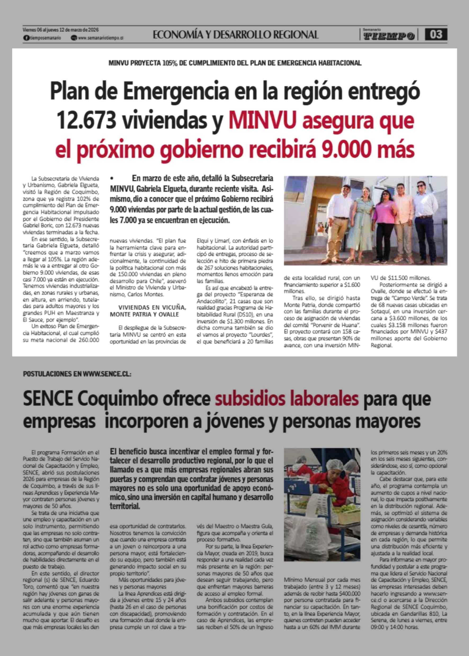 Plan de Emergencia en la región entregó 12.673 viviendas y MINVU asegura que el próximo gobierno recibirá 9.000 más 06-03-2026 Semanario Tiempo |