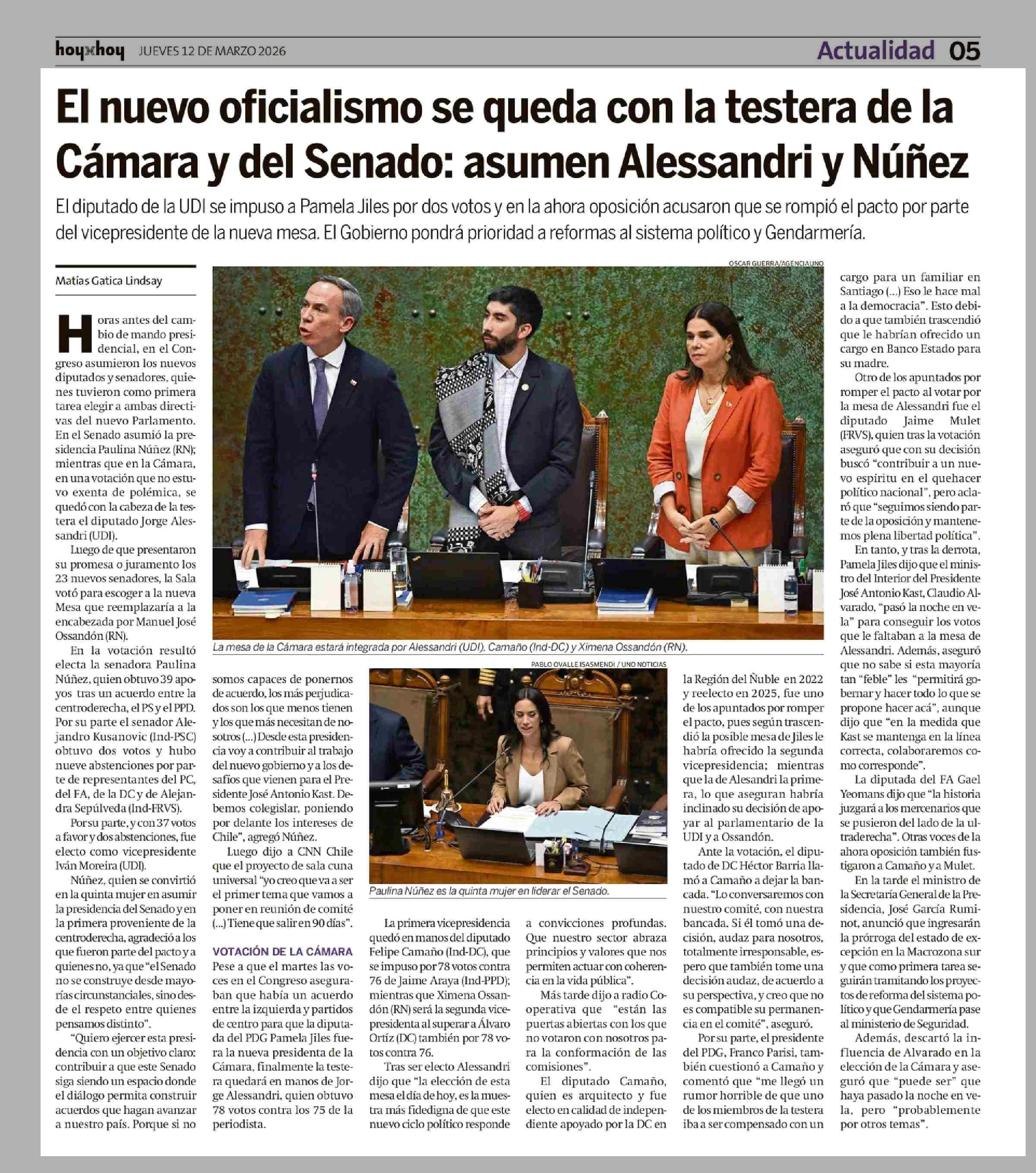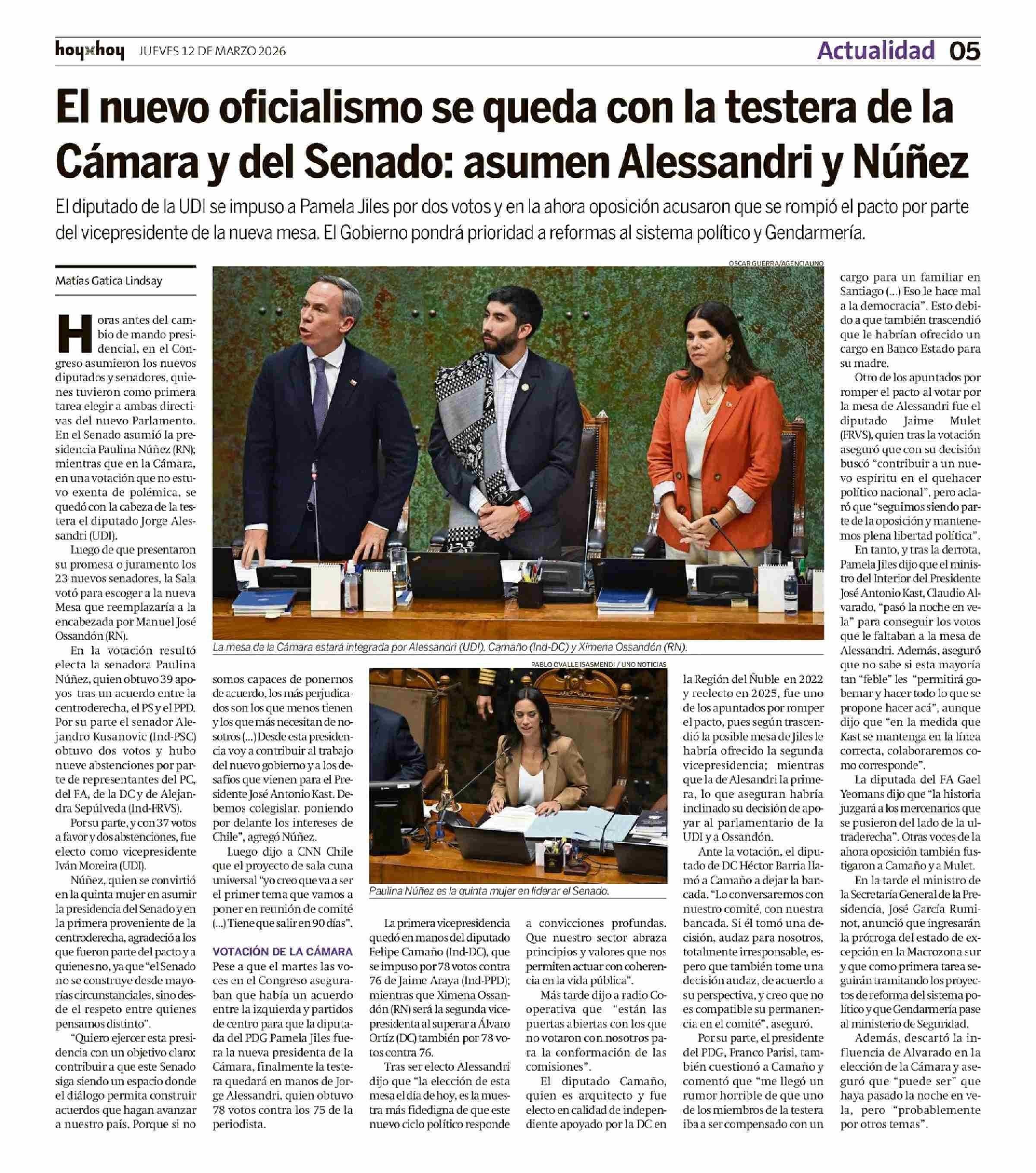 Título: El nuevo oficialismo se queda con la testera de la Cámara y del Senado: asumen Alessandri y Núñez